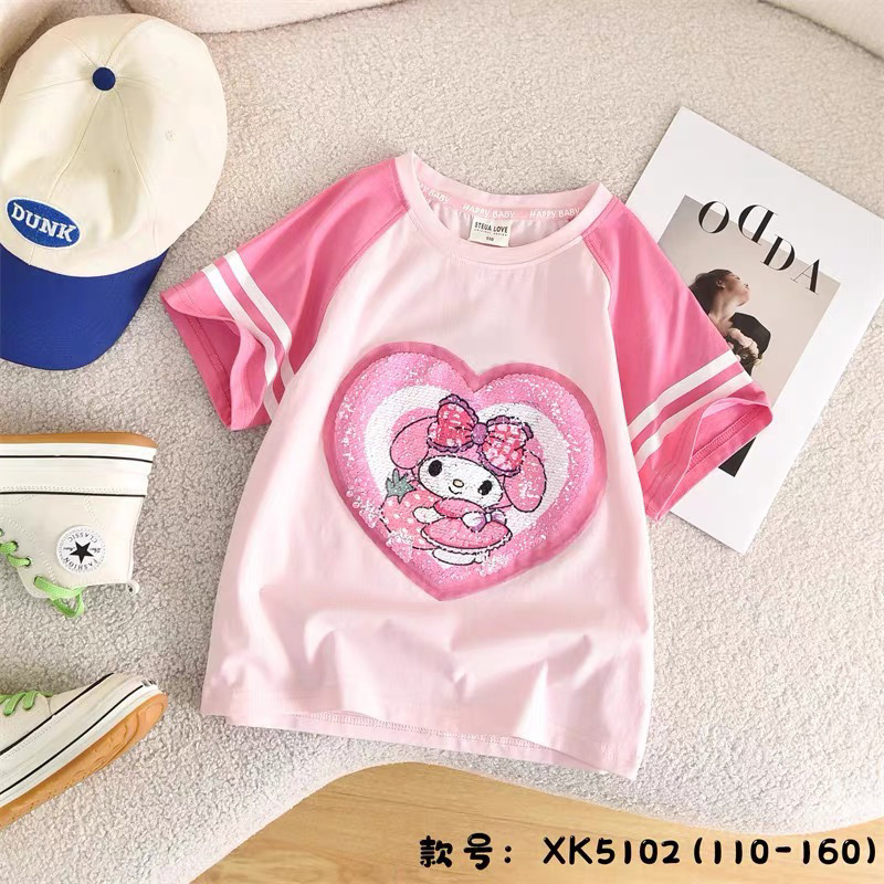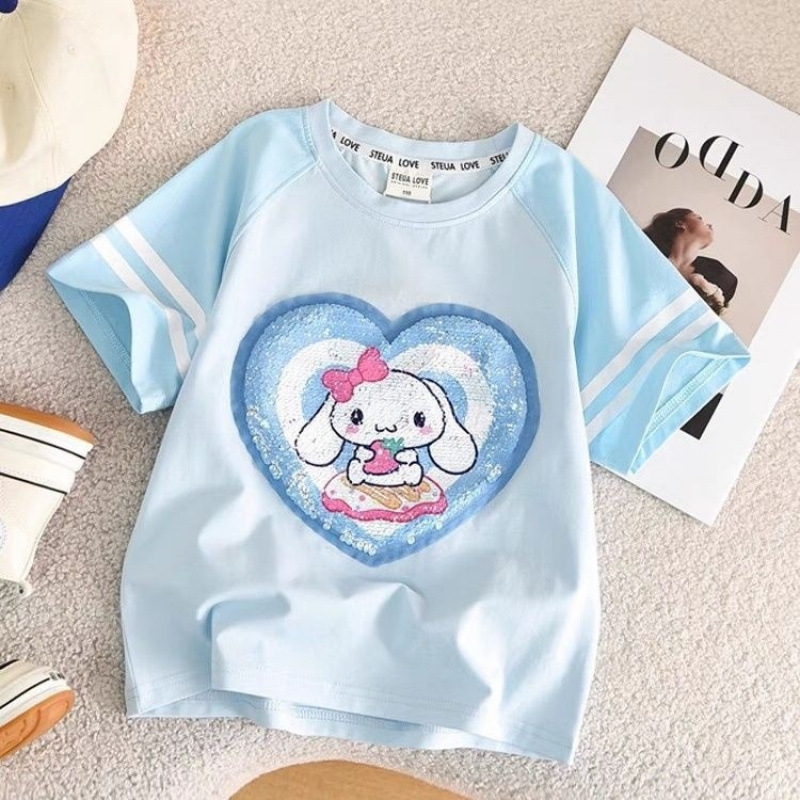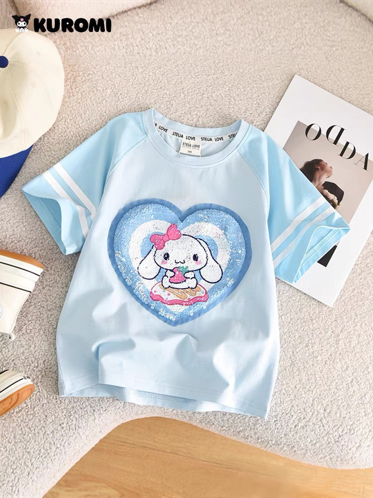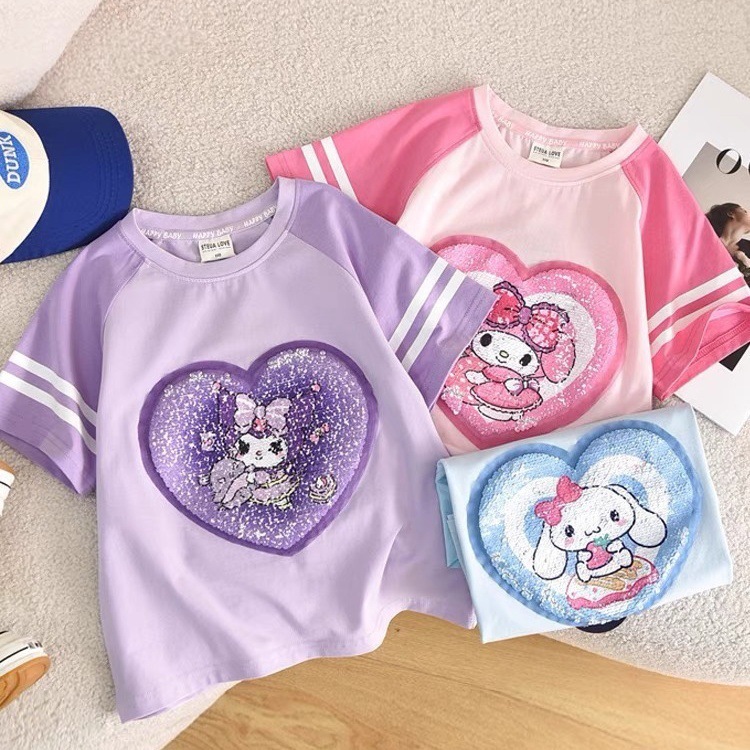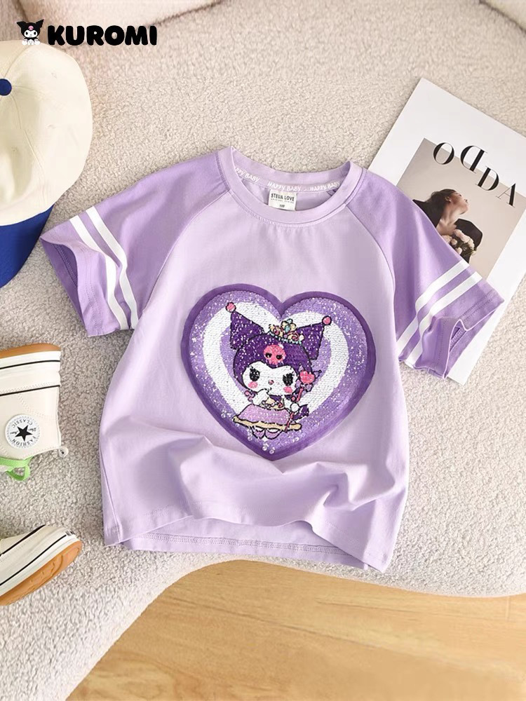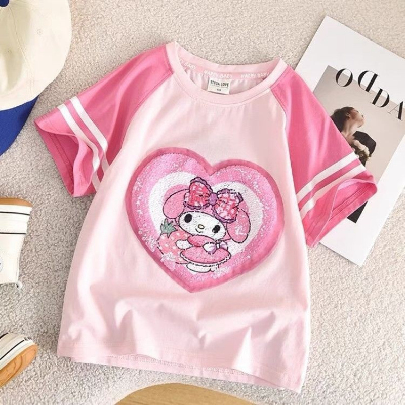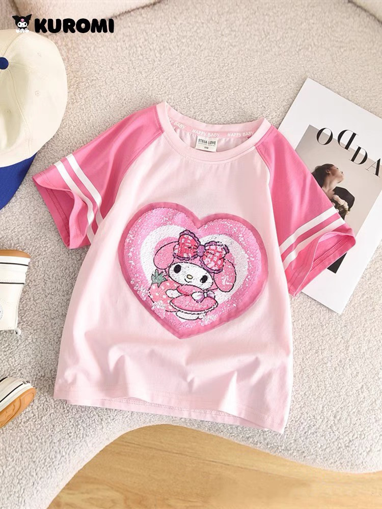 2025 새로운 여름 소녀 반팔 쿠로미 스팽글 얼굴 변화 어린이 만화 티셔츠 멜로디 천 패치 티셔츠스토어 가기