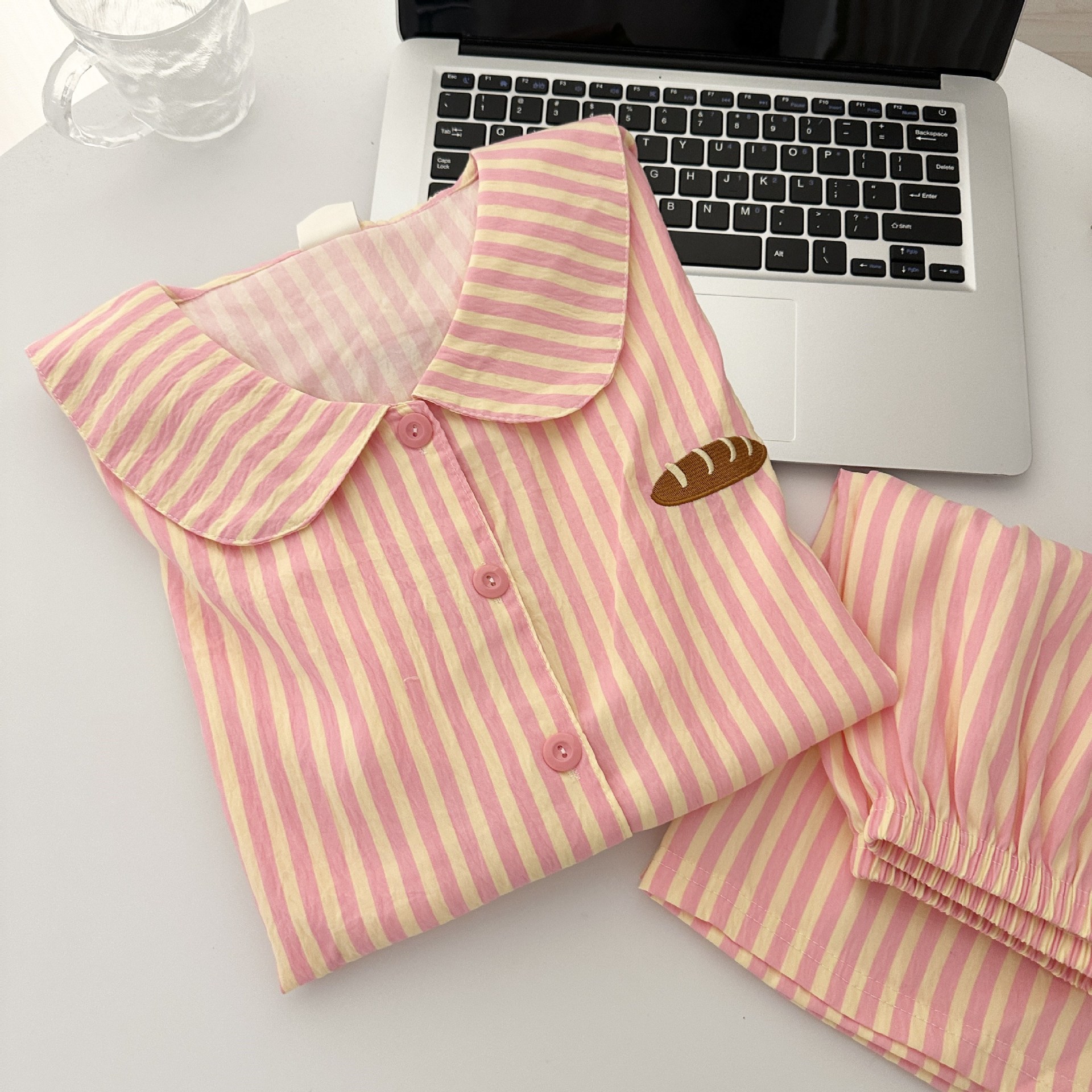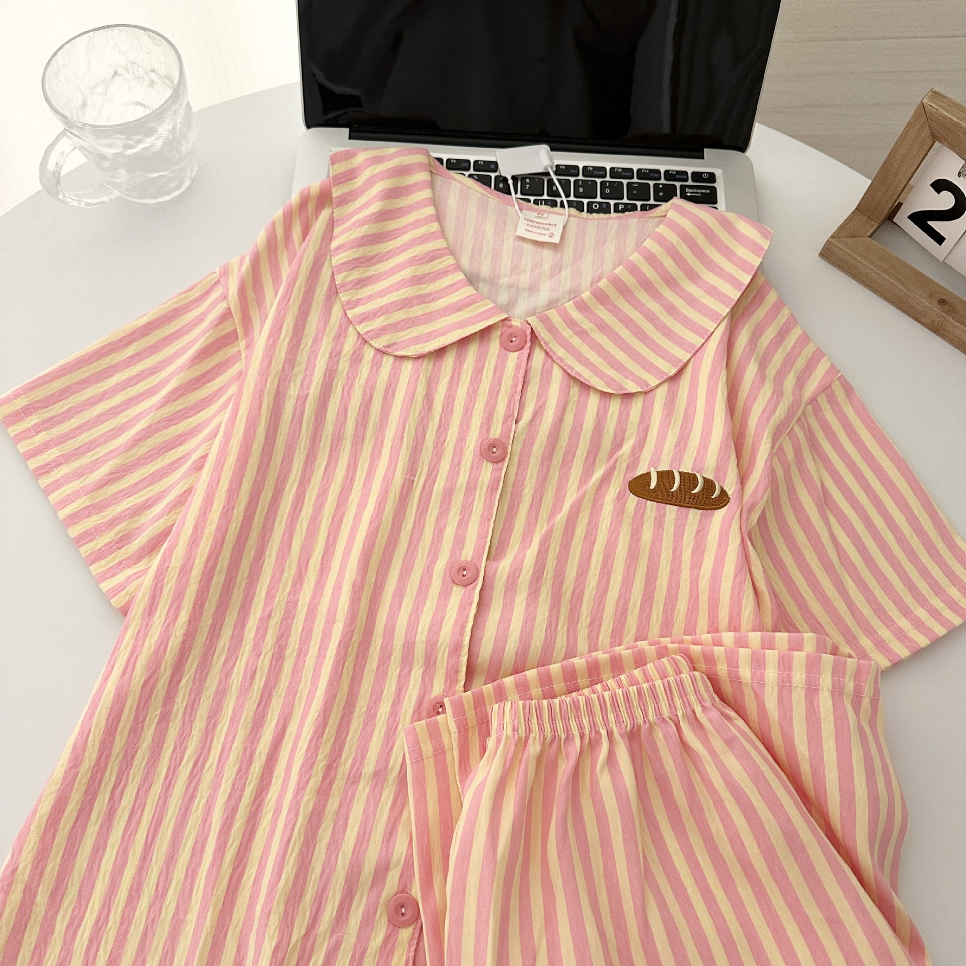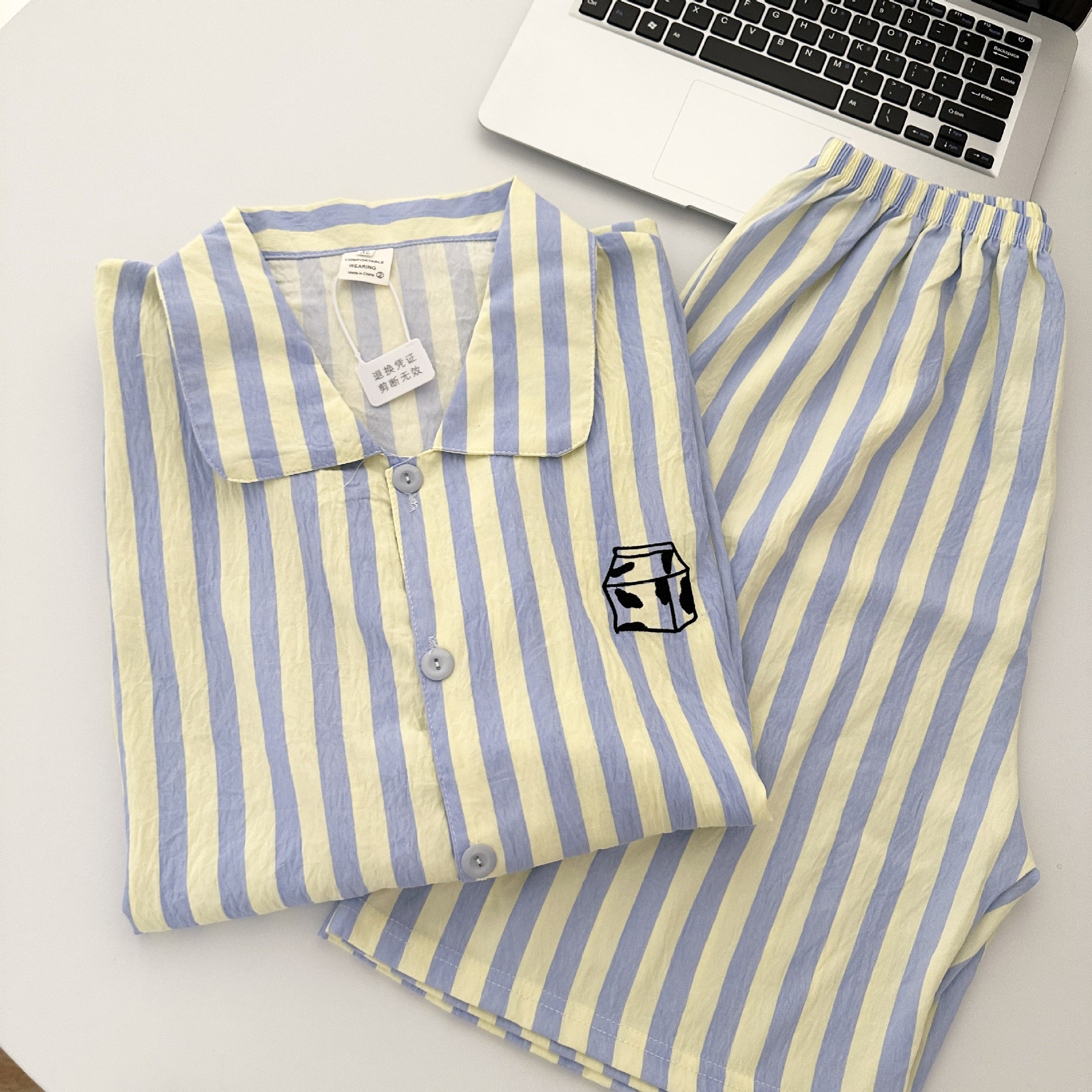 줄무늬 커플 잠옷 면 원사 짧은 소매 새로운 스타일 2025 여름 우유 빵 수 놓은 소년과 소녀 홈 옷 세트스토어 가기
