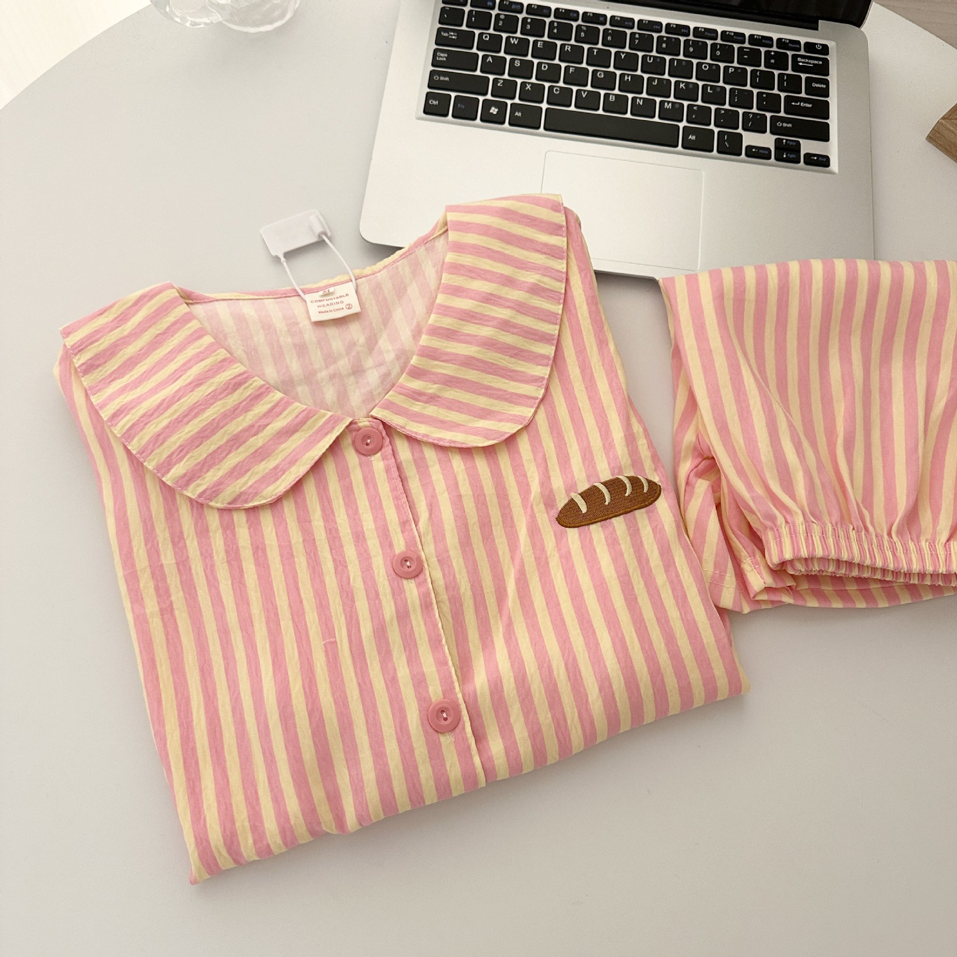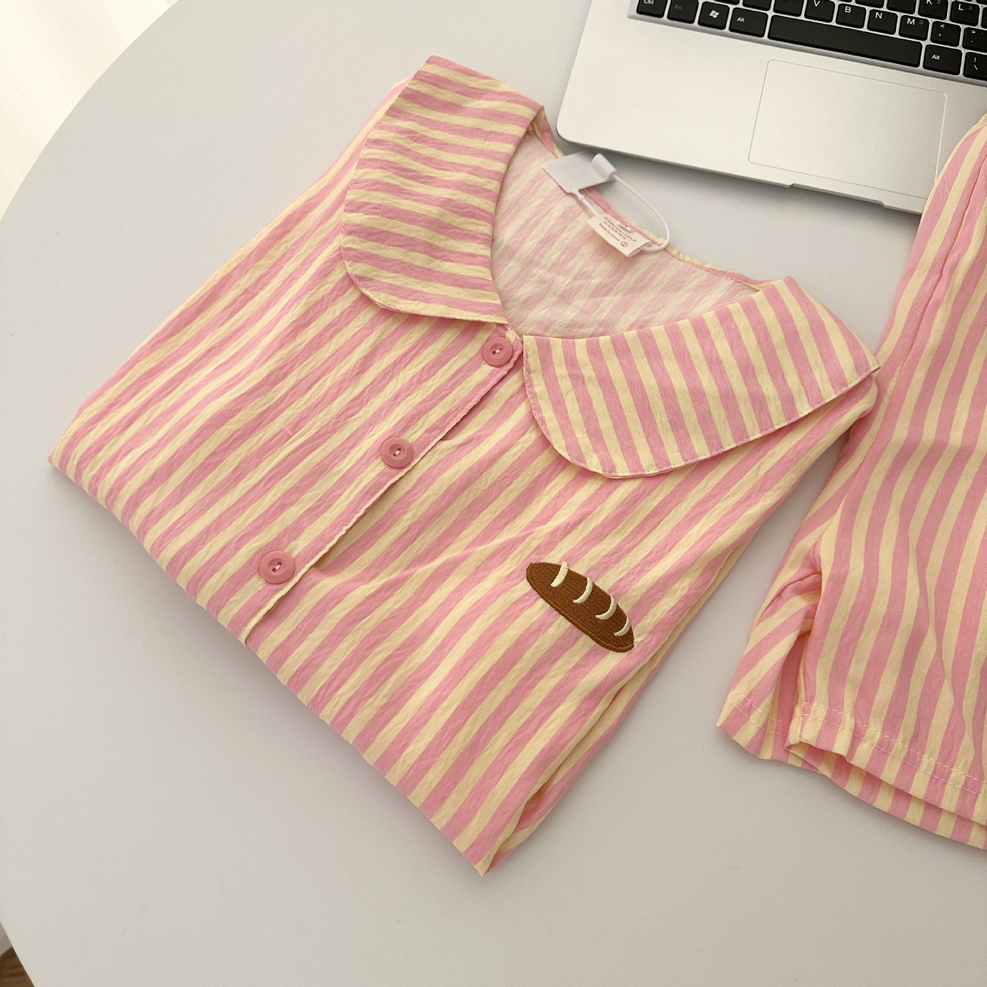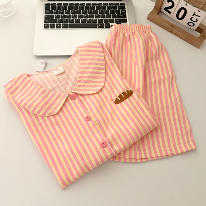 줄무늬 커플 잠옷 면 원사 짧은 소매 새로운 스타일 2025 여름 우유 빵 수 놓은 소년과 소녀 홈 옷 세트스토어 가기