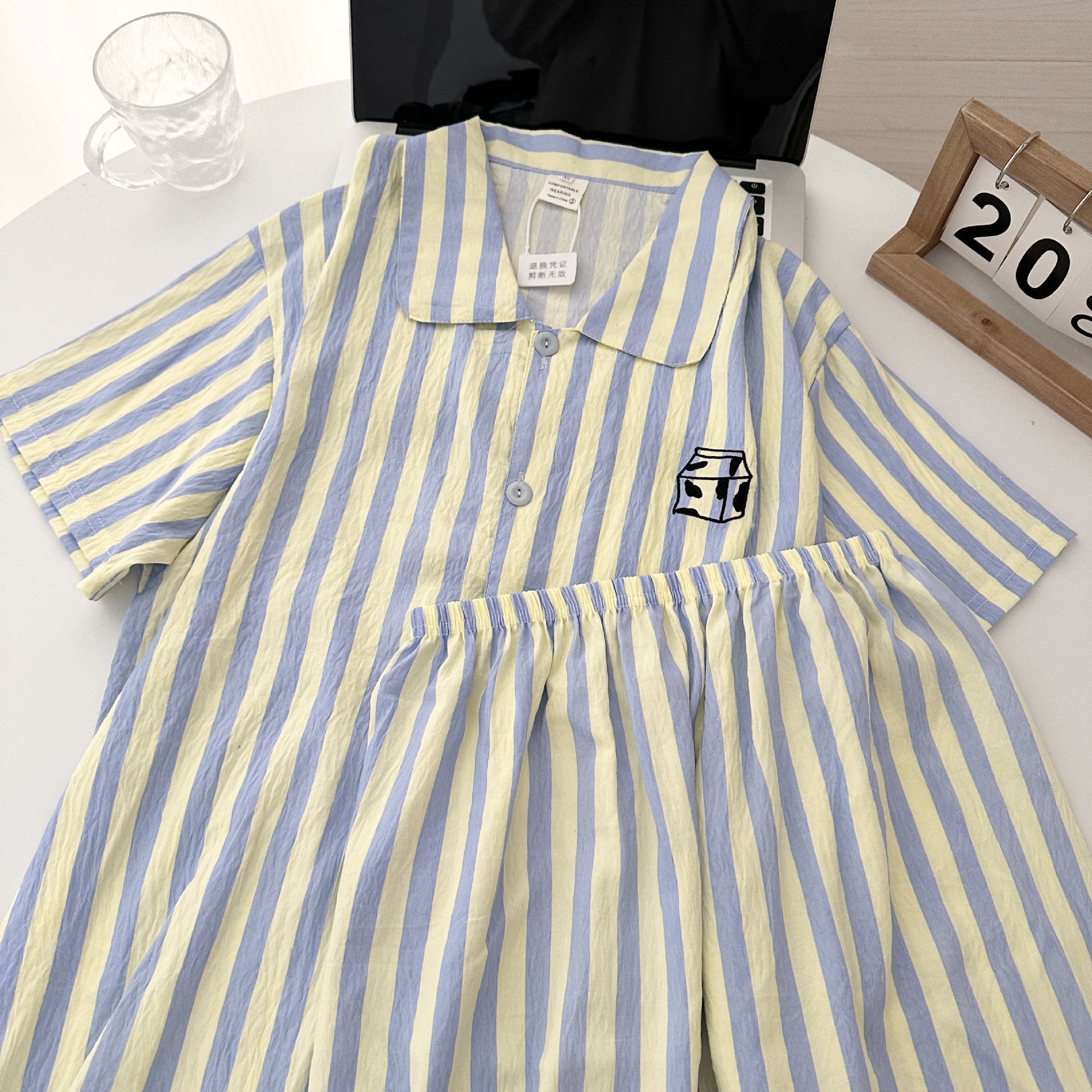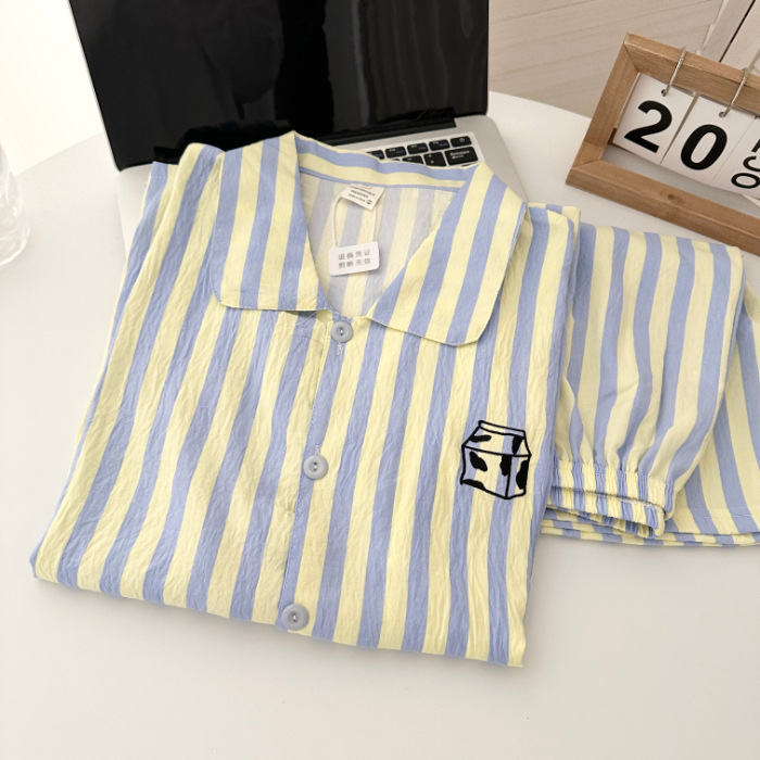 줄무늬 커플 잠옷 면 원사 짧은 소매 새로운 스타일 2025 여름 우유 빵 수 놓은 소년과 소녀 홈 옷 세트