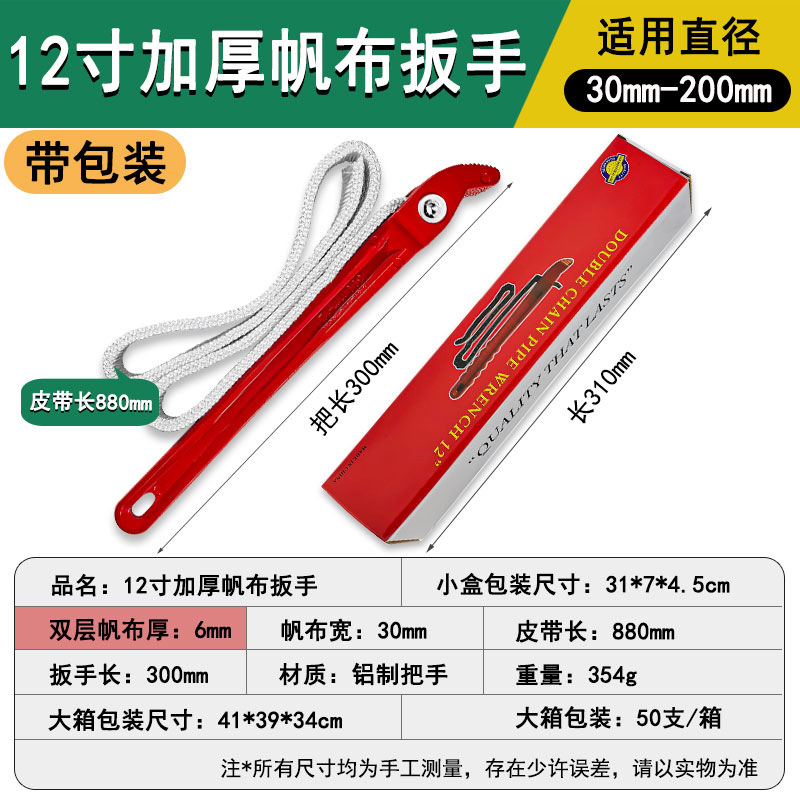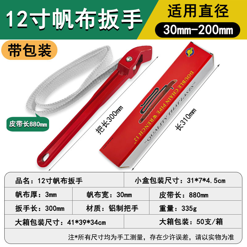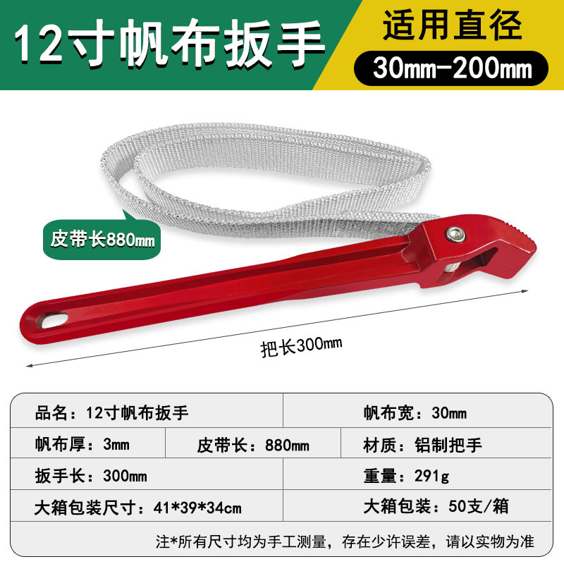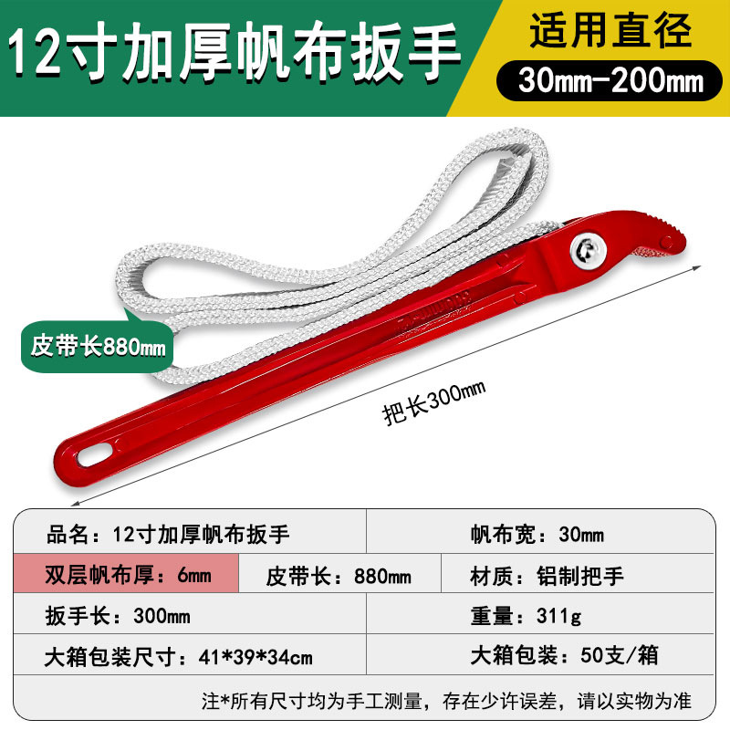适用直径:30mm-200mm;帆布宽:30mm;双层帆布厚:6mm;帆布长:880mm;材质:铝制手柄;扳手长:300mm;重量:311g。