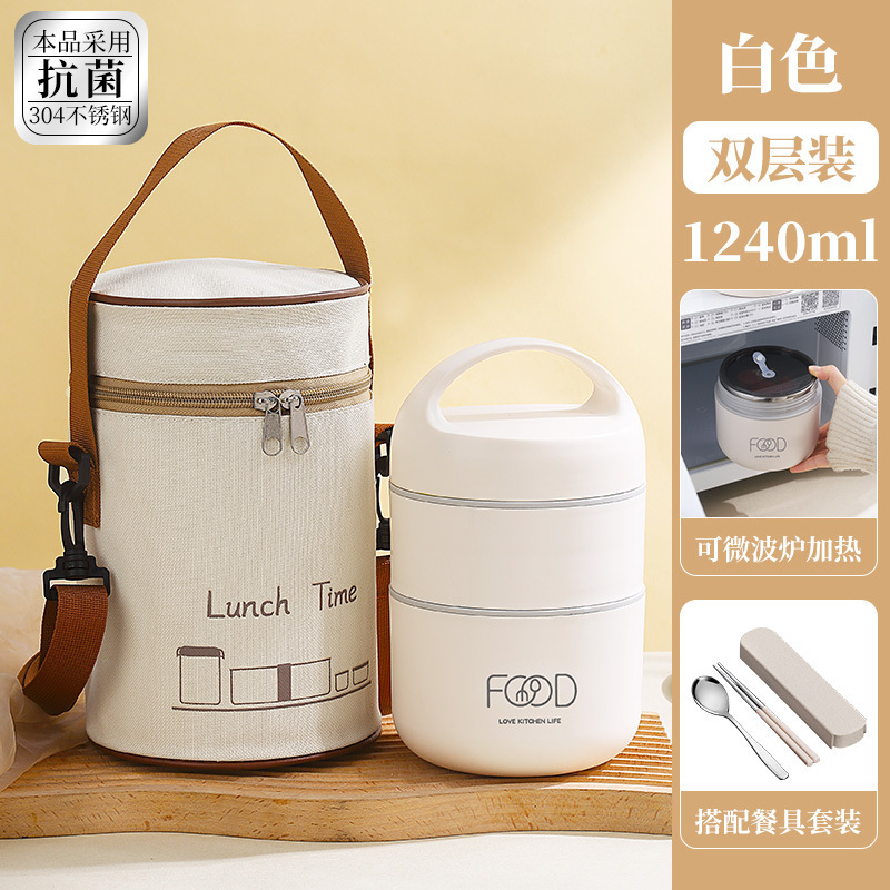 • [304 손잡이 도시락] 화이트 더블 레이어 + 식기 + 일본식 보온 가방.