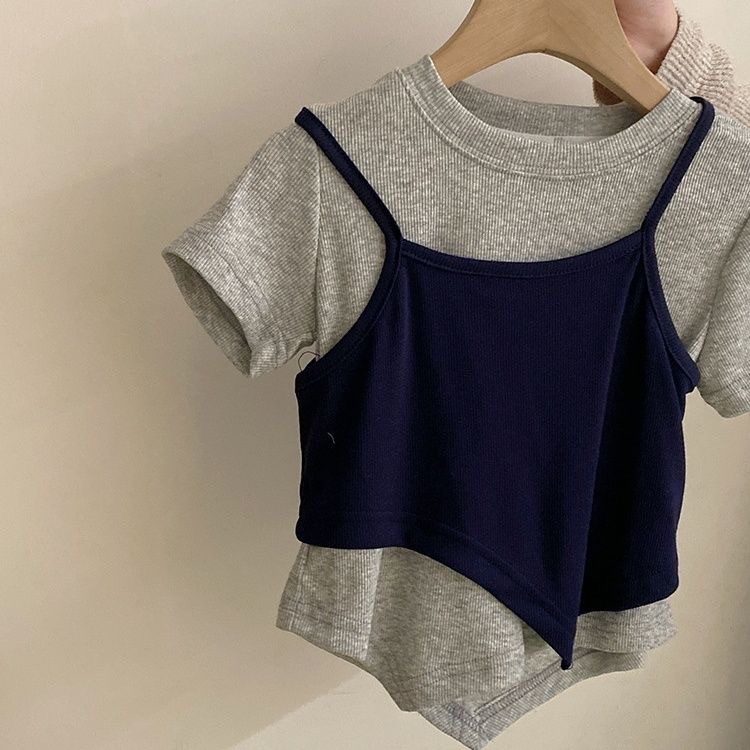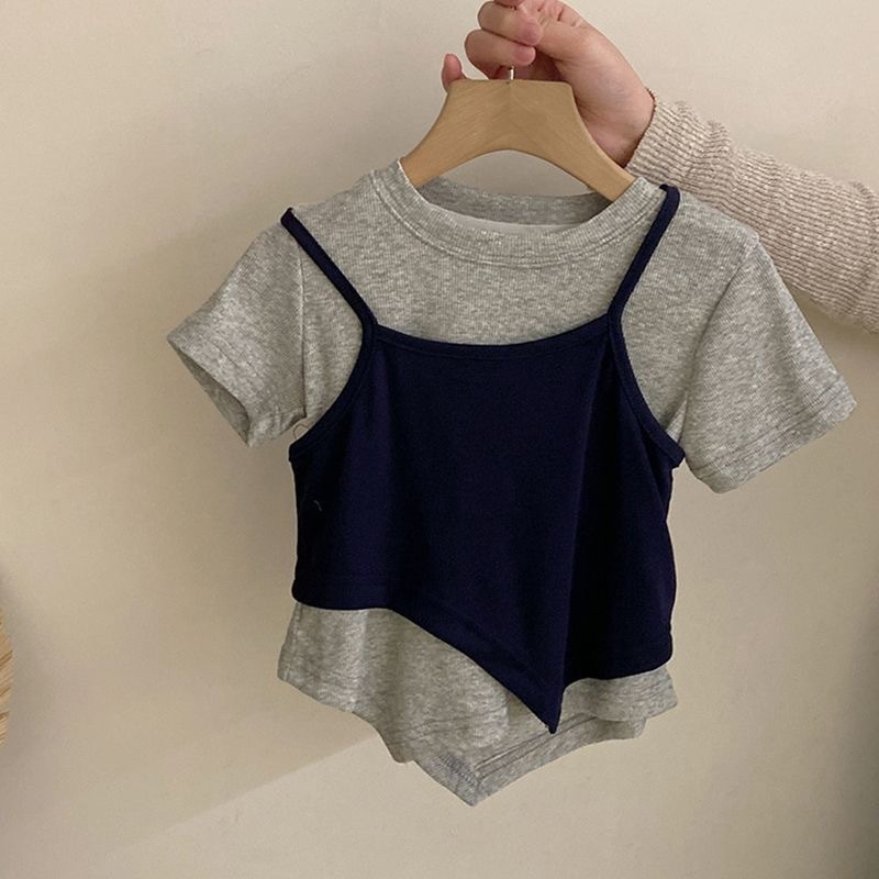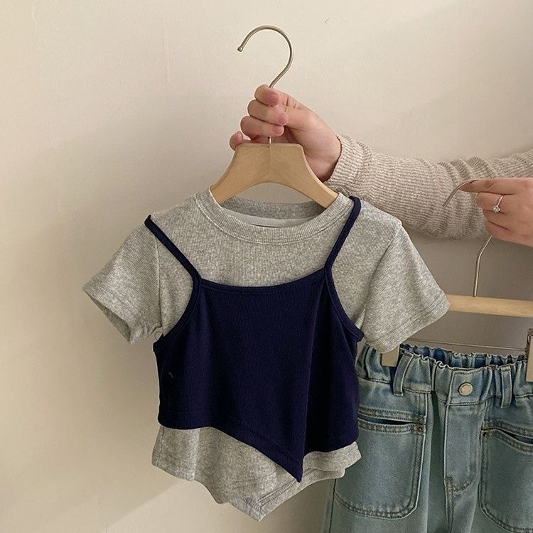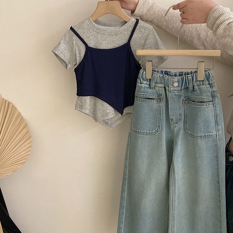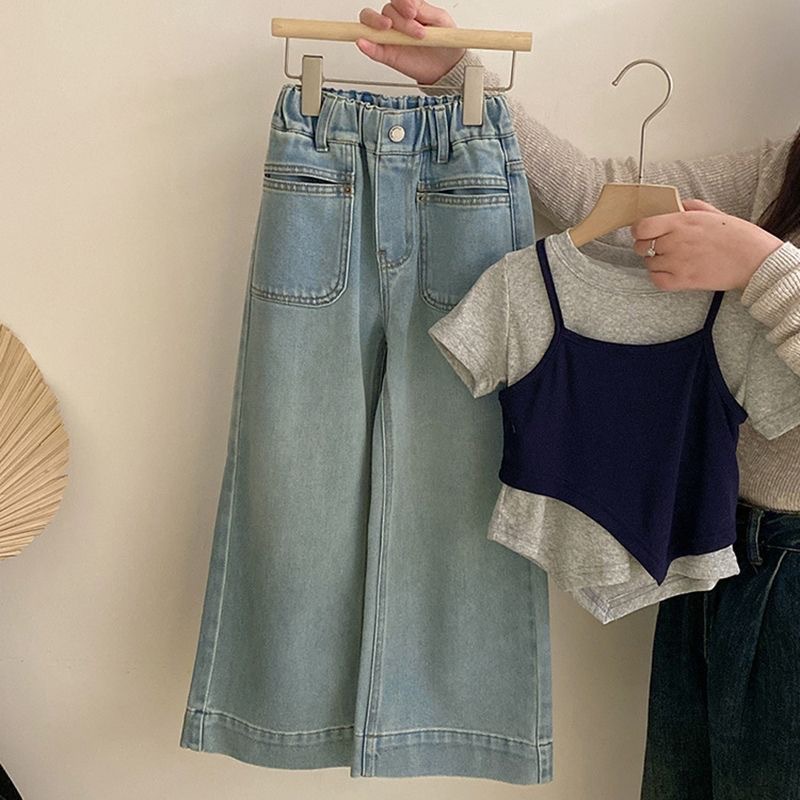 한국 아동복 소녀 세트 2025 어린이 유행 가짜 투피스 탑 세련된 소녀의 넓은 다리 바지 청바지
