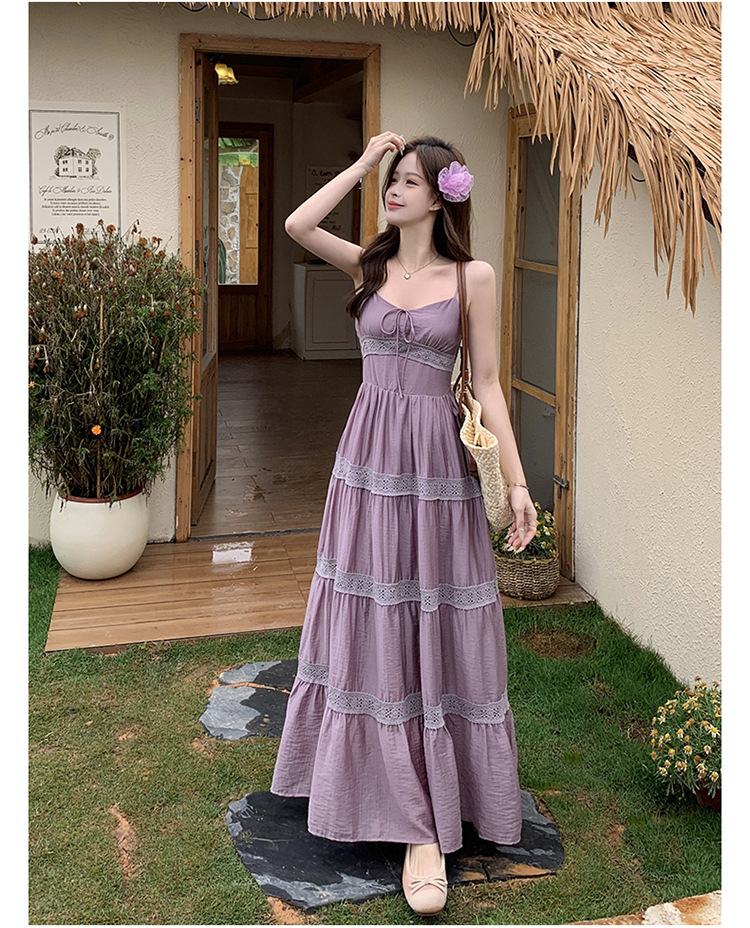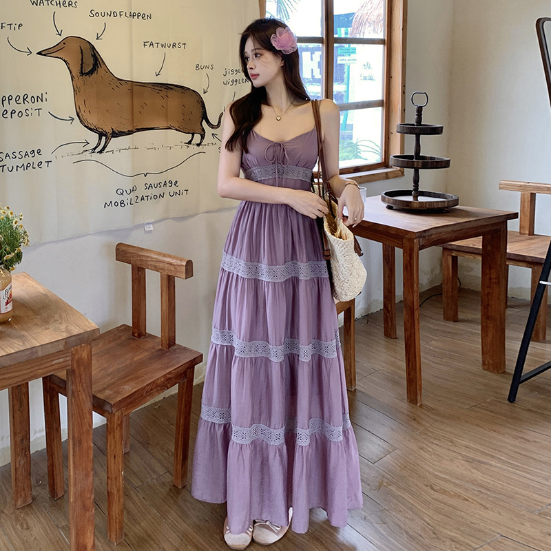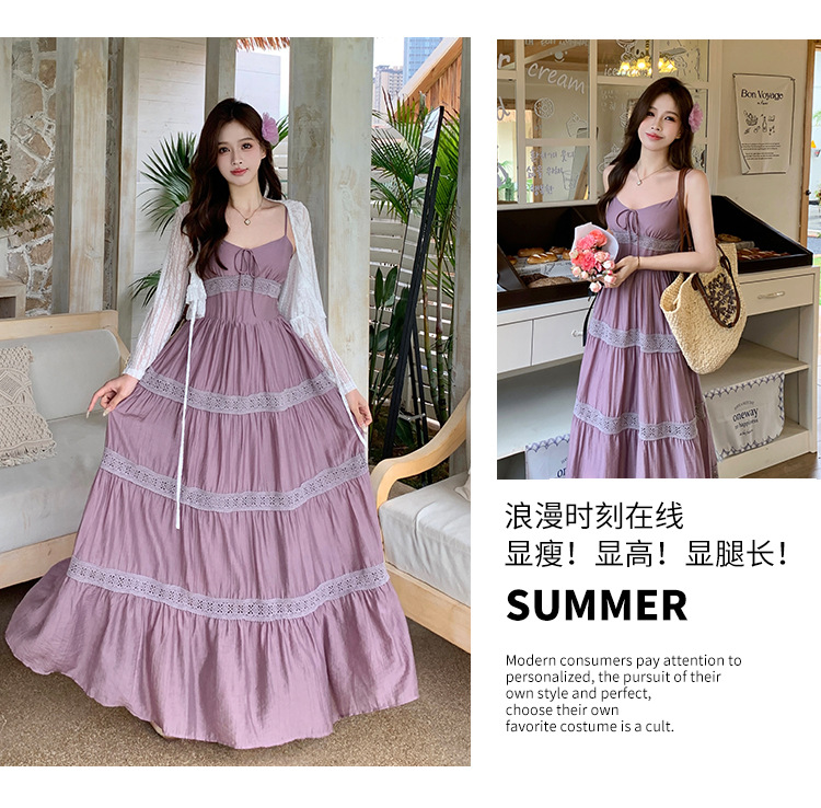 달콤하고 부드러운 프랑스 스타일 보라색 슬링 원피스 여성용 타이트 허리 슬리밍 레이스 스티칭 스커트 카디건 투피스 세트스토어 가기