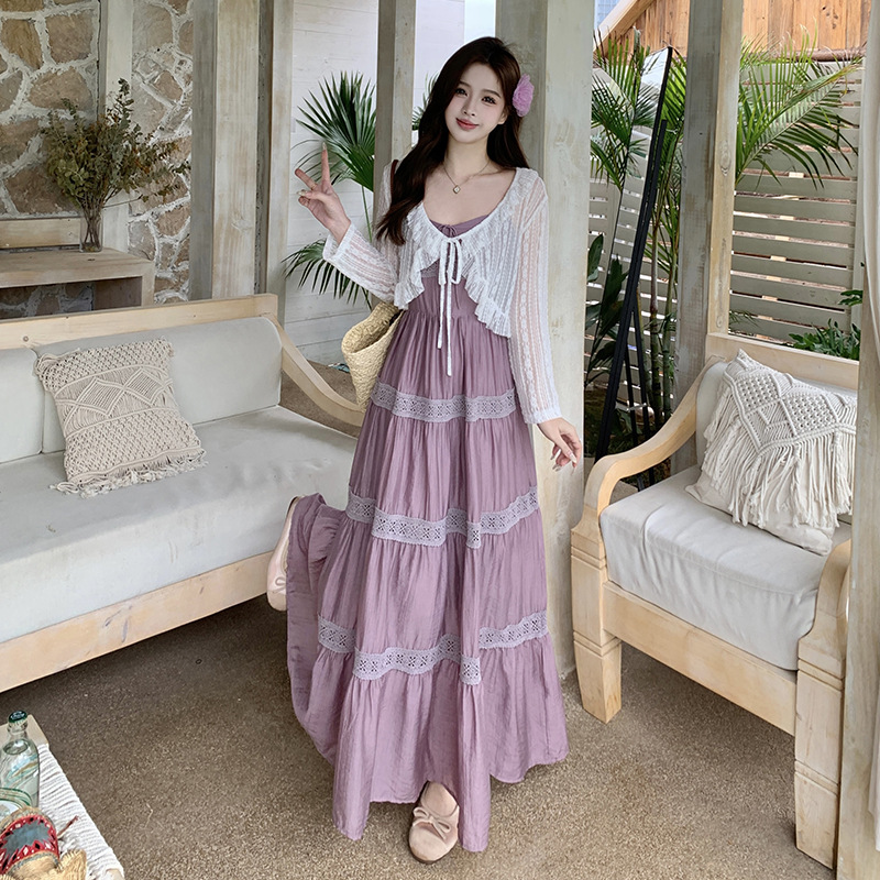 달콤하고 부드러운 프랑스 스타일 보라색 슬링 원피스 여성용 타이트 허리 슬리밍 레이스 스티칭 스커트 카디건 투피스 세트