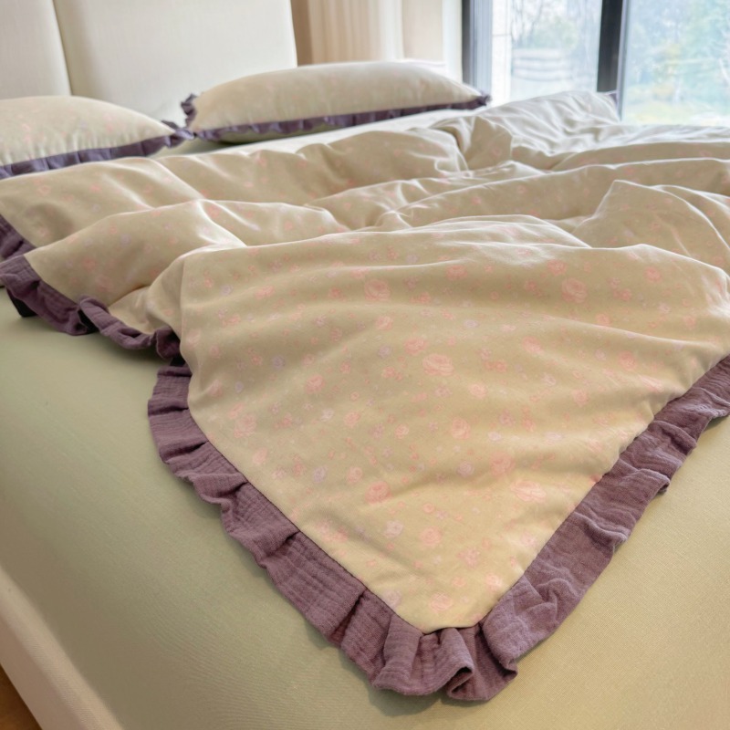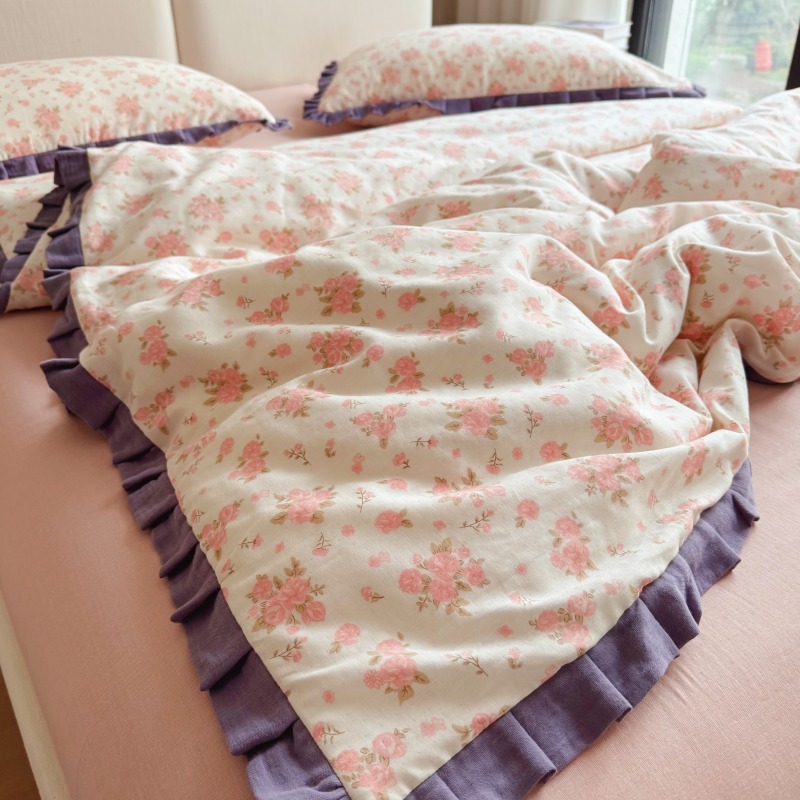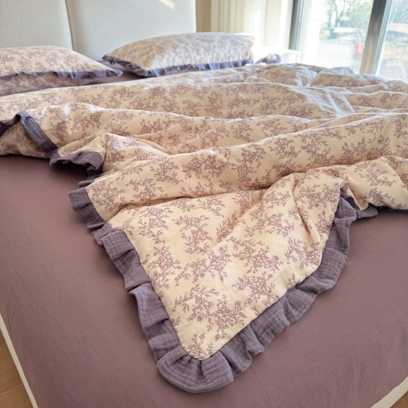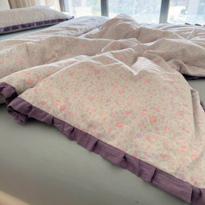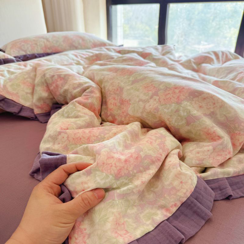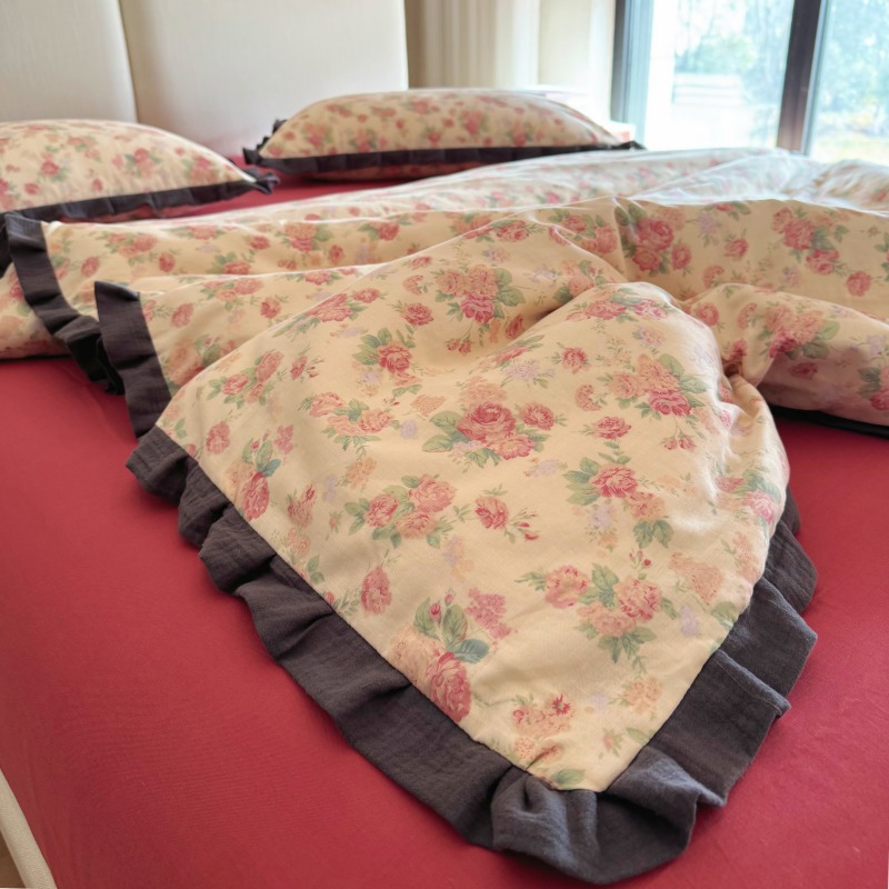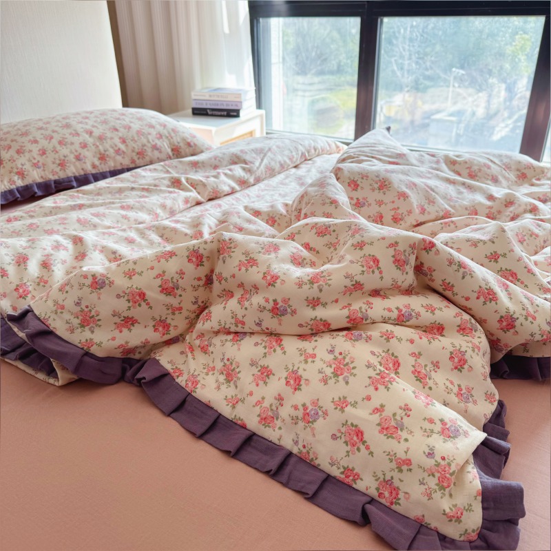 작은 빨간 책 TikTok 폭발 면 두 배 층 원사 부드러운 벌거 벗은 잠자는 4 피스 세트 사계절 유니버설 플로랄 코튼 퀼트 커버