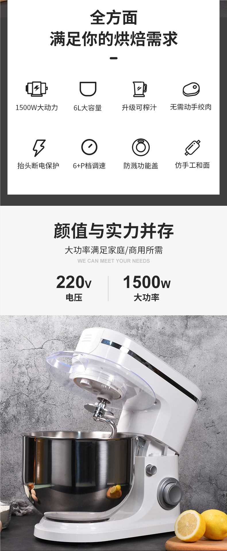 • 6 L-1500W 요리사 기계 + 주스 및 고기 분쇄 액세서리
