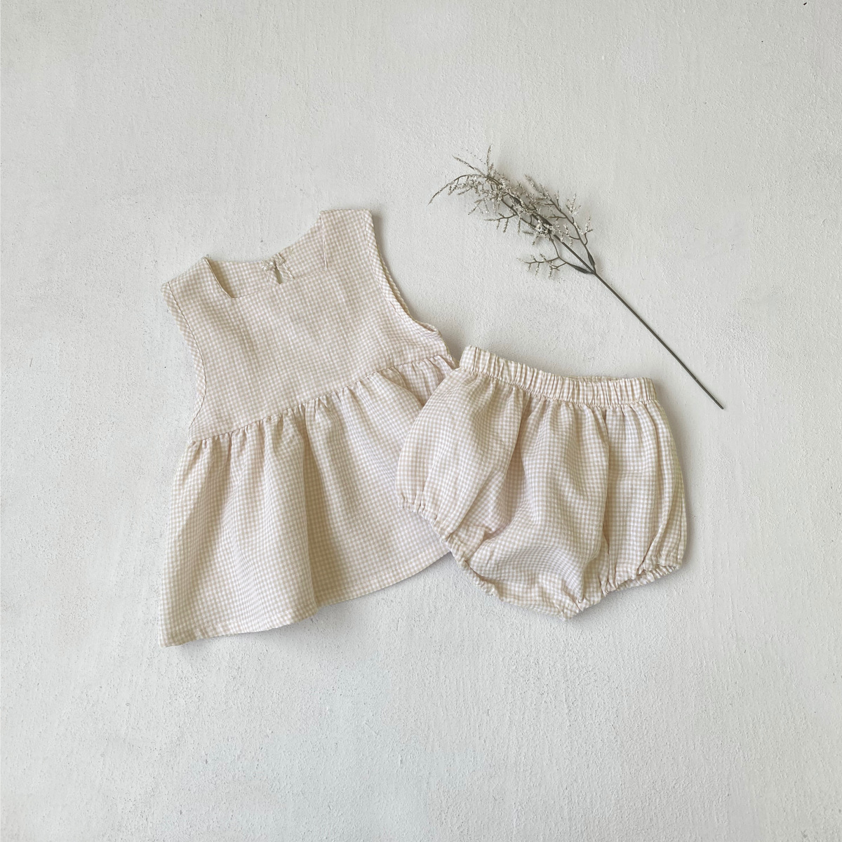 아기의 여름 원피스 클래스 아기 소녀의 얇은 격자 무늬 민소매 높은 허리 짧은 치마 삼각형 빵 큰 PP 반바지 분할 세트
