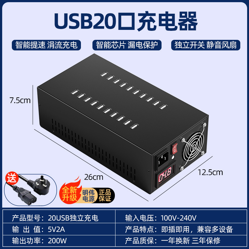 • 3C 인증 단일 행 20포트 200w 2세대 + 안정적인 고속 충전 + MEAN WELL 전원 공급 장치