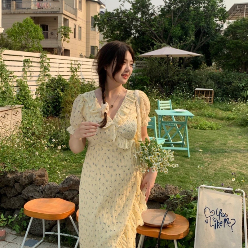 통통한 소녀 여름 새로운 도착 원피스 여성 프랑스 스타일 우아한 달콤한 꽃 Ruffled 부드러운 꽃 치마스토어 가기