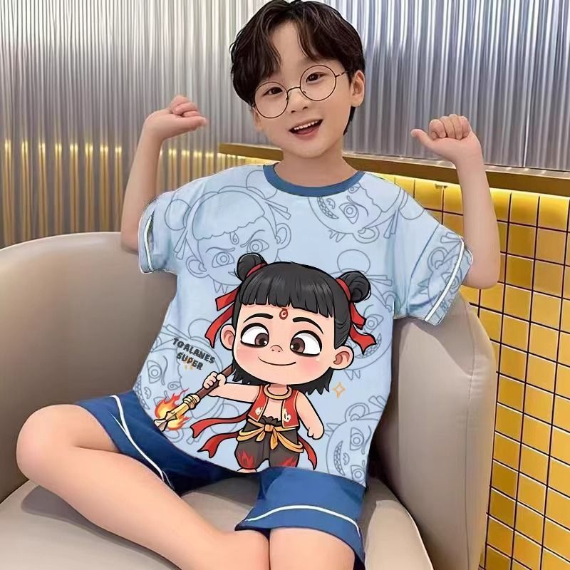 어린이 잠옷 여름 소년 잠옷 만화 반팔 반바지 어린이 중 큰 소년 홈 의류 세트