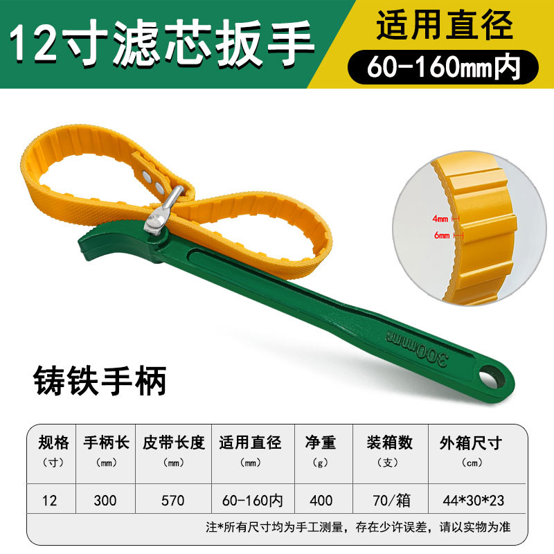 适用直径:60-160mm内;手柄长:300mm;皮带长度:570mm;净重:400g。