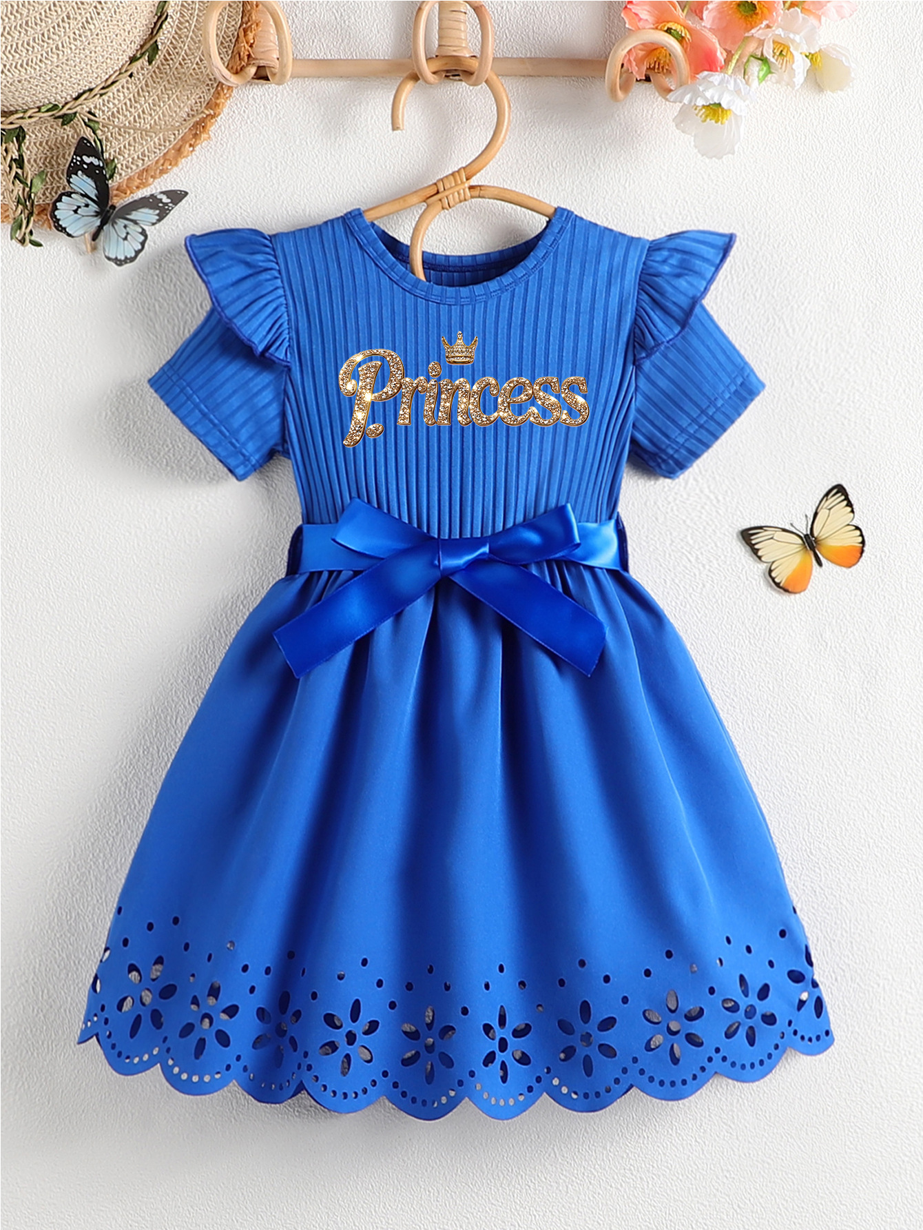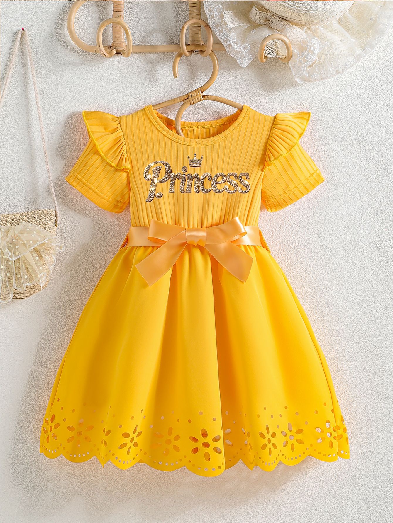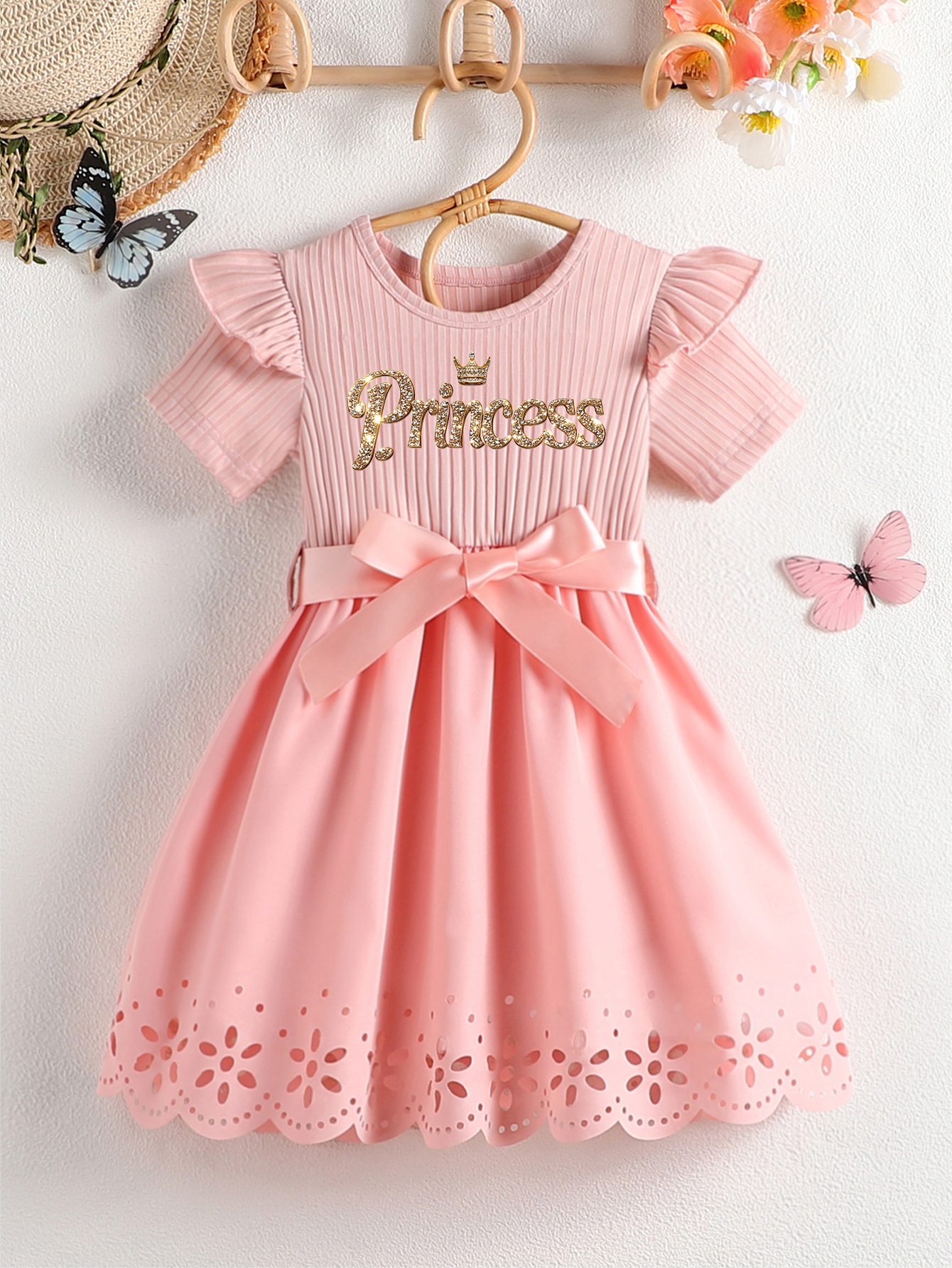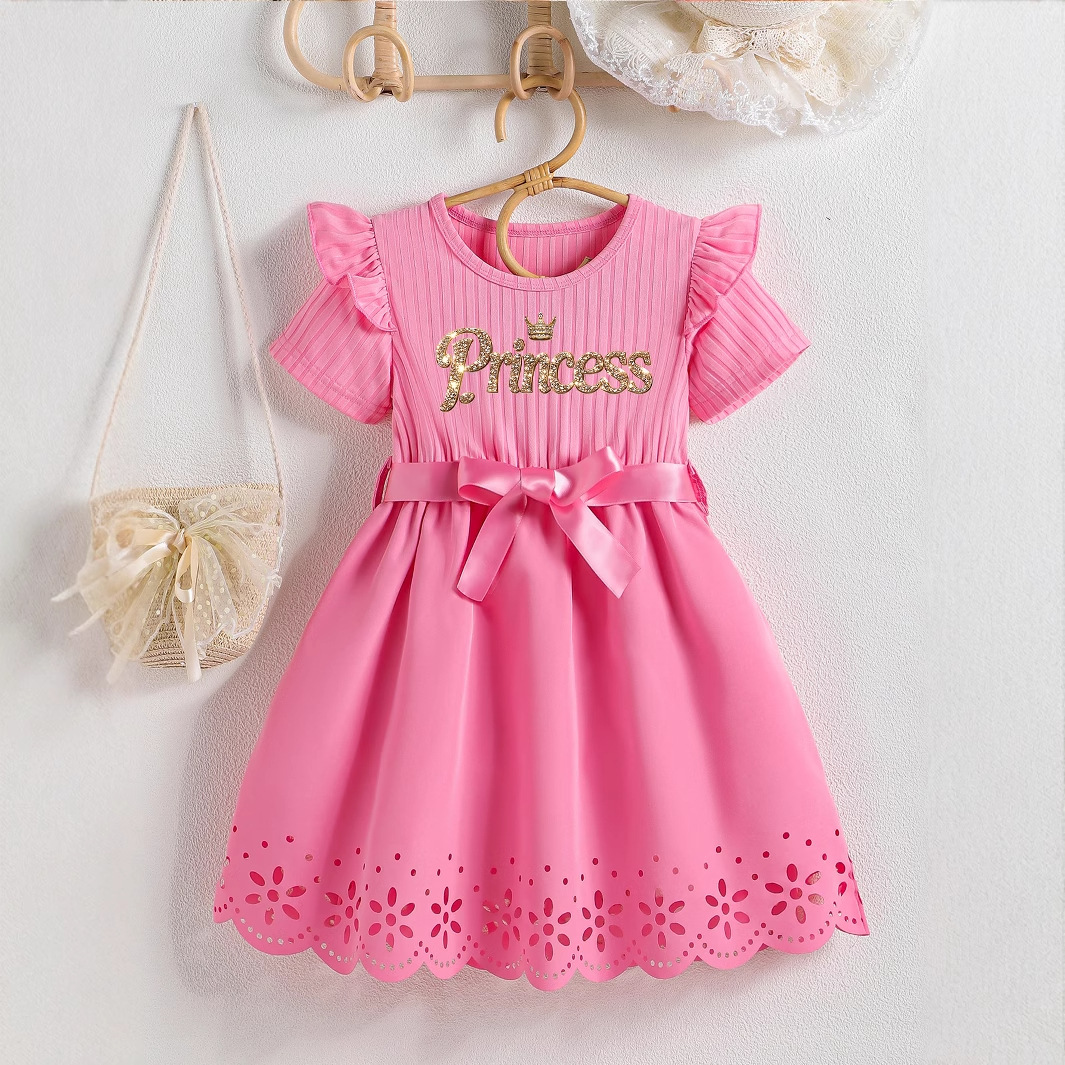 여름 새로운 소녀 황금 공주 편지 인쇄 활 벨트 둥근 목 짧은 소매 원피스