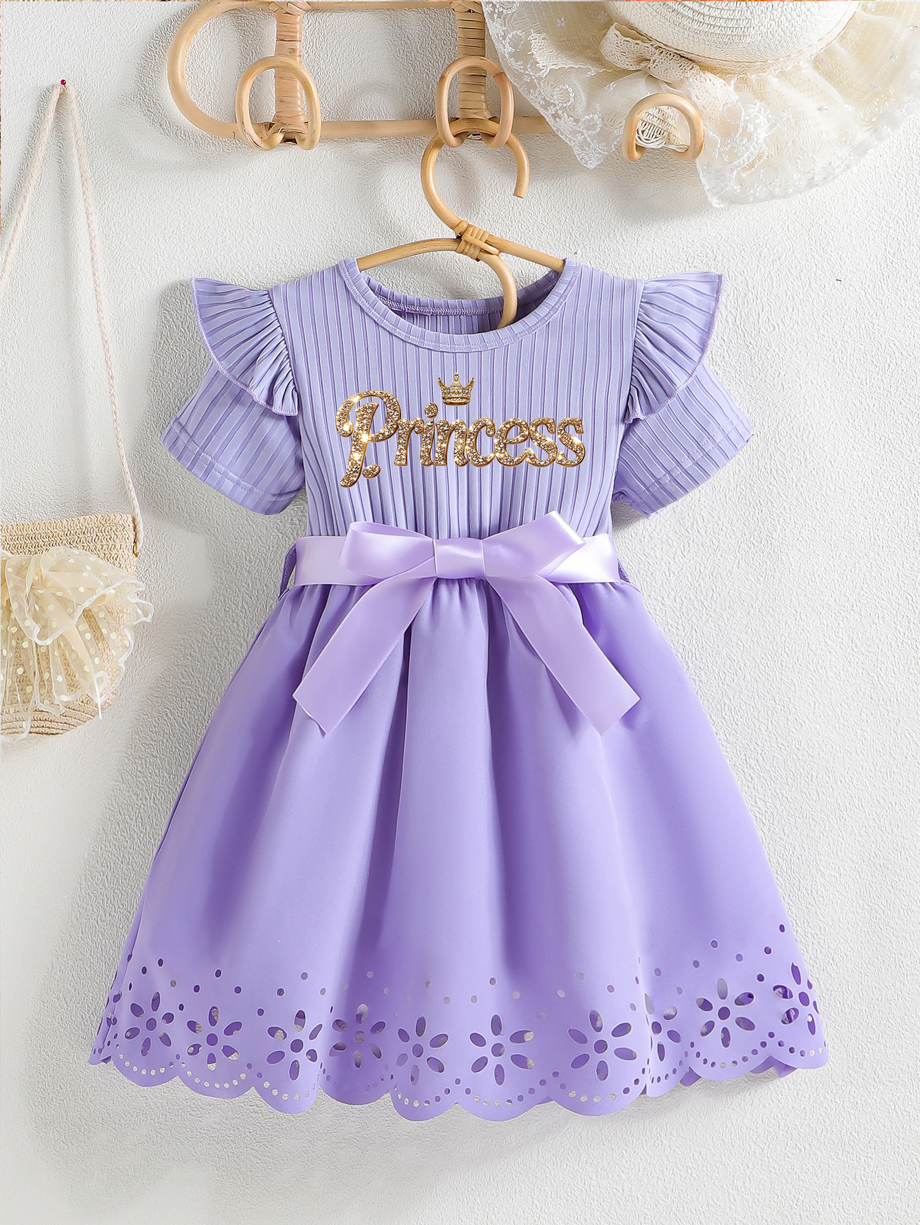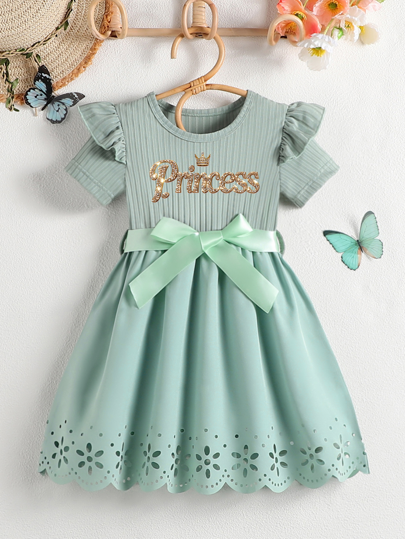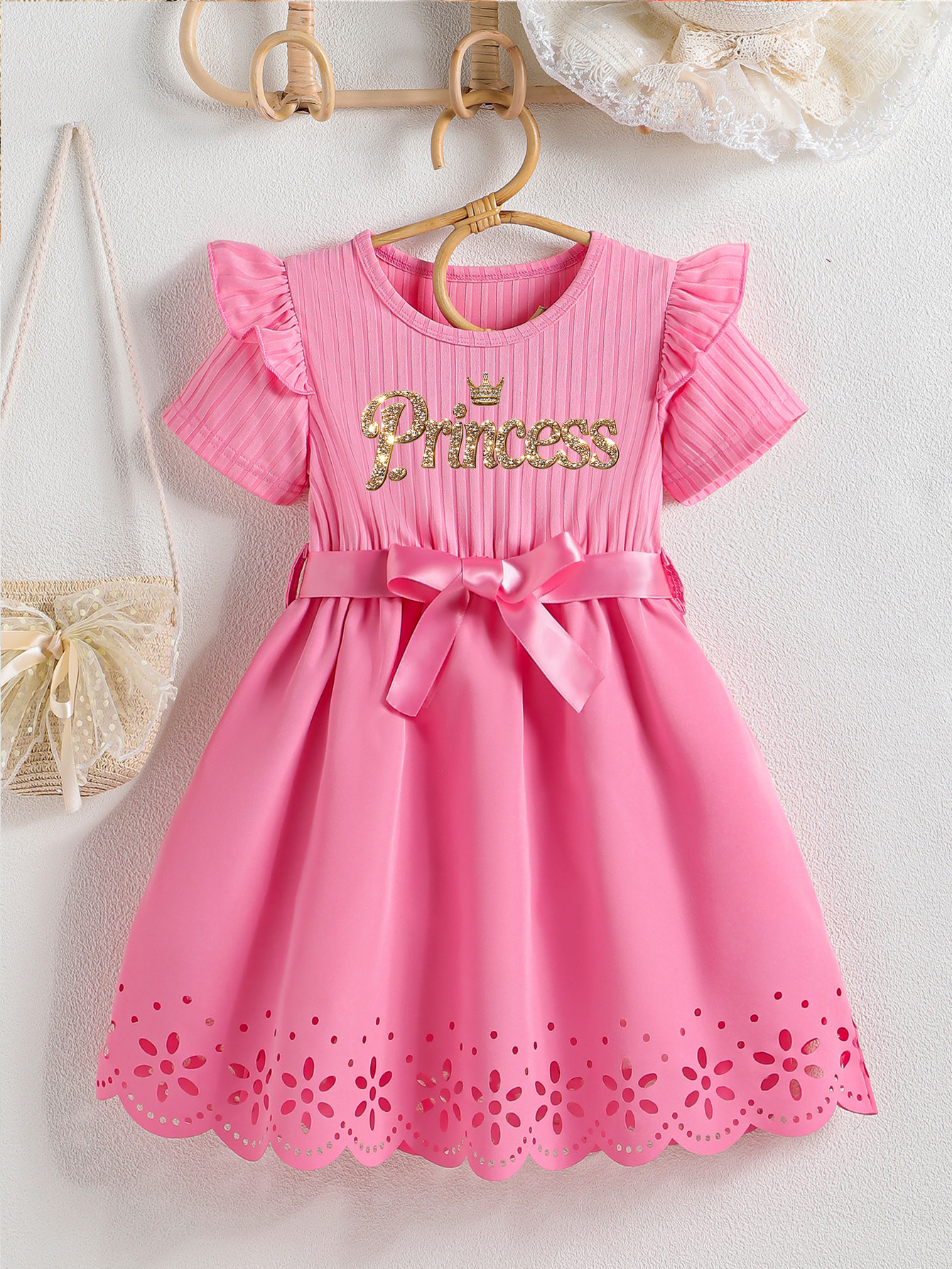 여름 새로운 소녀 황금 공주 편지 인쇄 활 벨트 둥근 목 짧은 소매 원피스