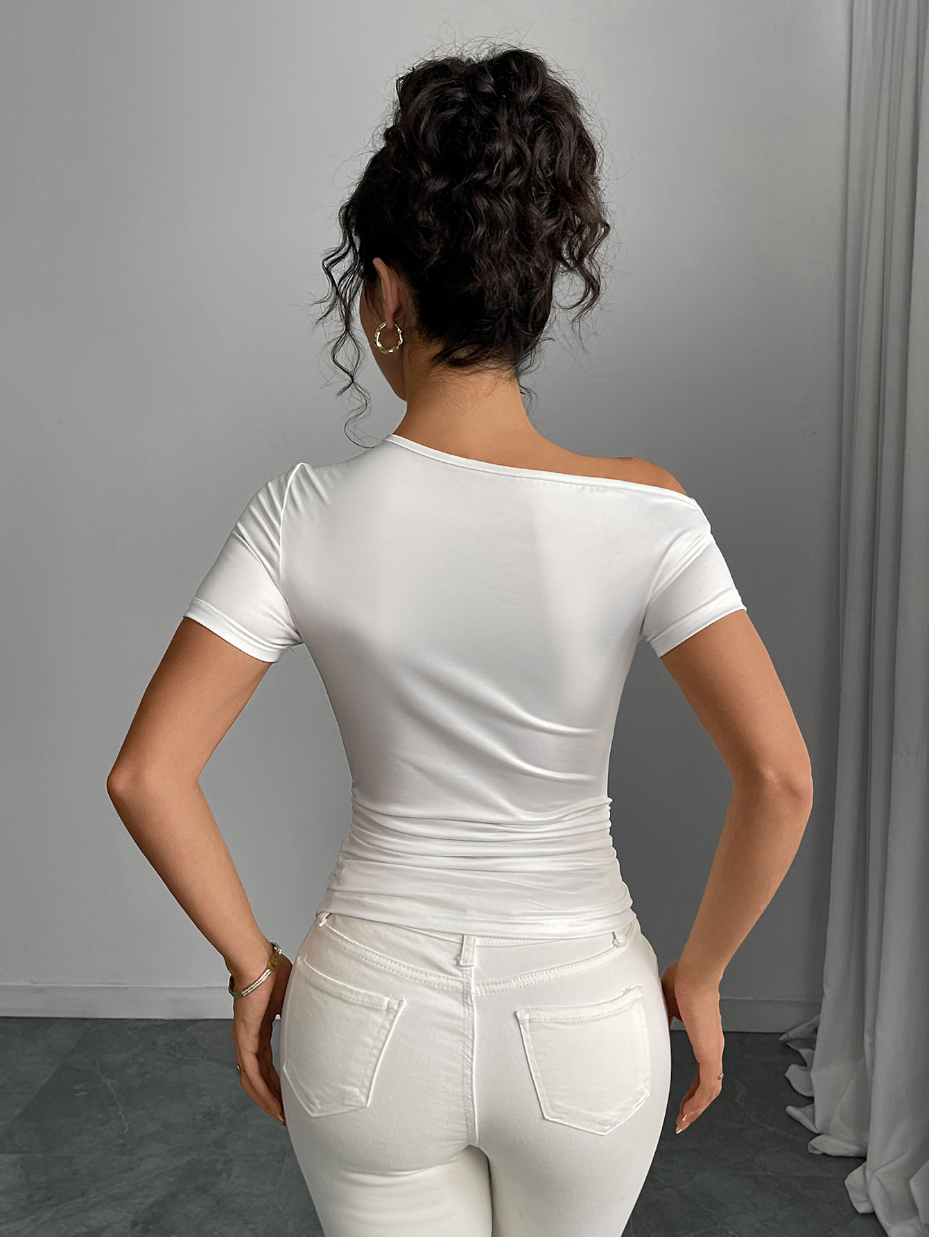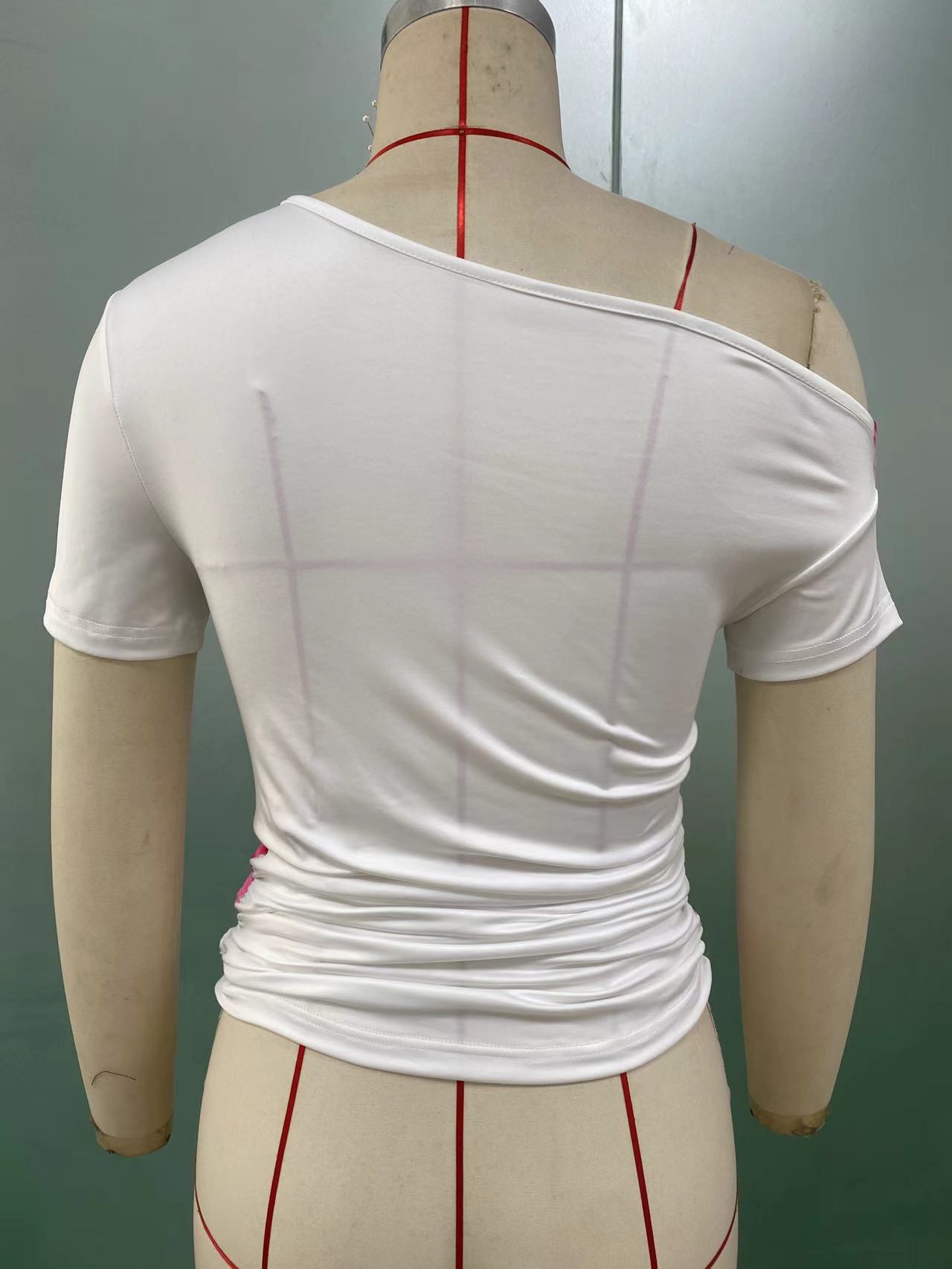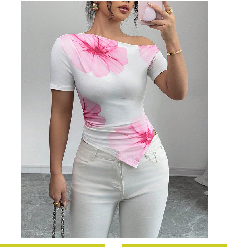 루이추 크로스보더 유럽 및 미국 무역 슬랜트 숄더 반팔 티셔츠 2025 여름 스타일리시 프린트 불규칙 신축성 여성 상의스토어 가기