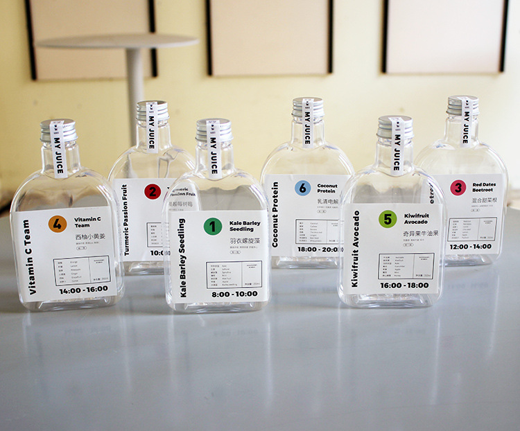 아이스 티 병 빛 깨는 과일 및 야채 주스 병 플랫 스퀘어 일회용 애완 동물 플라스틱 음료 병 신선한 주스 병 우유 차 병
