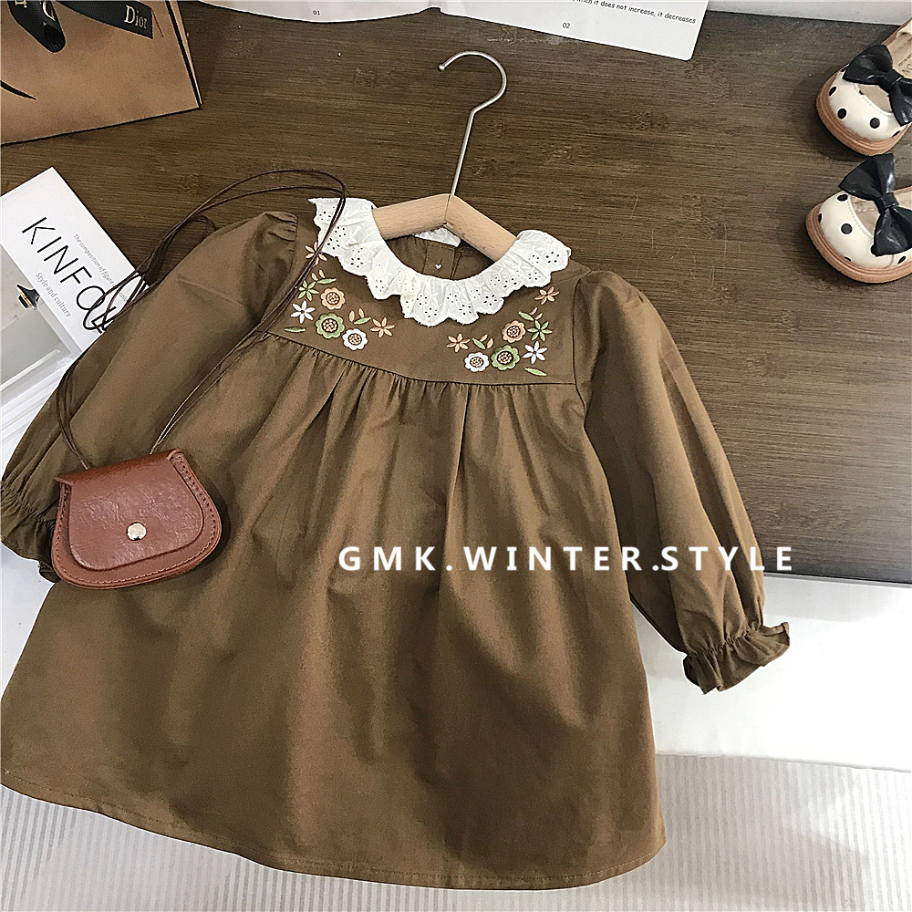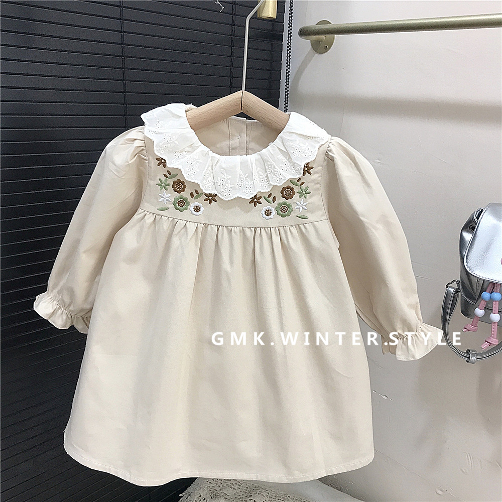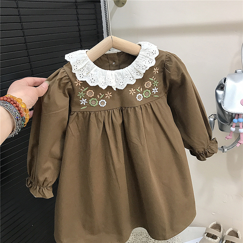 소녀의 봄 새로운 도착 원피스 한국 스타일 소녀 아기의 스타일 레이스 칼라 외출을 위해 긴 소매 공주 원피스 자수스토어 가기