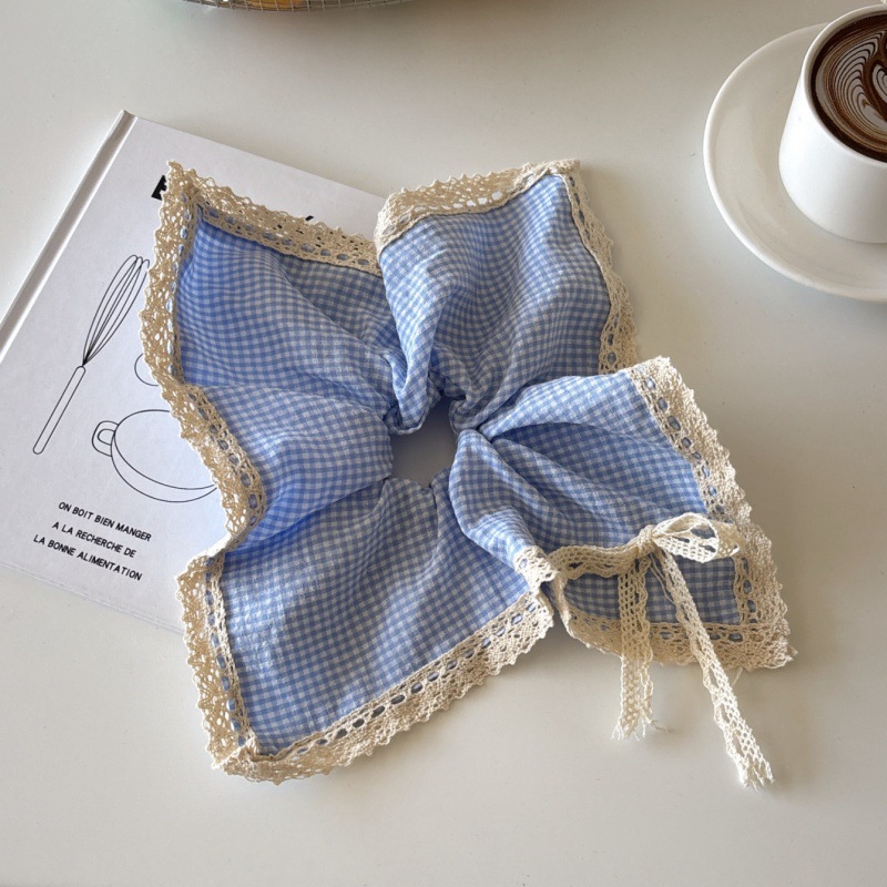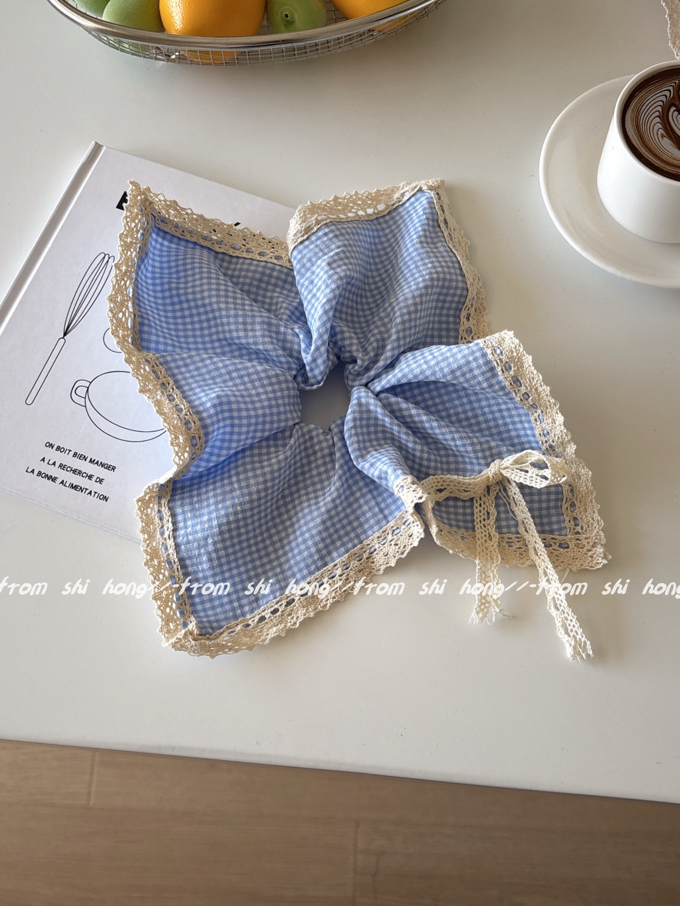 • 블루 체크 무늬 레이스 보우 스퀘어 스카프