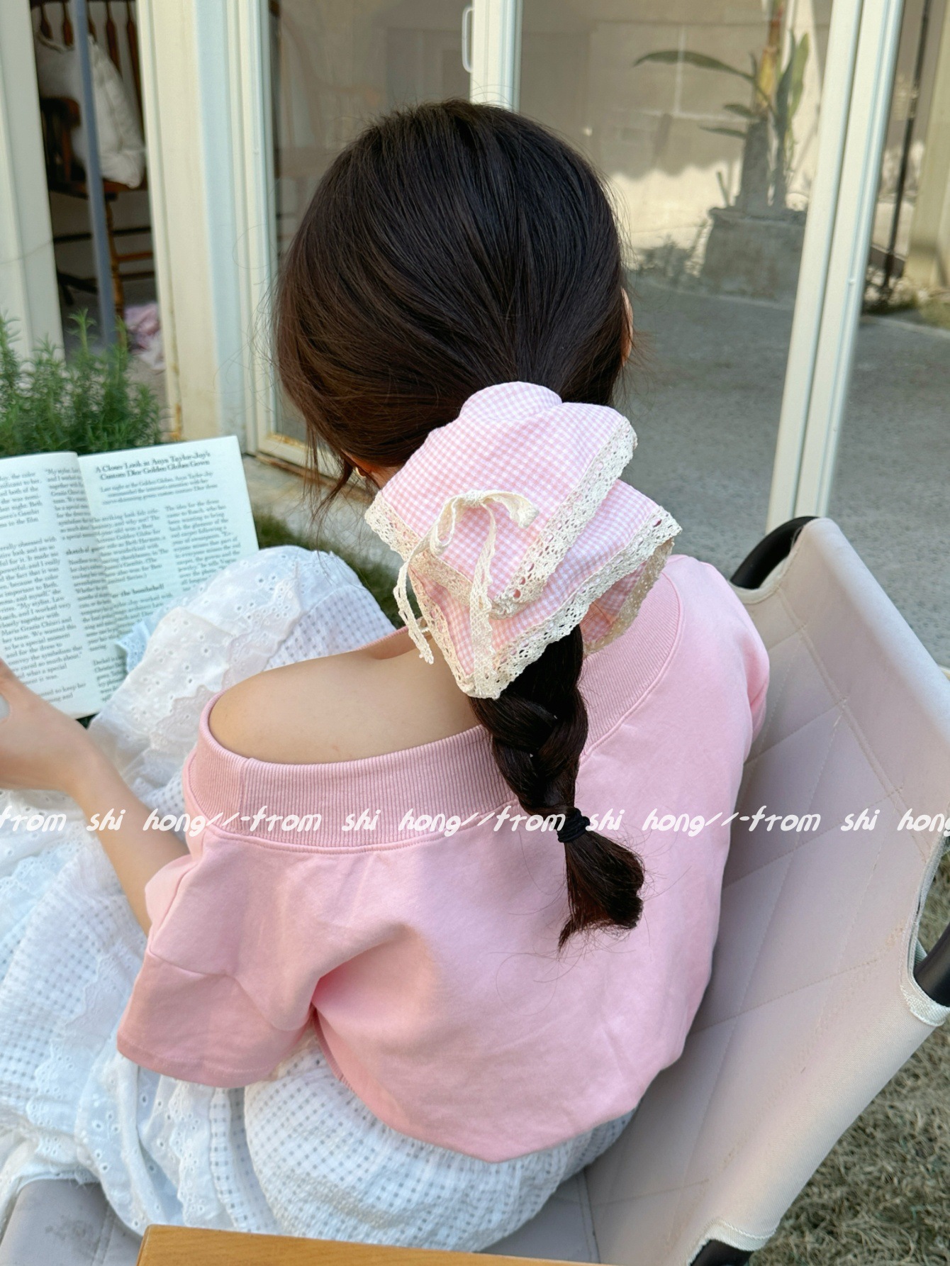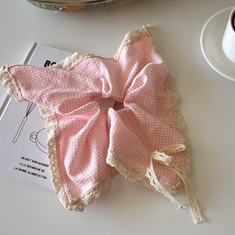 • 핑크 체크 무늬 레이스 보우 스퀘어 스카프