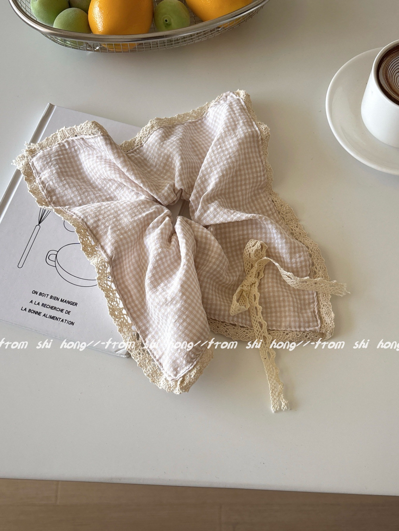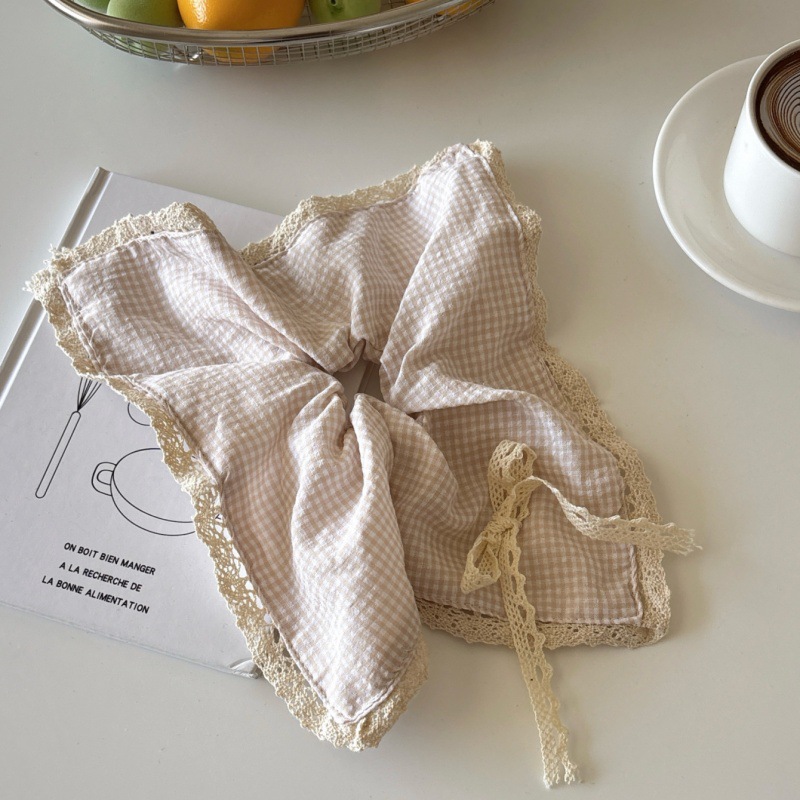 • 밀크티 컬러 체크 무늬 레이스 리본 스퀘어 스카프
