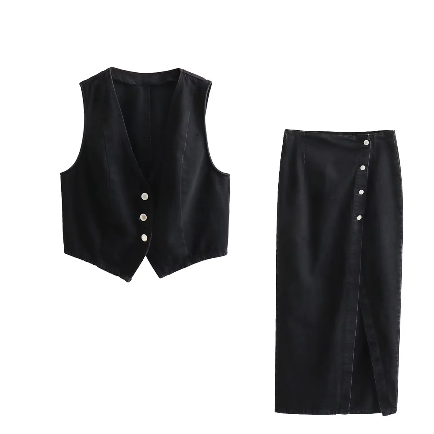 유럽과 미국을위한 국경 간 여성 AliExpress INS 폭발성 짧은 데님 조끼 더블 브레스트 미디 원피스 세트