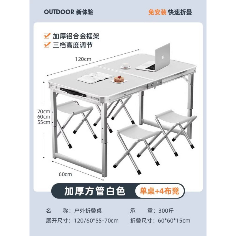 • 사각 튜브 두꺼워지고 강화된 모델 [120*60] 흰색 싱글 테이블 + 알루미늄 스툴 4개