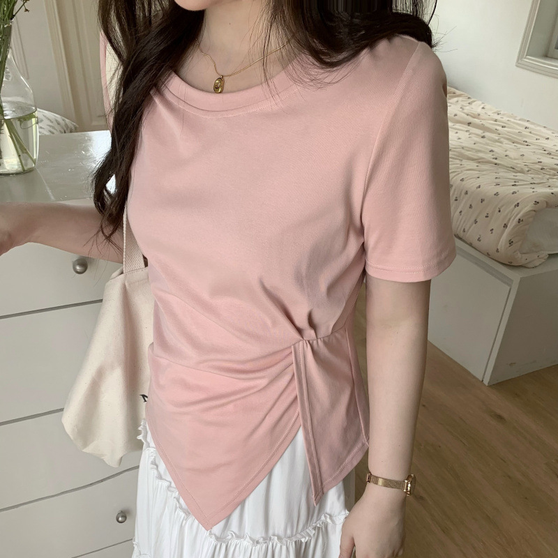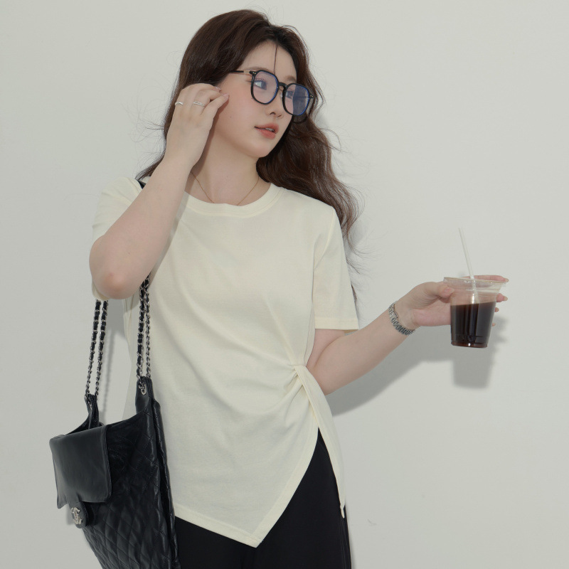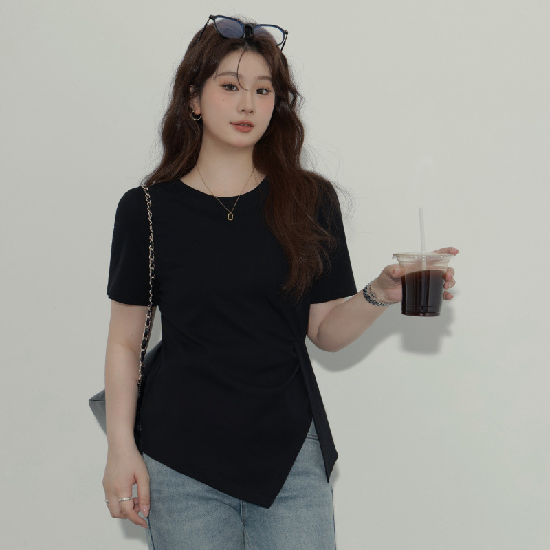코튼 통통녀 느슨한 반팔 얇은 티셔츠 여자 2025 년 새 여름 올 매치 어깨 슬리밍 스플릿 티셔츠 탑