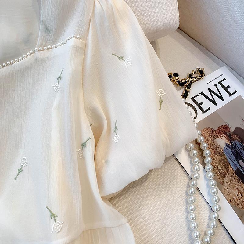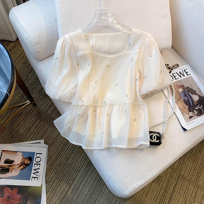 2025 여름 새로운 진주 광장 칼라 인형 셔츠 요정 달콤한 짧은 소매 최고 셔츠 쉬폰 슬리밍 여름스토어 가기