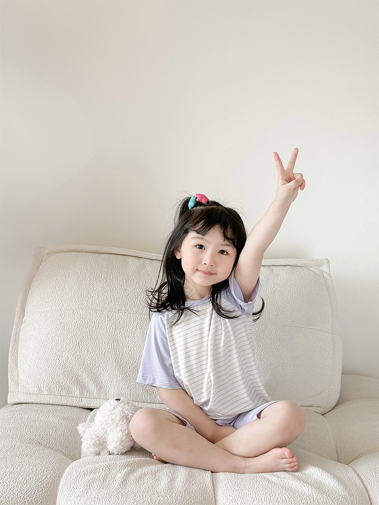 2025 어린이 여름 Youcan 줄무늬 에어컨 세트 소년 소녀 홈 의류 세트 반팔 얇은 잠옷스토어 가기