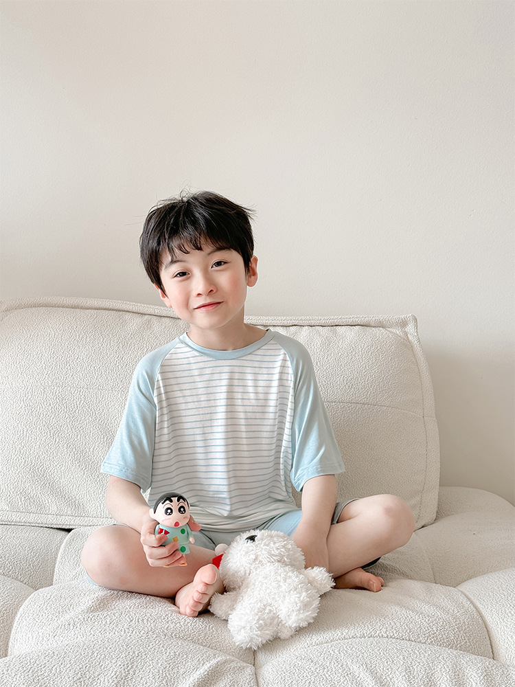 2025 어린이 여름 Youcan 줄무늬 에어컨 세트 소년 소녀 홈 의류 세트 반팔 얇은 잠옷