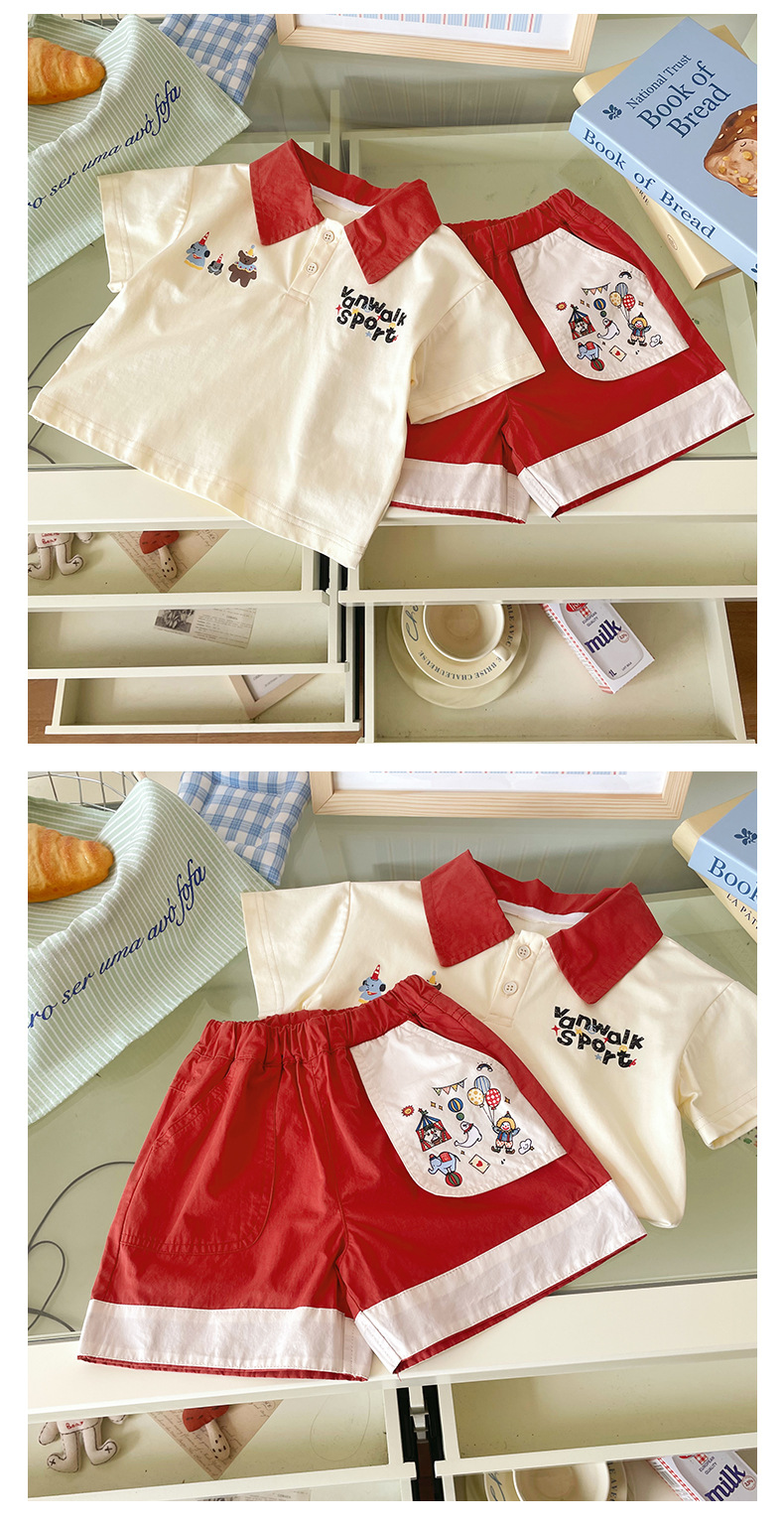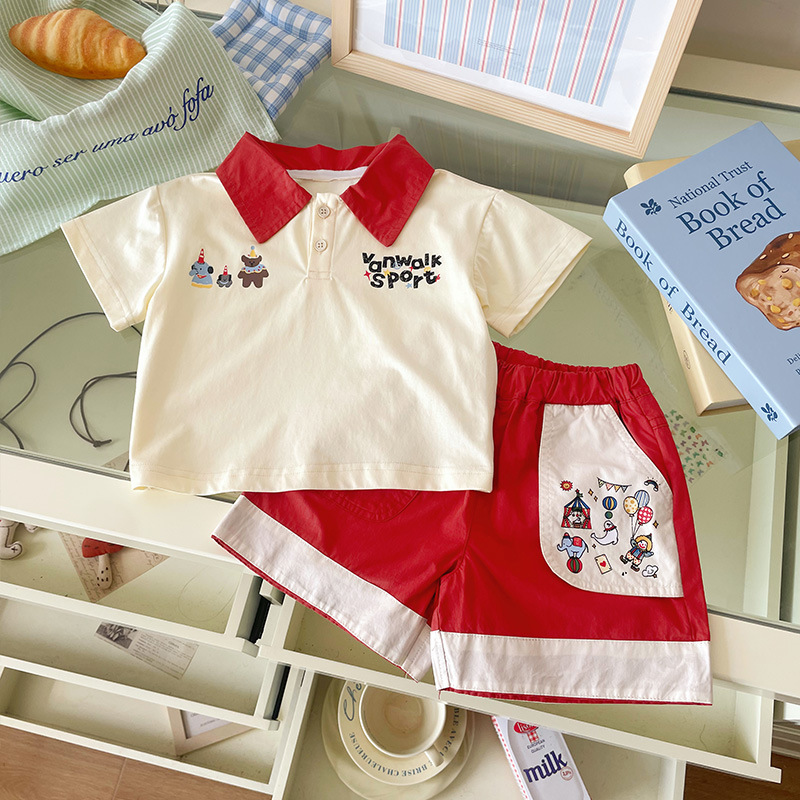 XT255199 소년 세트 2025 여름 새로운 아기 만화 곰 편지 자수 폴로 셔츠 반바지 2스토어 가기