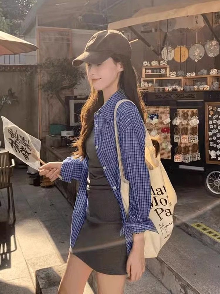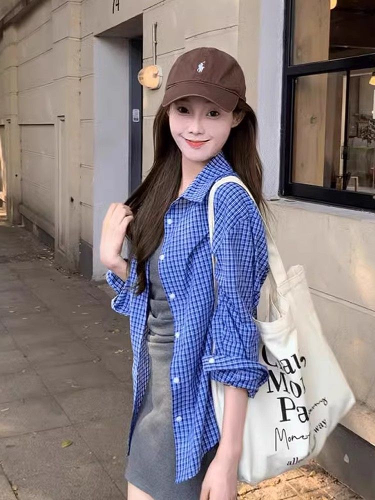 아메리칸 스타일 레트로 블루 체크 셔츠 여성의 봄과 가을 여름 새로운 한국 스타일 게으른 느슨한 슬리밍 선스크린 셔츠 최고 트렌디스토어 가기
