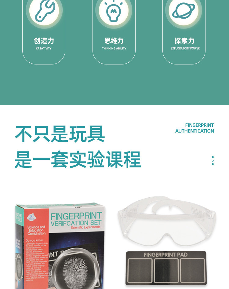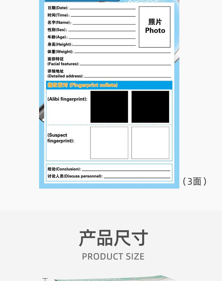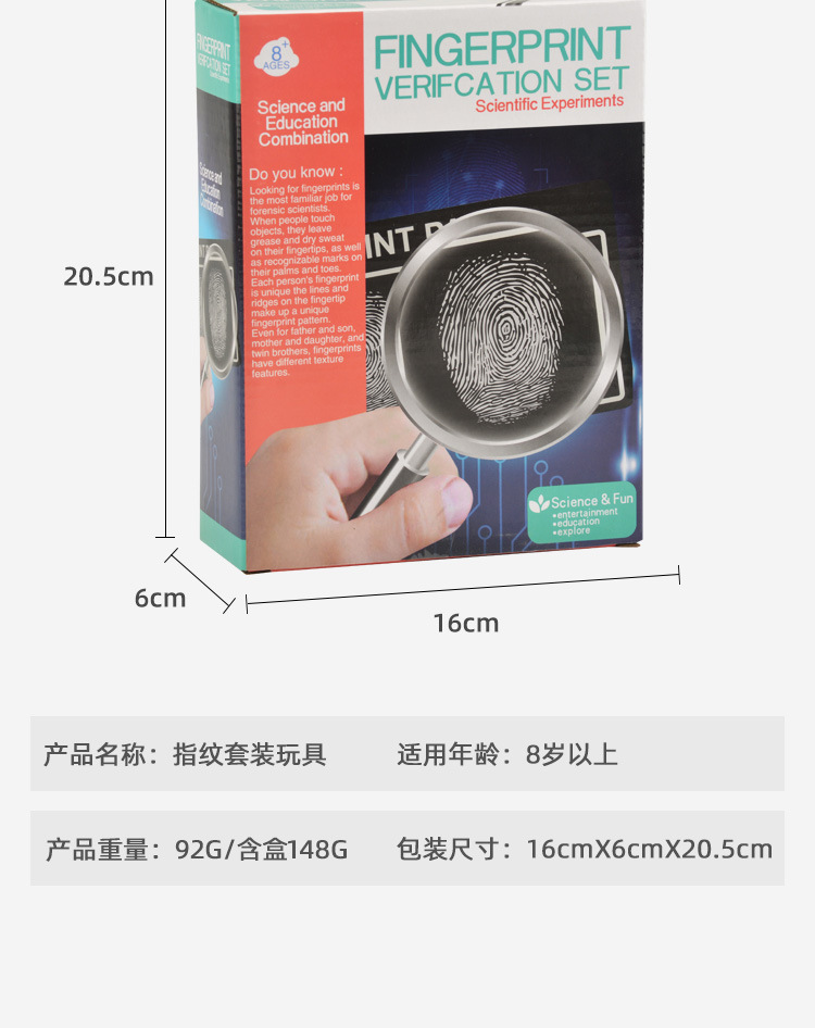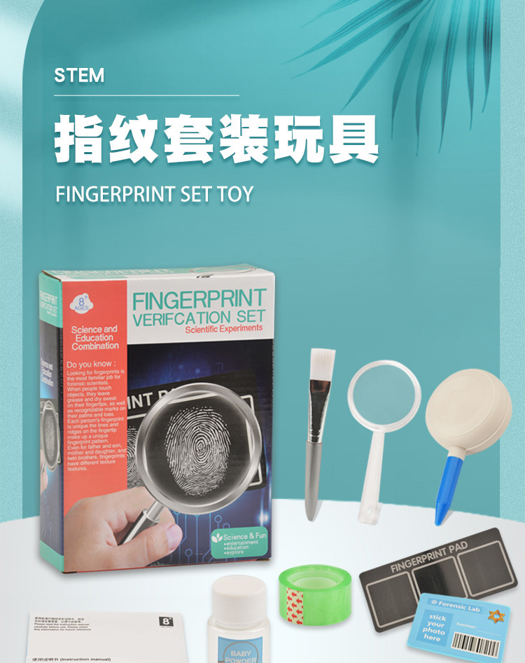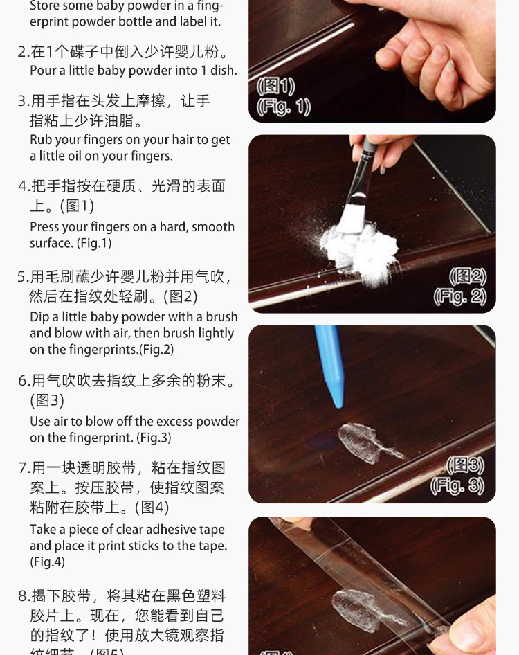 因安全问题爽身粉需自备,套装附带中英文说明书,护目镜,放大镜,毛刷,气吹,印台,指纹粉瓶,透明胶带,徽章,黑色塑料。