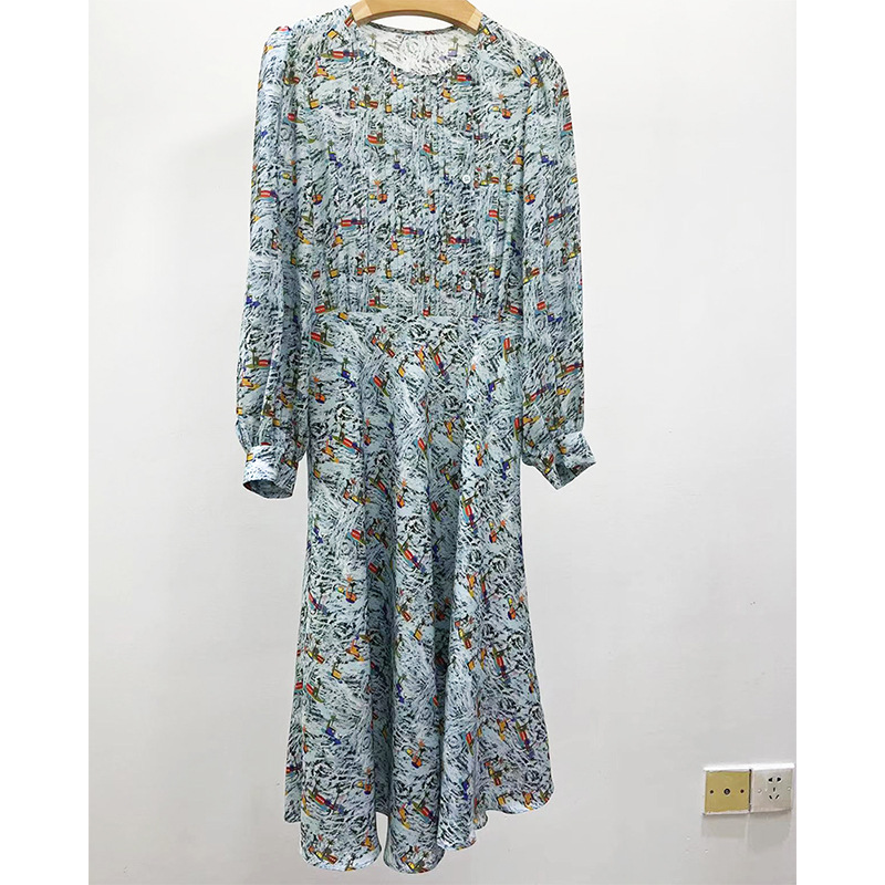 Nanyou 공장 도매 Xiaohe 여성복 새로운 스노우 하우스 인쇄 둥근 목 실크 긴 소매 원피스 부드러운스토어 가기