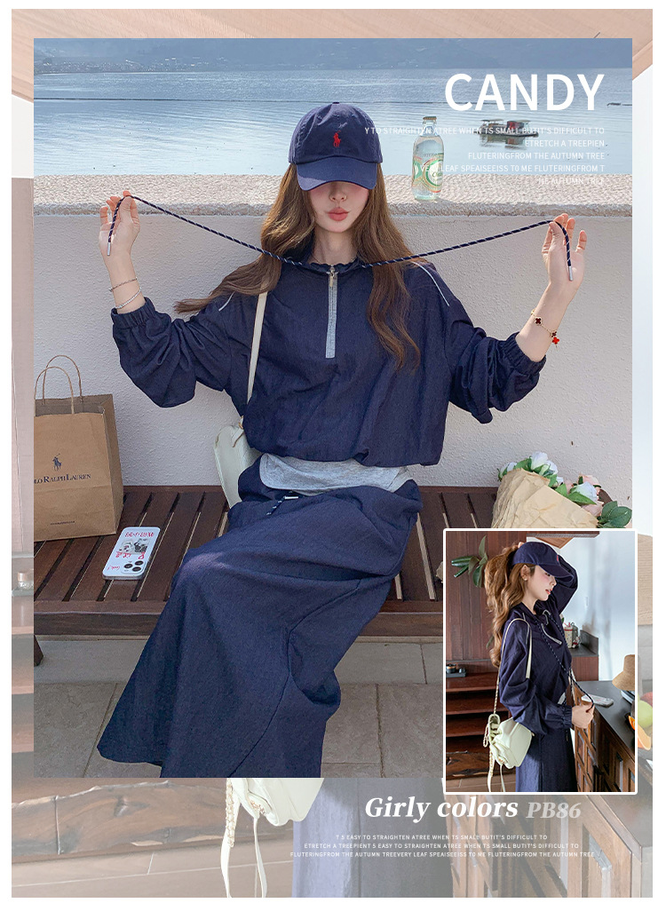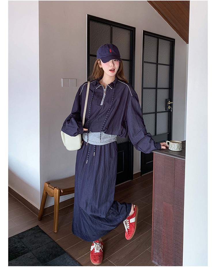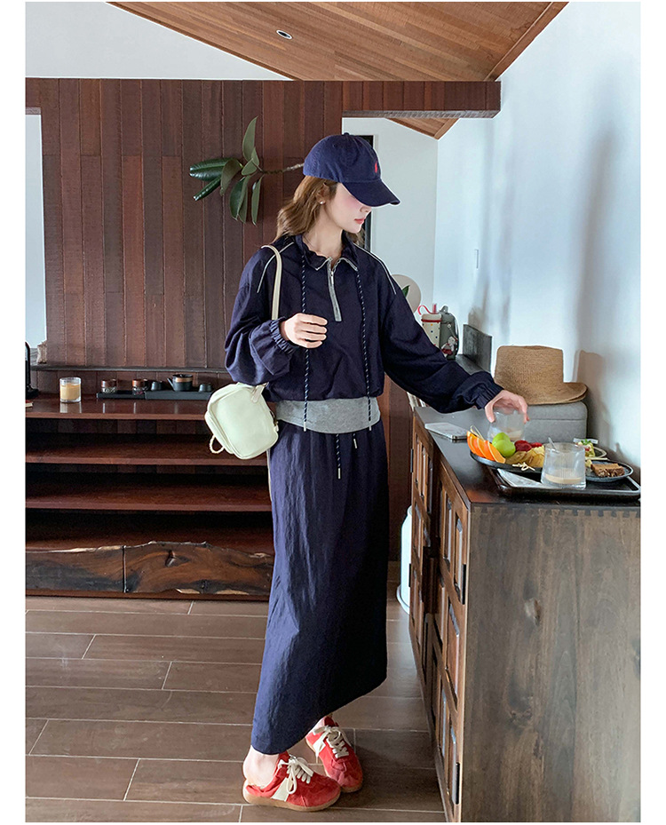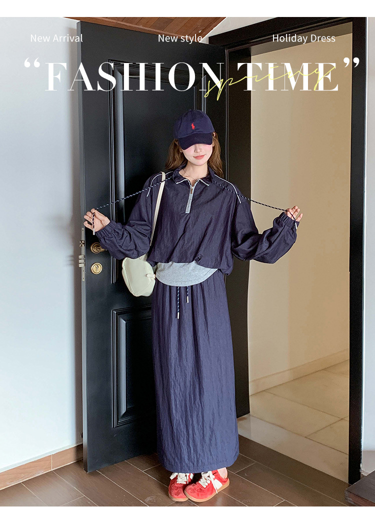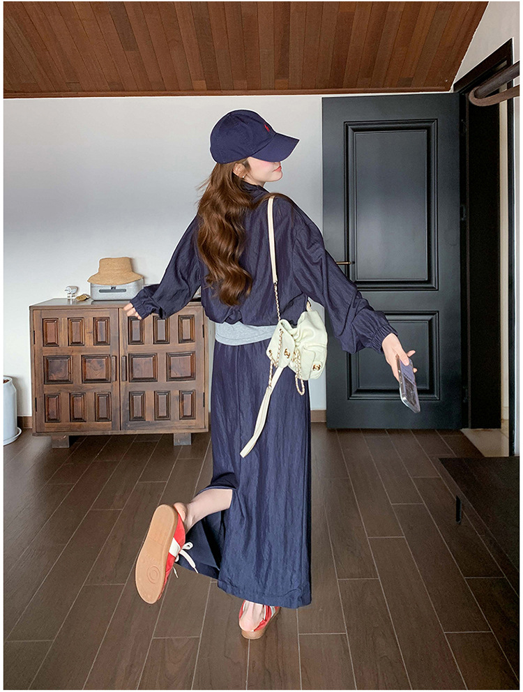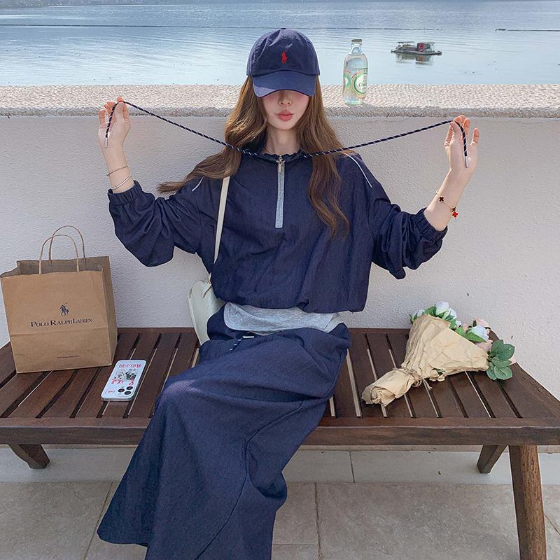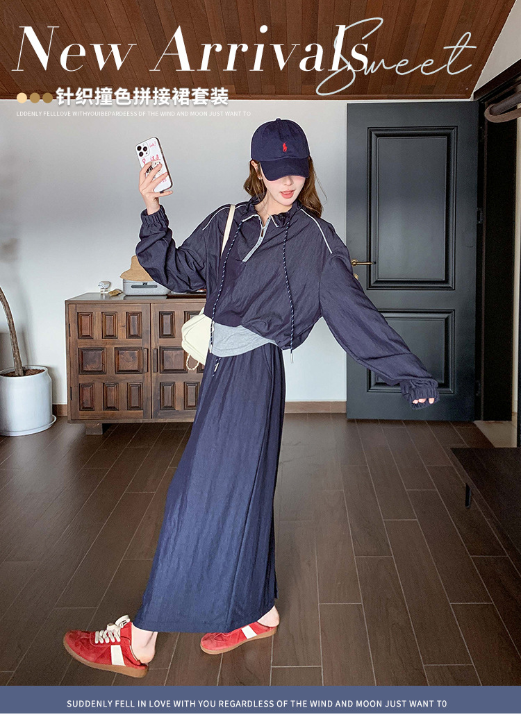 다크 블루 대학 스타일 캐주얼 세트 원피스 여성 2025 봄 새로운 디자인 센스 스포츠 스커트 투피스 세트스토어 가기