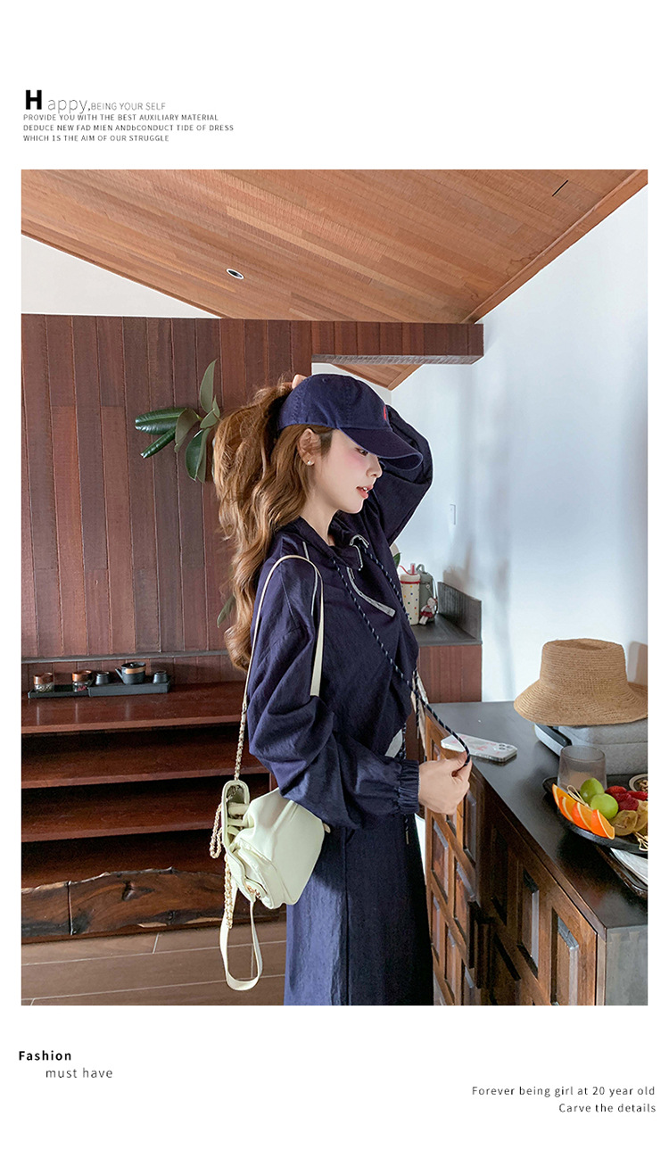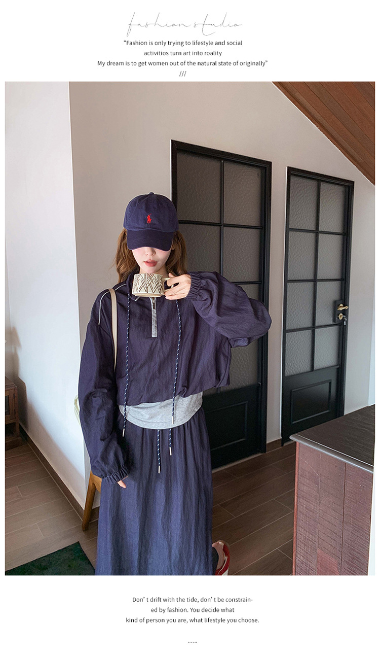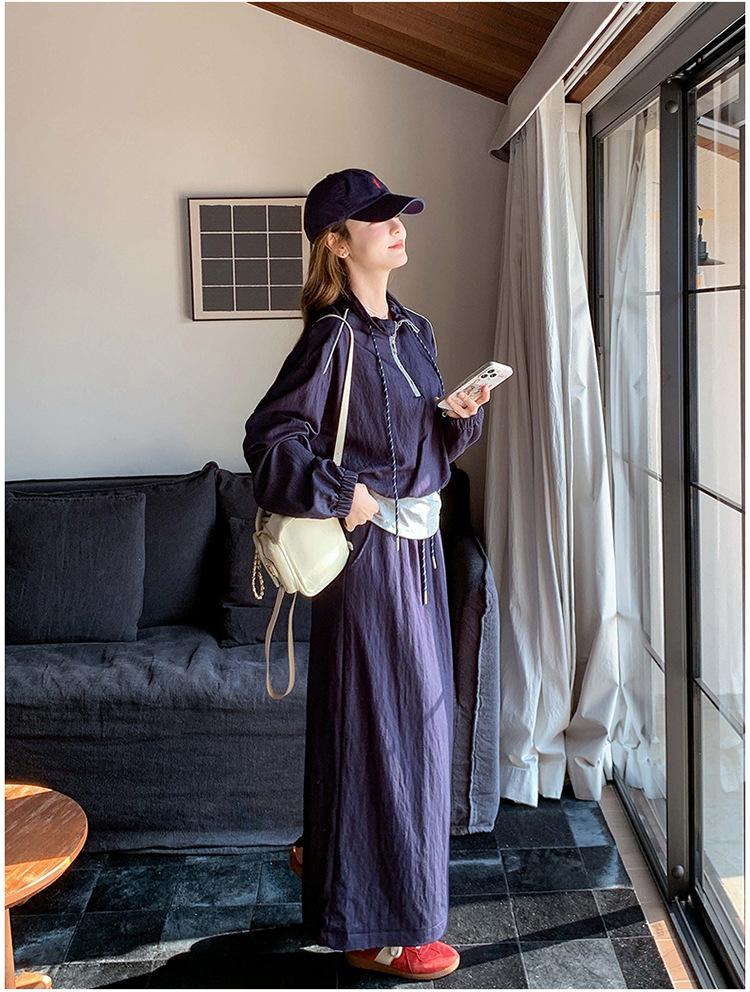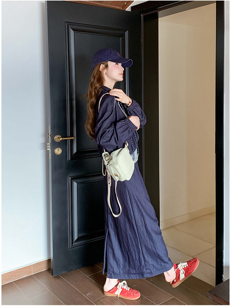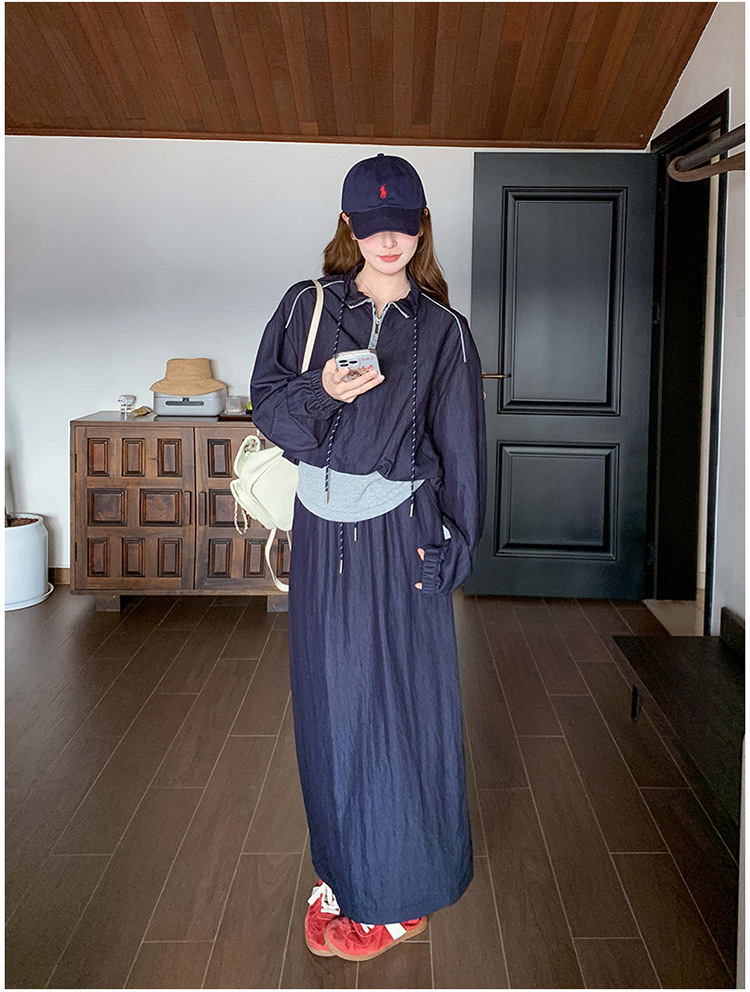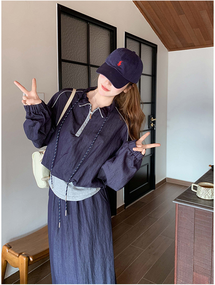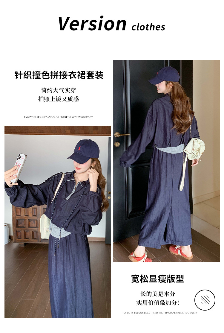 다크 블루 대학 스타일 캐주얼 세트 원피스 여성 2025 봄 새로운 디자인 센스 스포츠 스커트 투피스 세트스토어 가기