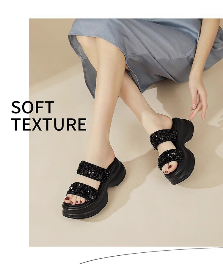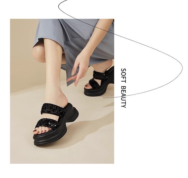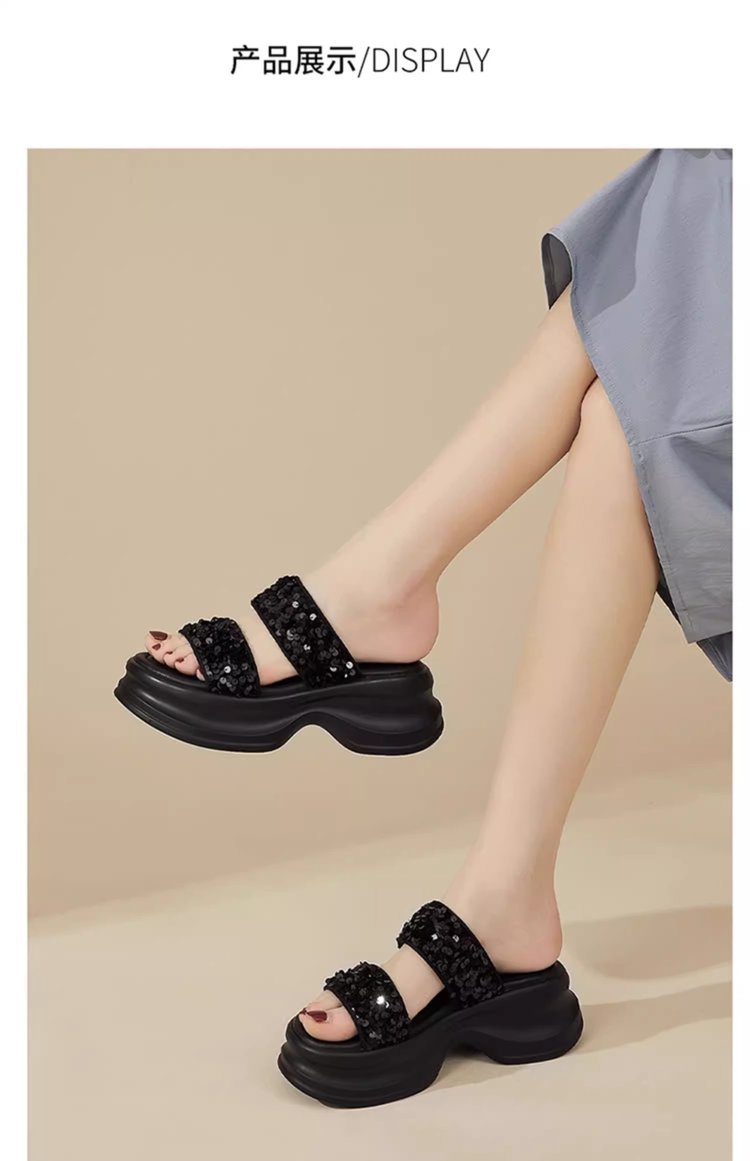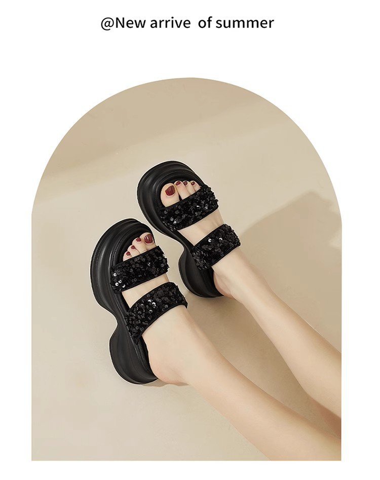 샌들 및 슬리퍼 여성 여름 야외 착용 2025 새로운 스타일의 원라인 슬리퍼 머핀 두꺼운 바닥 높이 증가 스팽글 유행 야외 착용 샌들