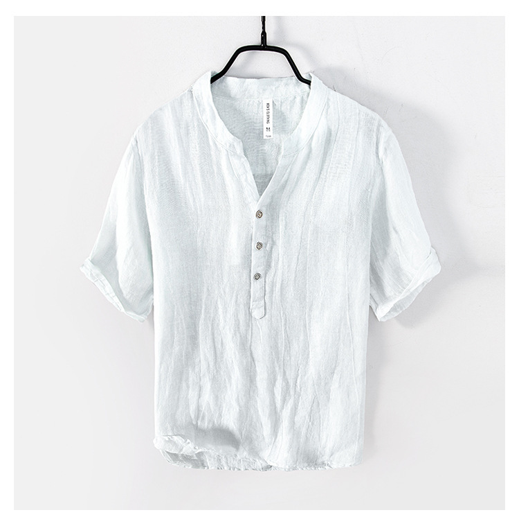 여름 얇은 린넨 반팔 티셔츠 남성용 캐주얼 스탠드 칼라 풀오버 셔츠 전국 패션 플러스 사이즈 빈티지면과 린넨 탑