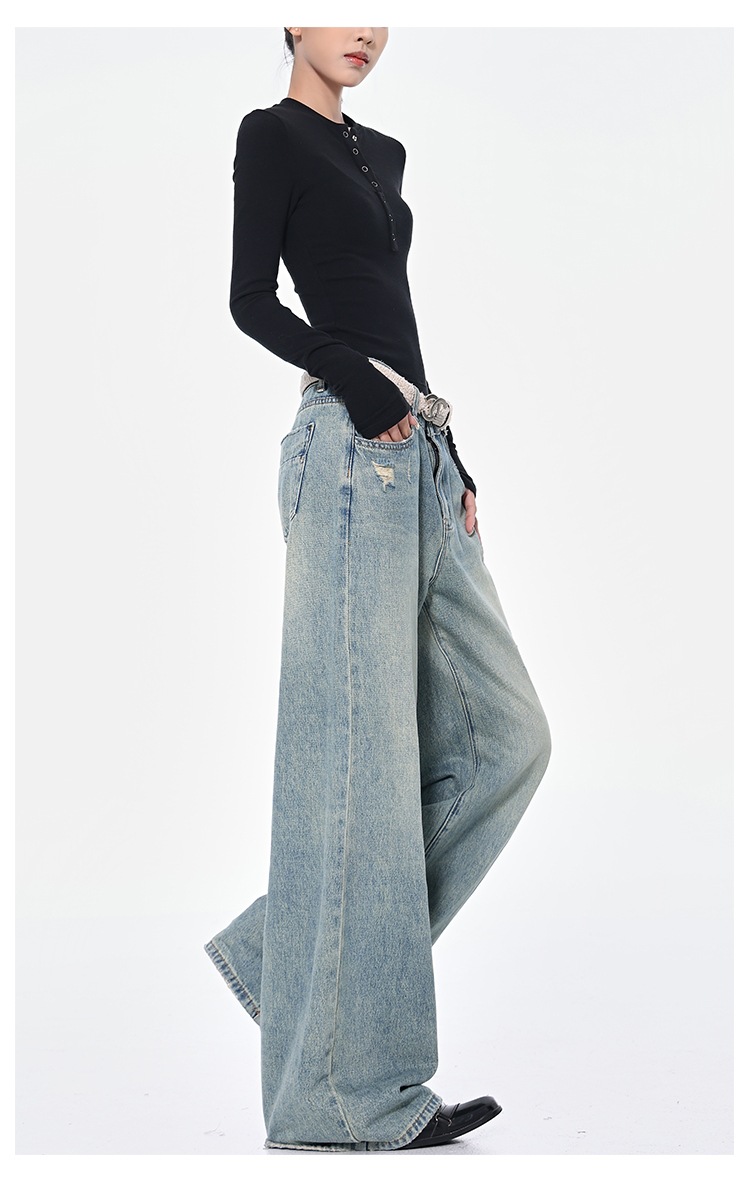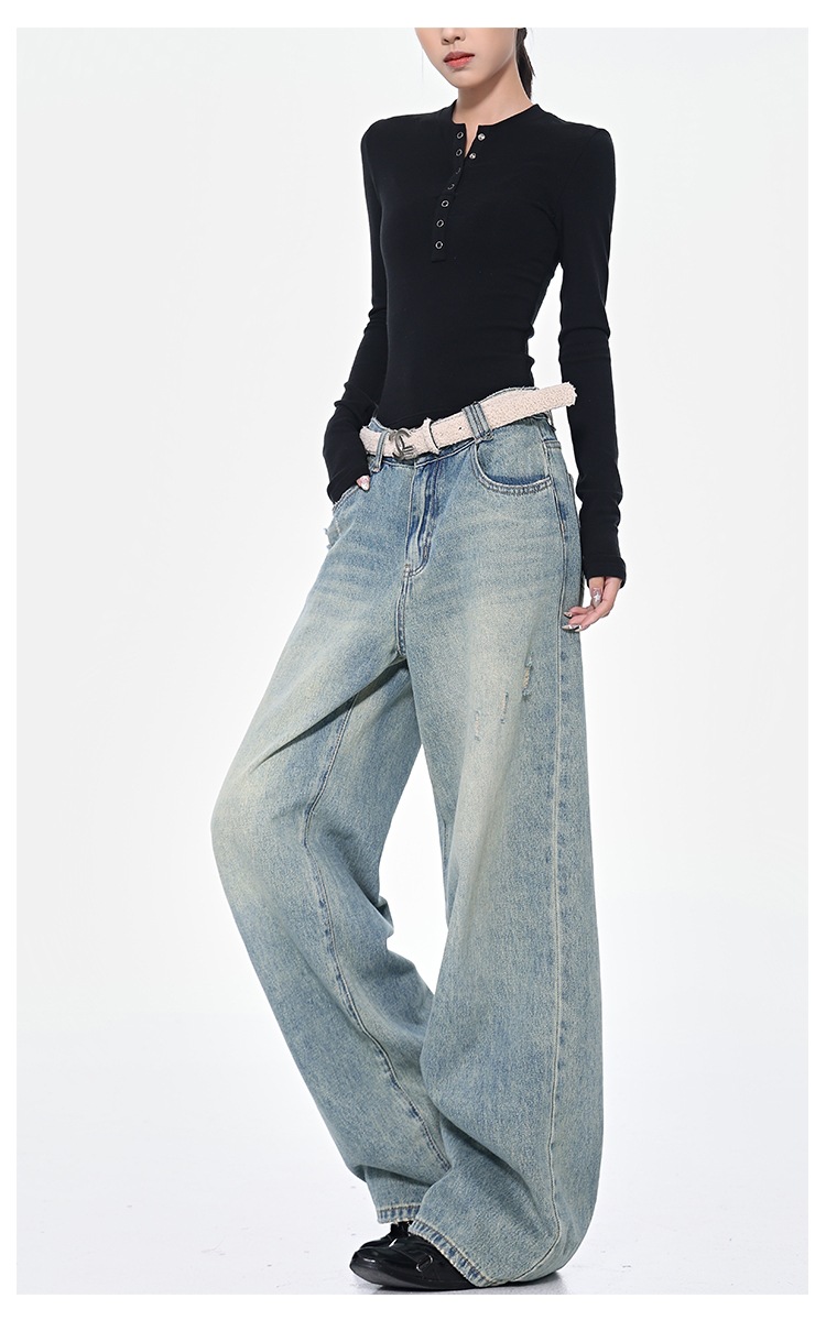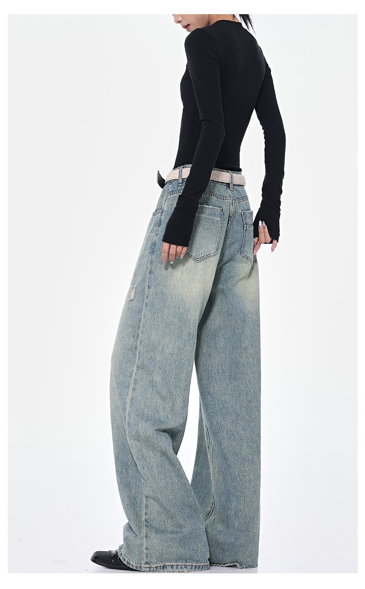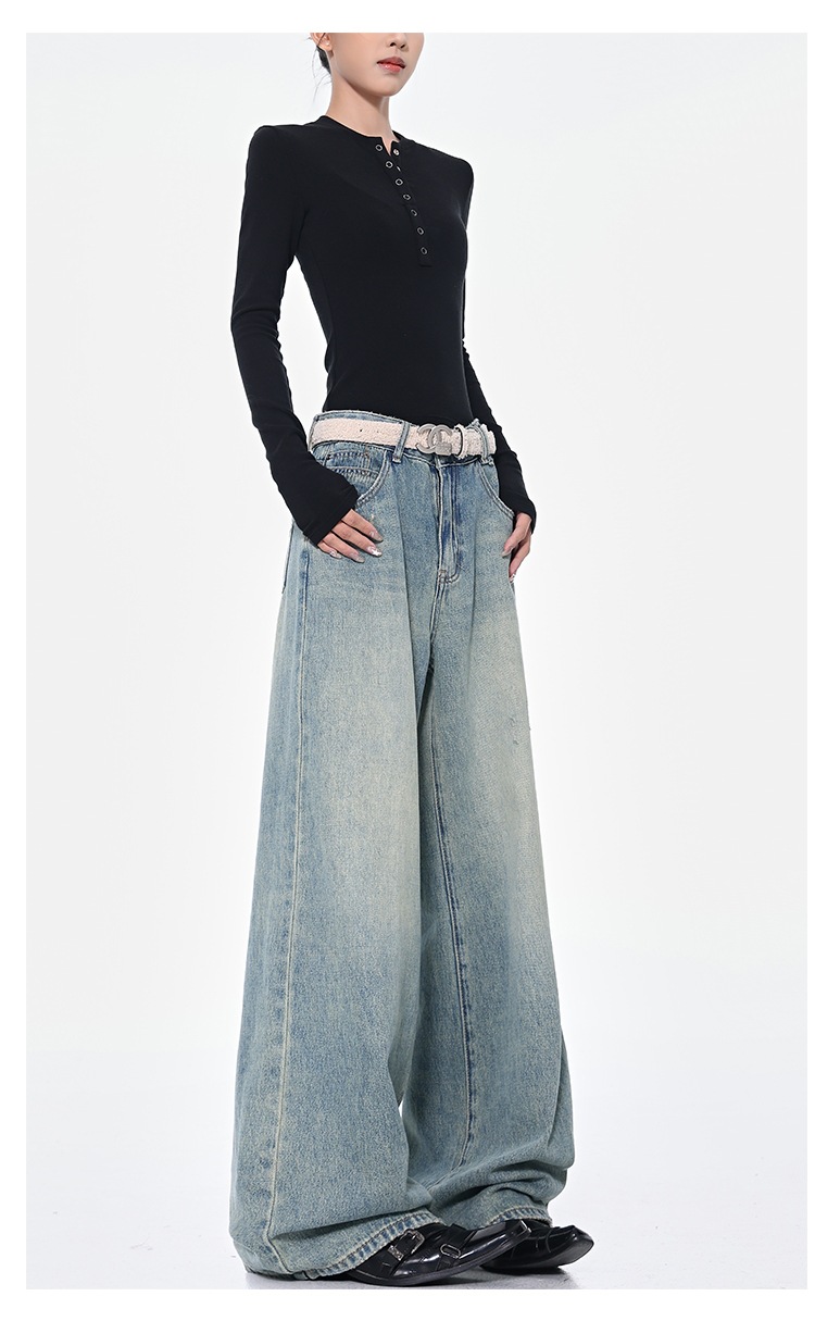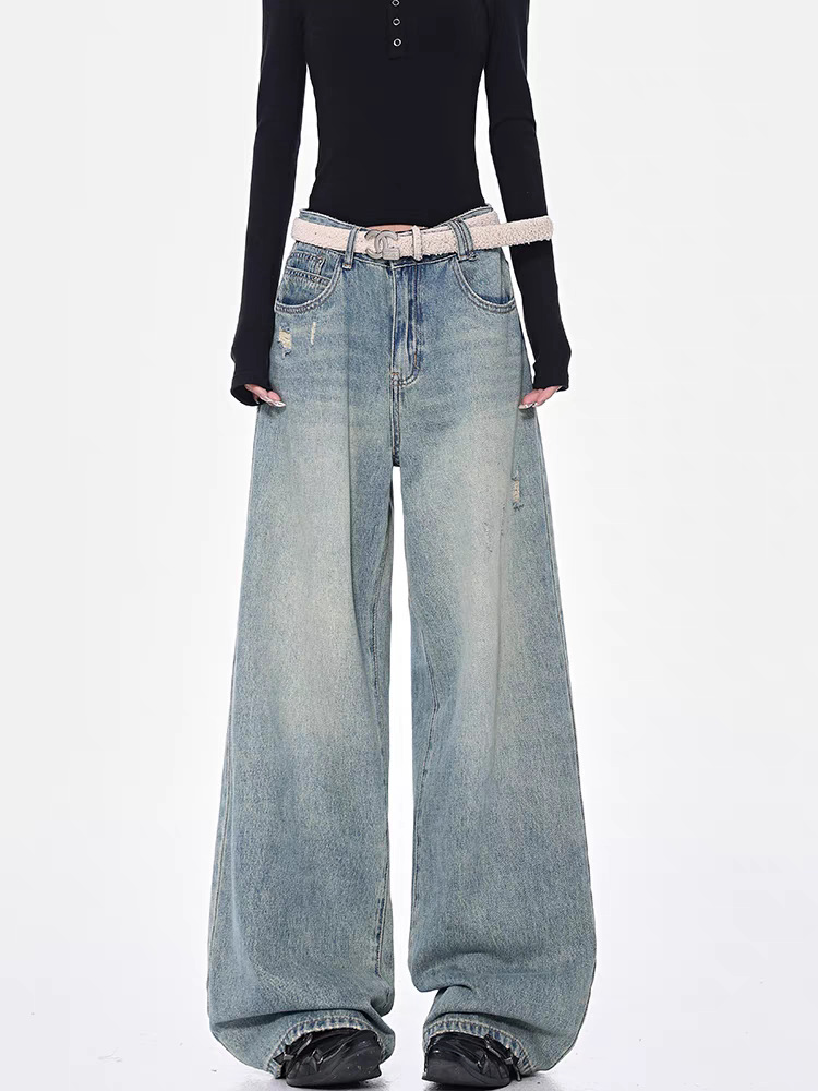 KEN STUDIO 아메리칸 스타일 레트로 블루 세탁 된 스트레이트 청바지 여성의 높은 허리 느슨한 슬림 넓은 다리 바지