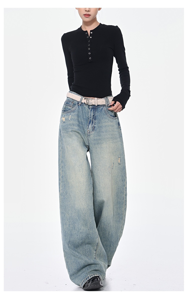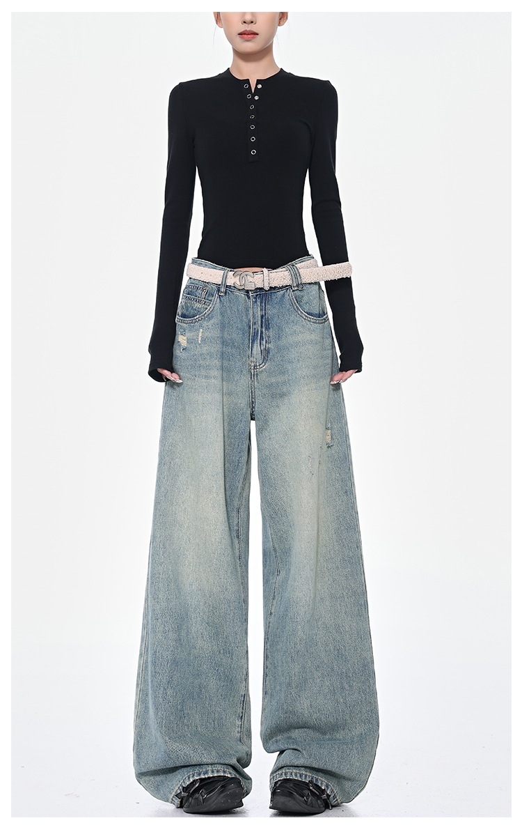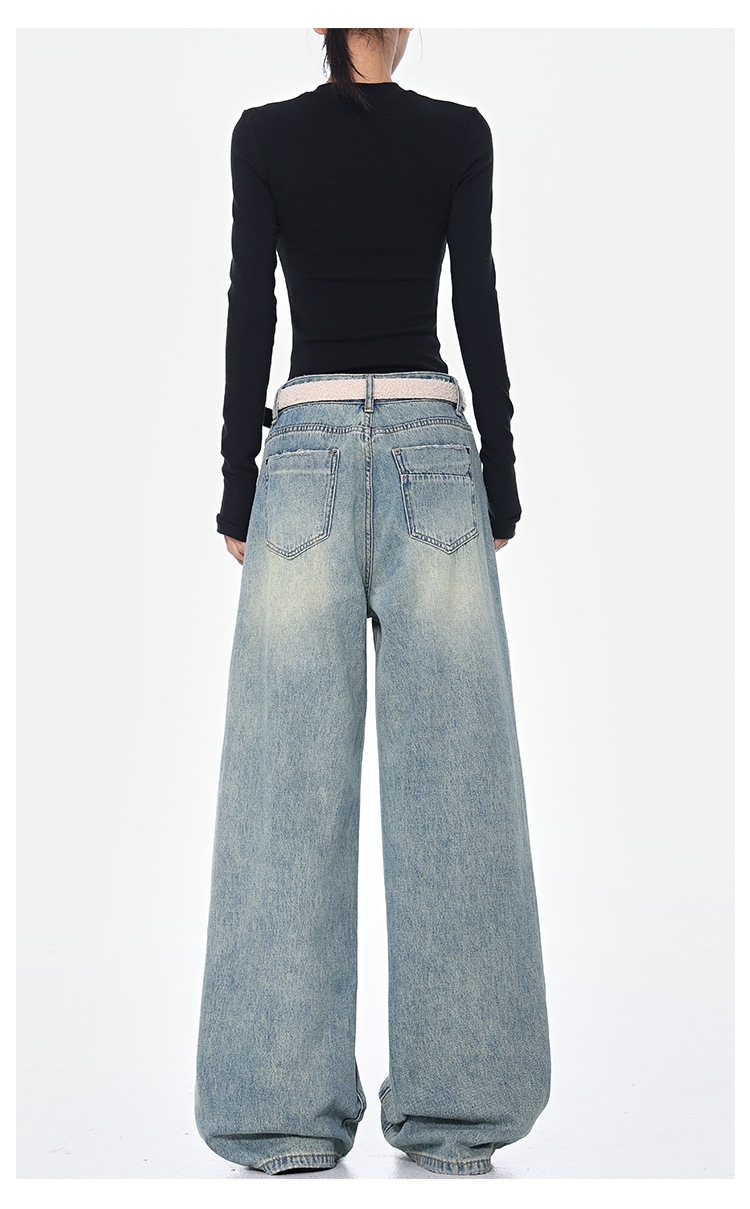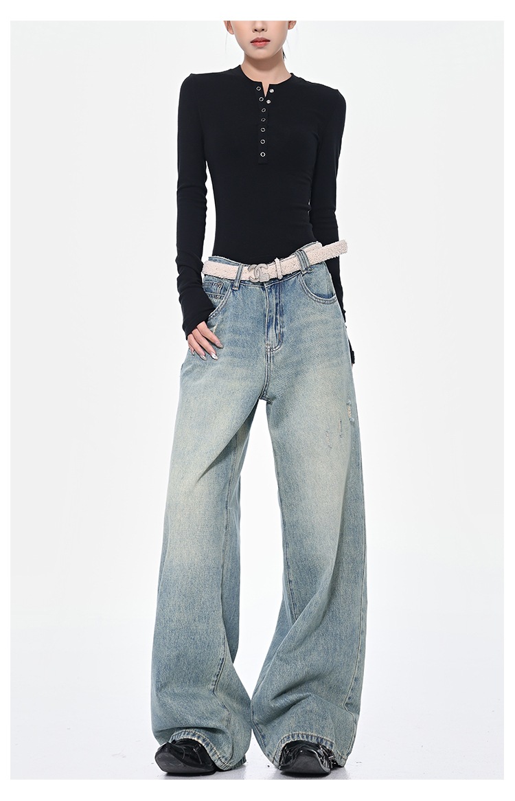 KEN STUDIO 아메리칸 스타일 레트로 블루 세탁 된 스트레이트 청바지 여성의 높은 허리 느슨한 슬림 넓은 다리 바지