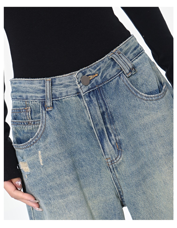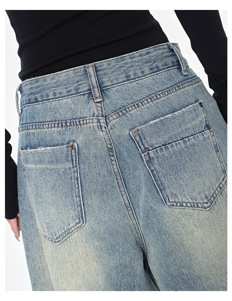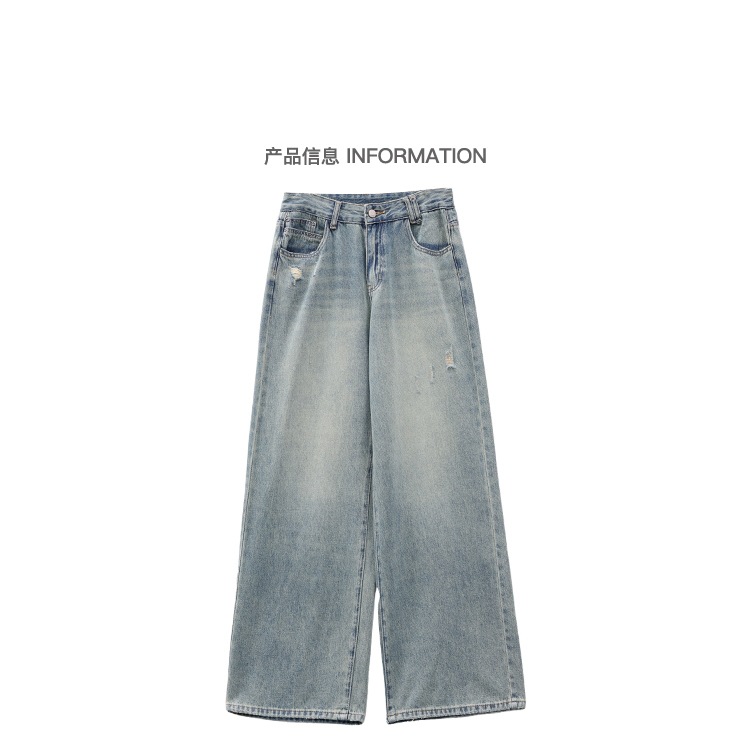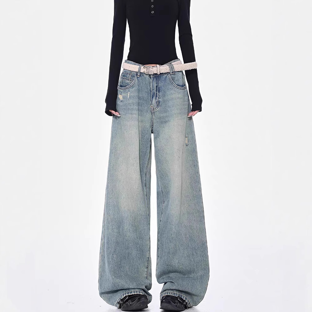 KEN STUDIO 아메리칸 스타일 레트로 블루 세탁 된 스트레이트 청바지 여성의 높은 허리 느슨한 슬림 넓은 다리 바지스토어 가기
