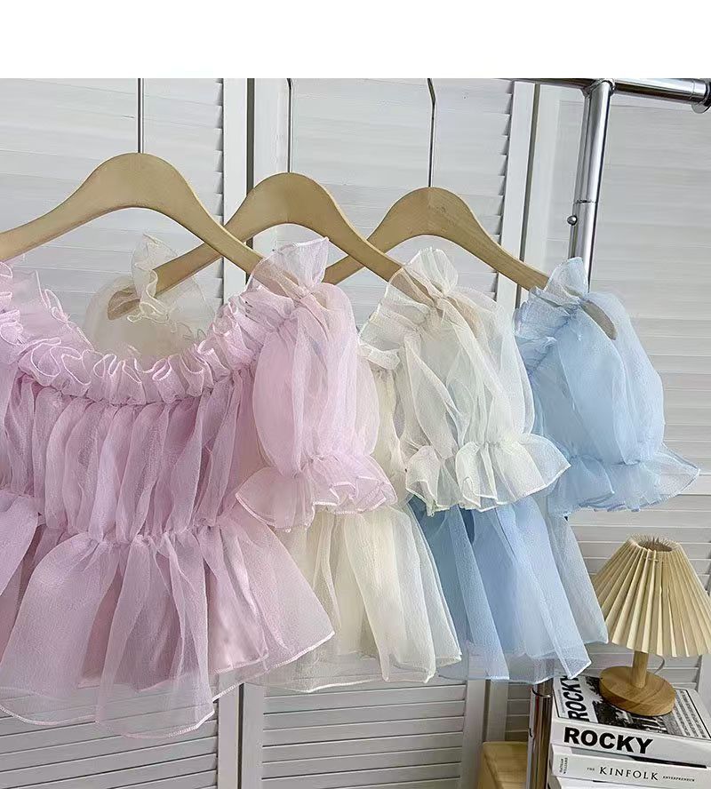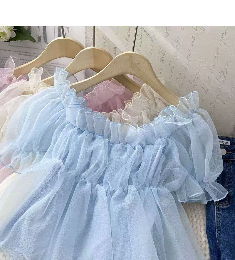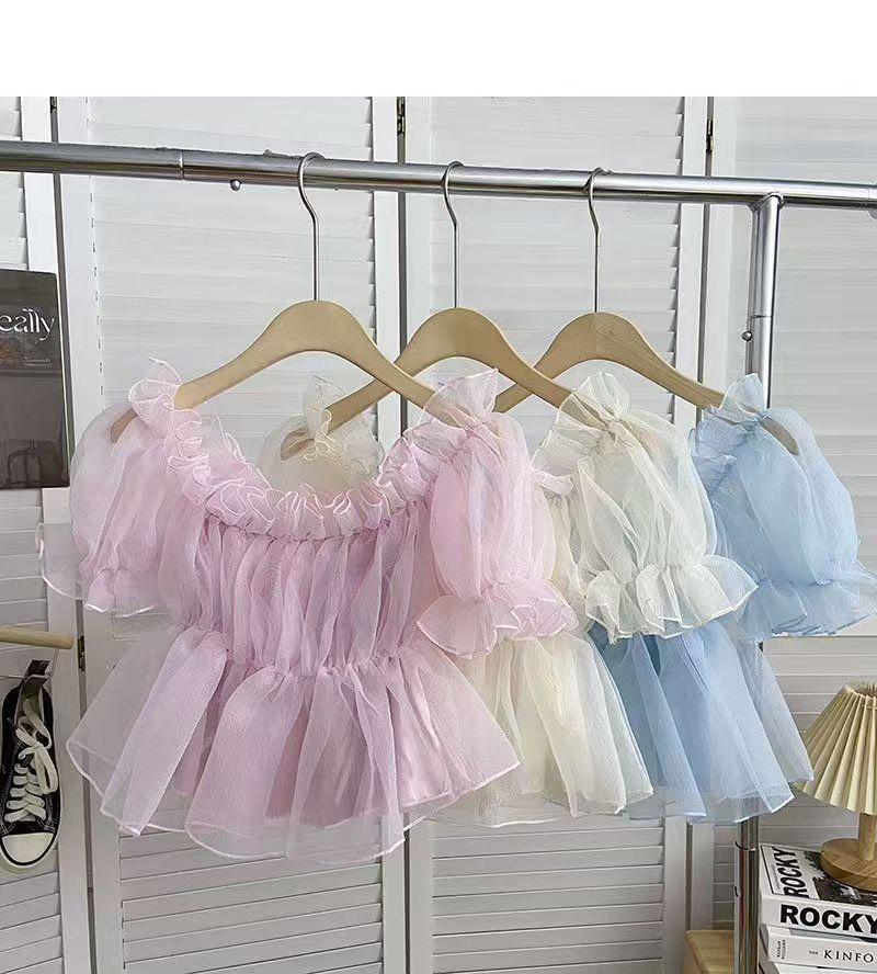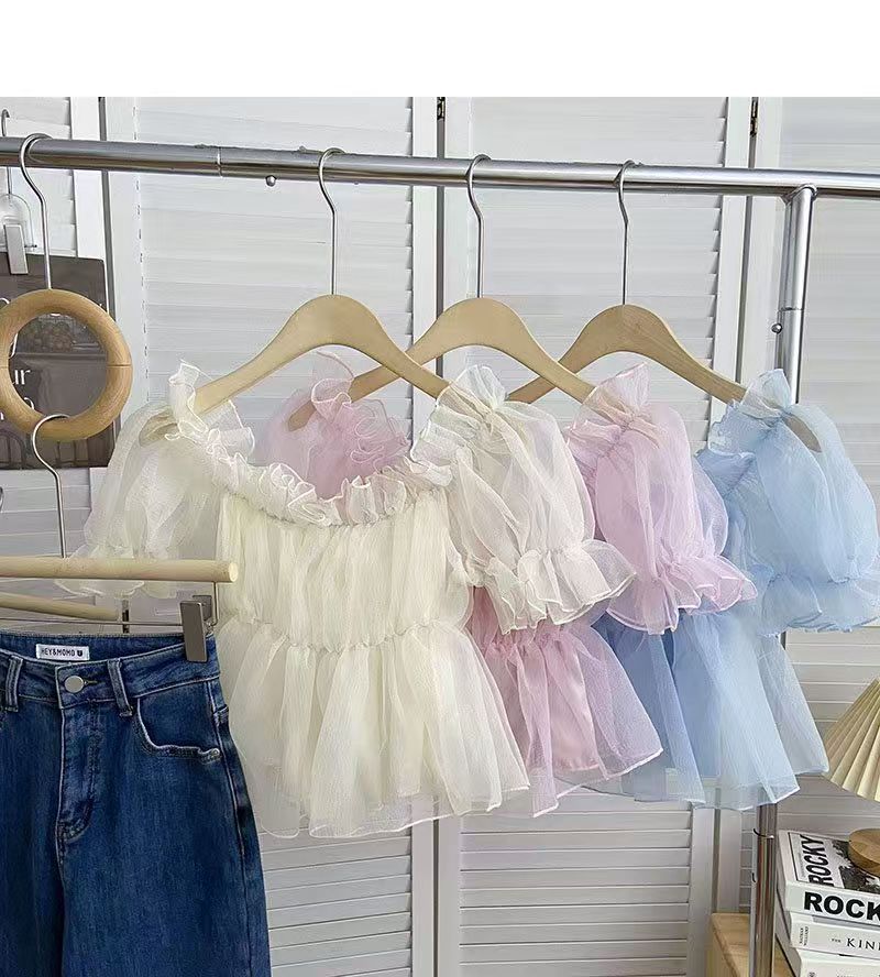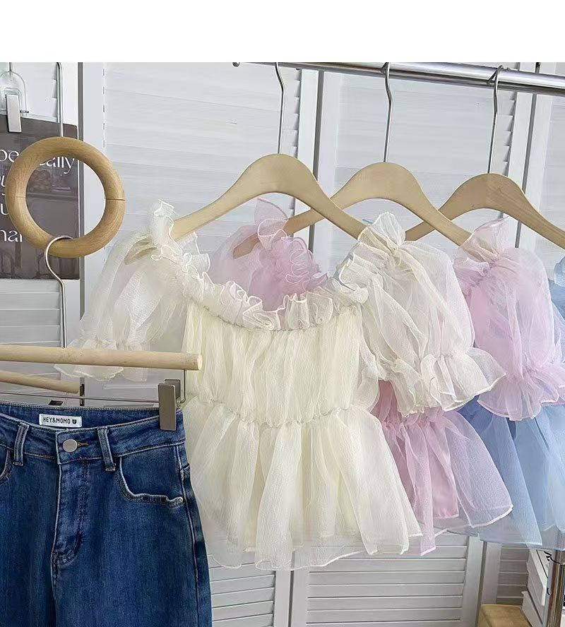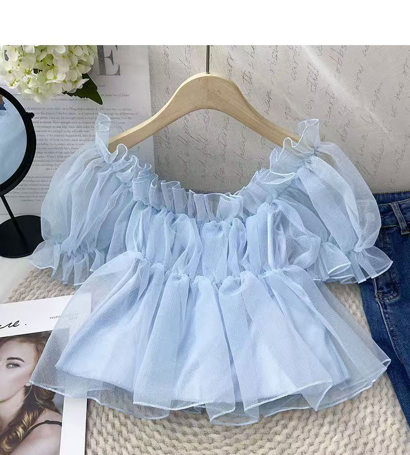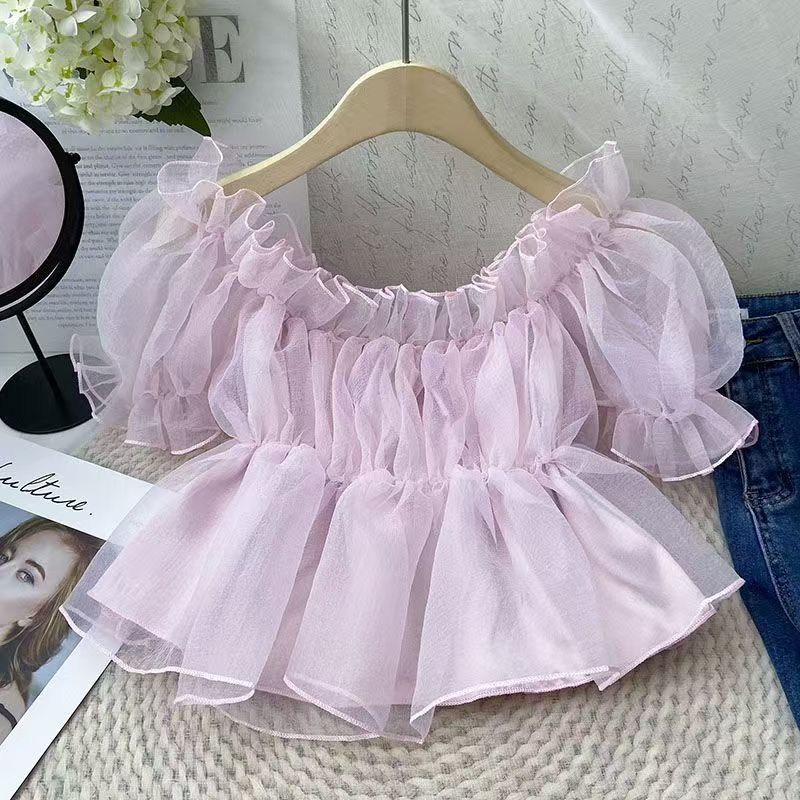 여성을위한 프렌치 스위트 퍼프 슬리브 짧은 꽃 무늬 쉬폰 셔츠 여름 2023 새로운 반팔 원 숄더 탑