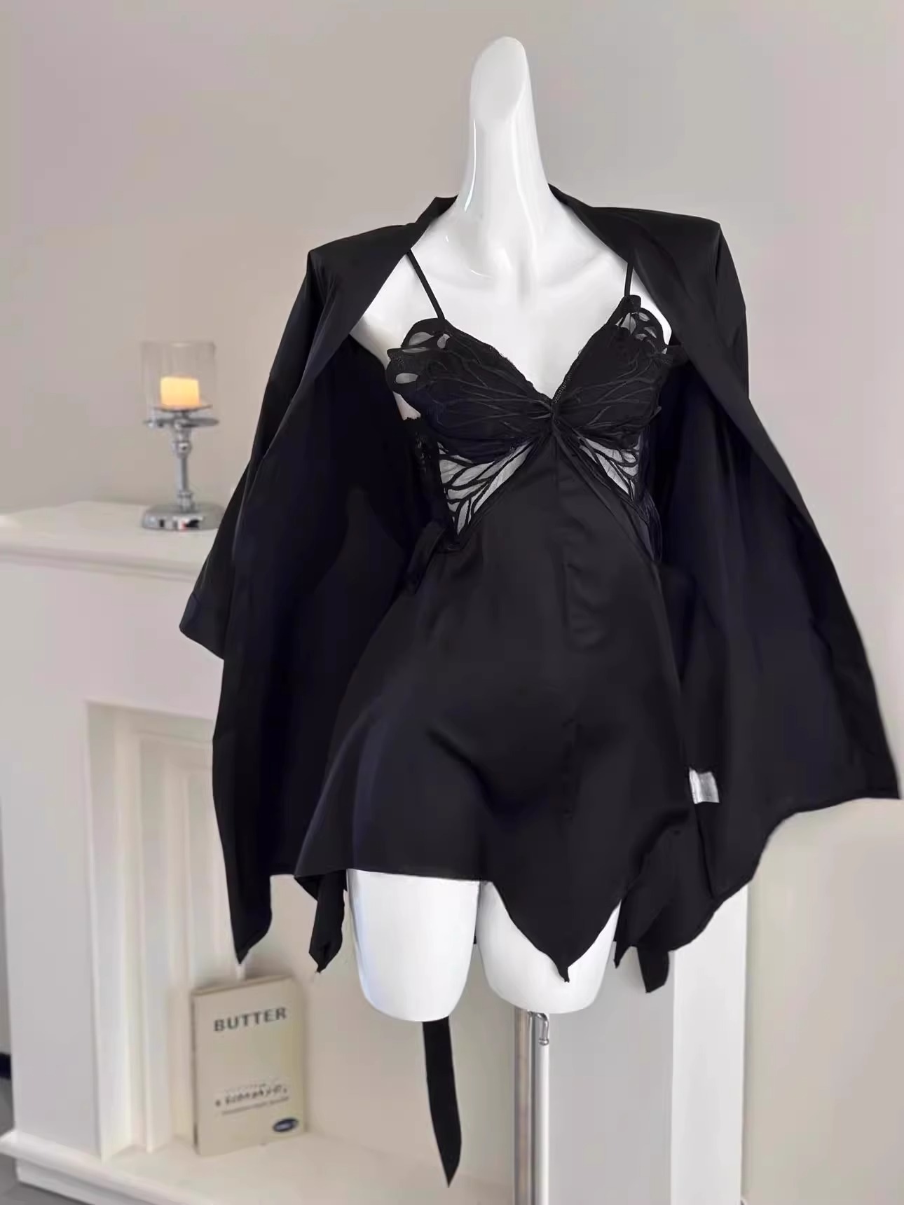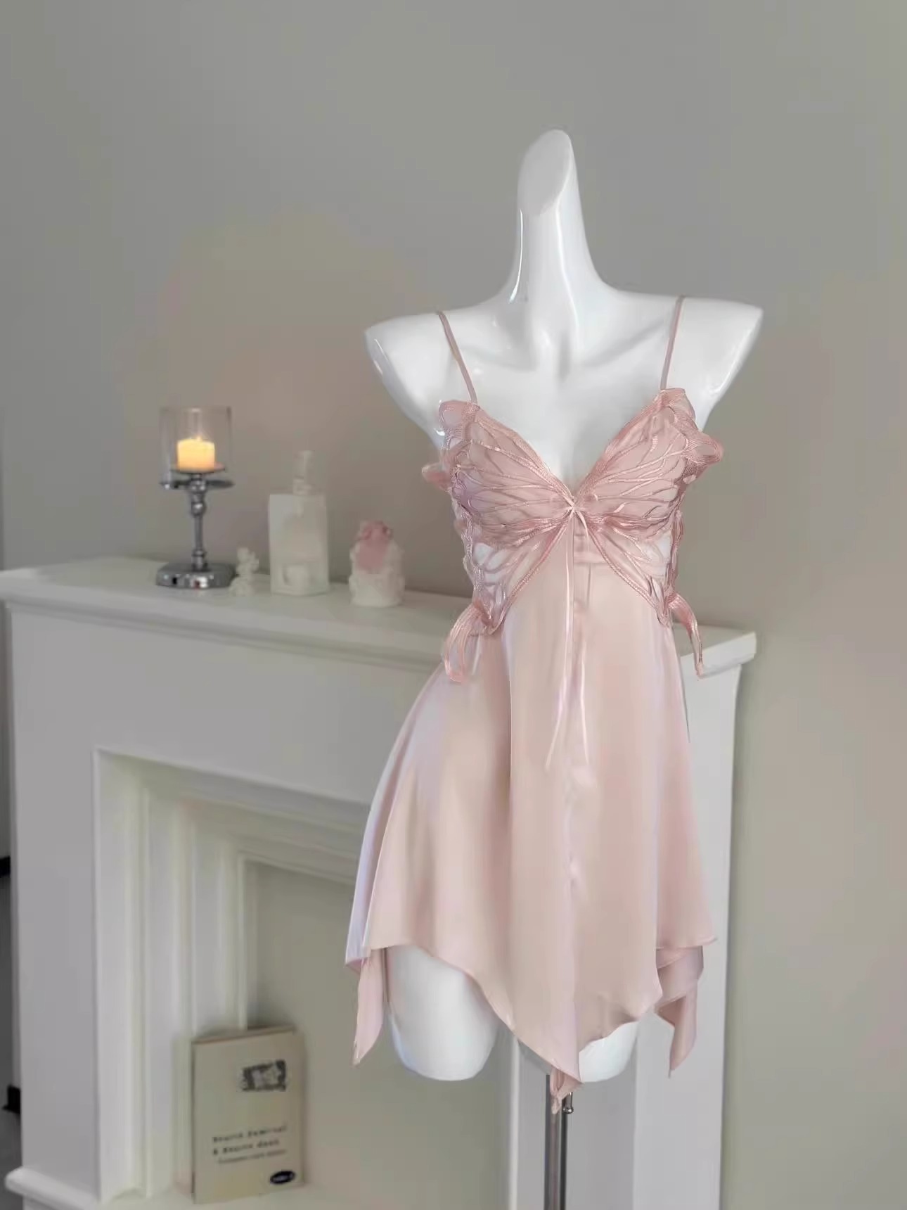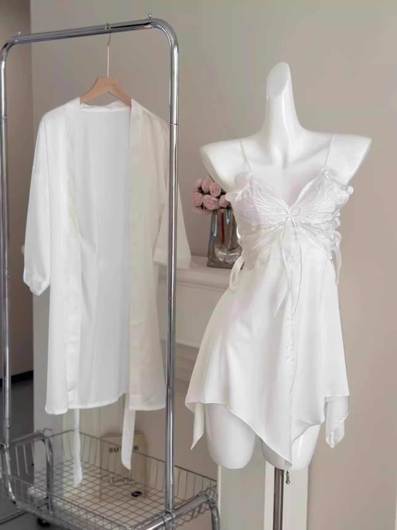 섹시한 여성용 잠옷 가을 겨울용 끈이 있는 아이스 실크 신상품 순수한 매력 스타일 투피스 세트 가슴 패드 포함 백리스 고급 잠옷스토어 가기