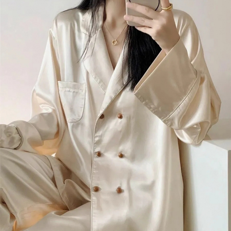 프랑스 스타일의 하이 엔드 아이스 실크 파자마 여성의 봄과 여름 새로운 Ins 스타일 긴 소매 바지 간단한 캐주얼 홈 의류 세트스토어 가기