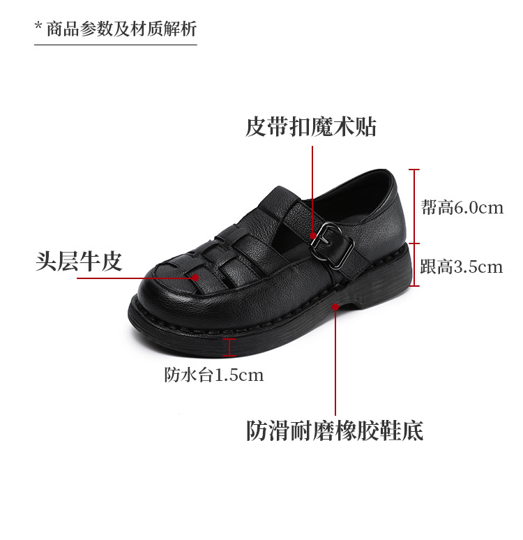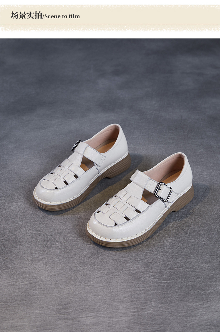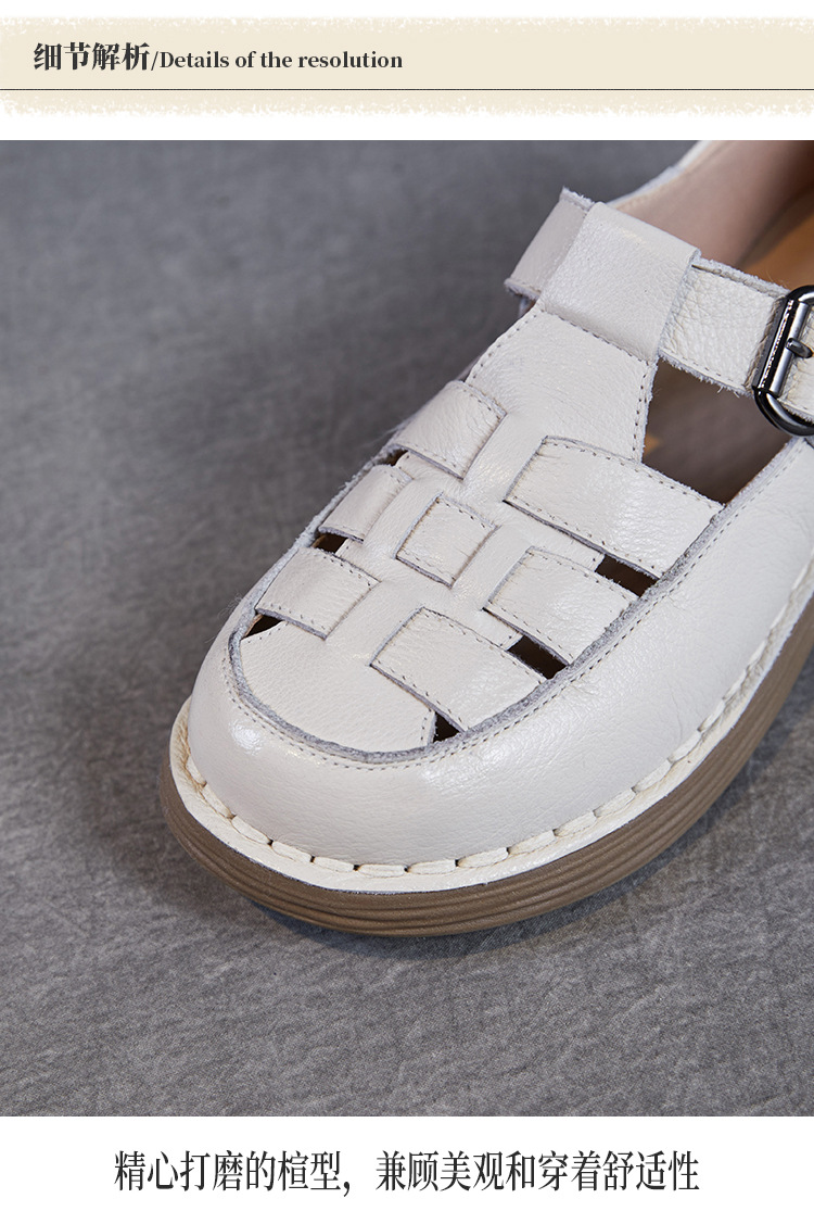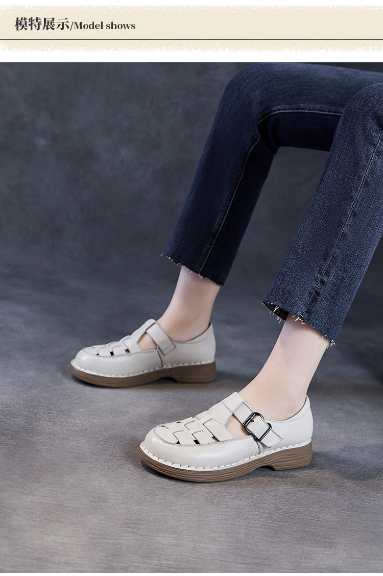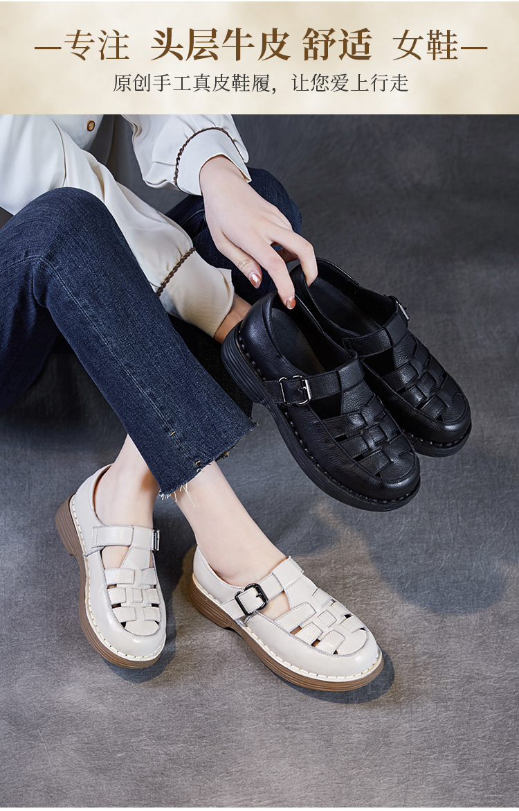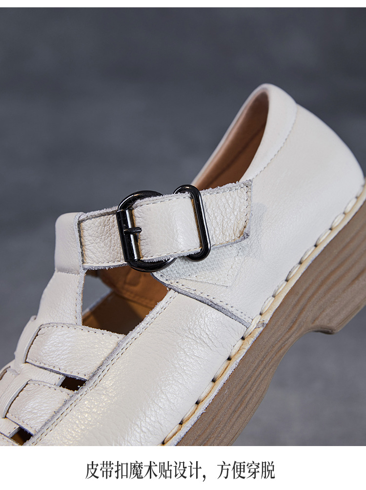 정품 가죽 짠 돼지 케이지 신발 여성 봄과 여름 2025 새로운 라운드 헤드 할로우 플랫 캐주얼 벨크로 탑 로마 샌들