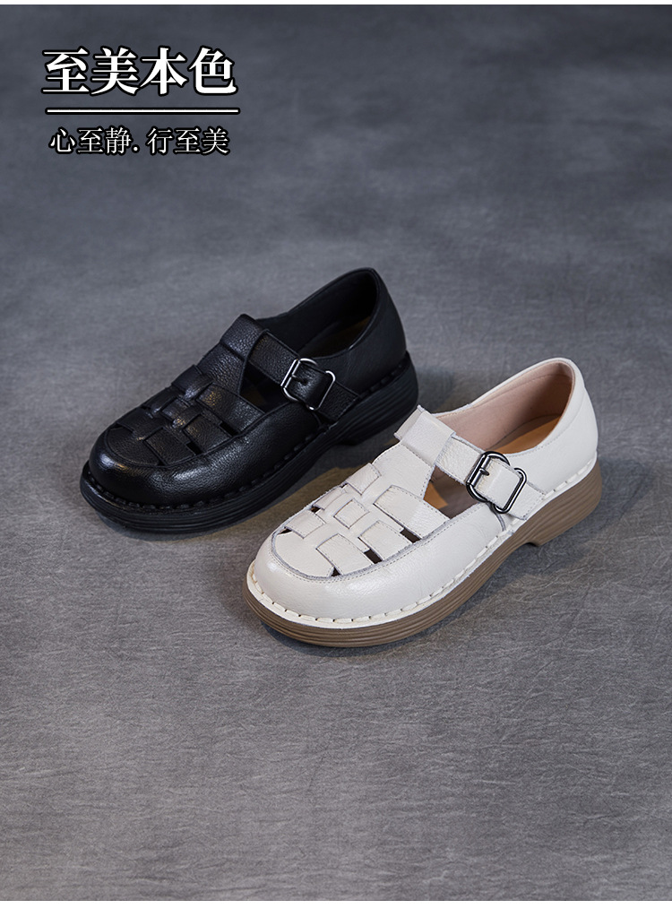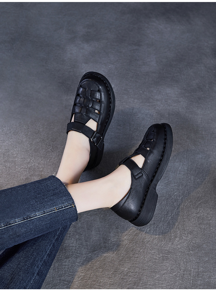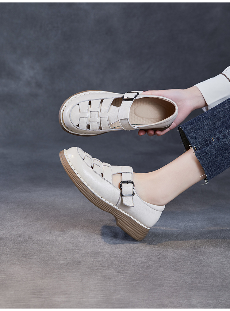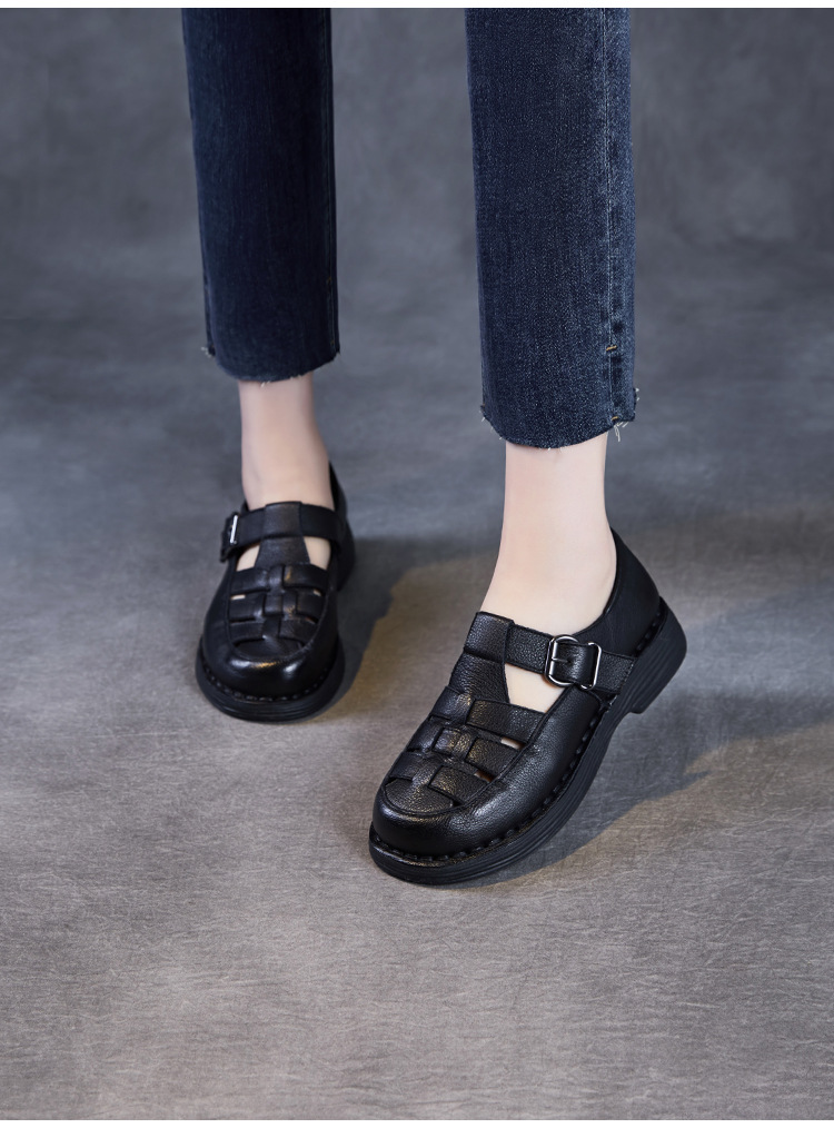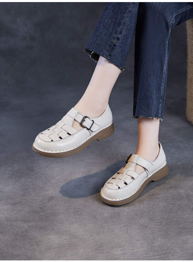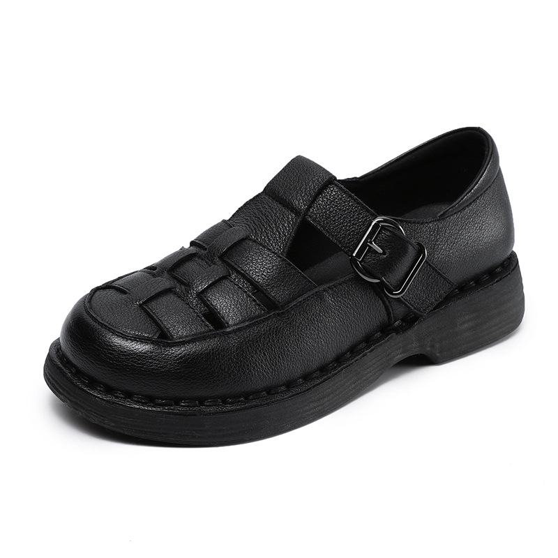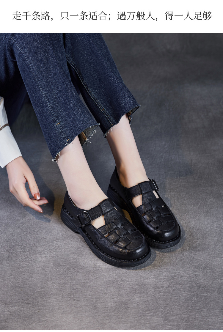 정품 가죽 짠 돼지 케이지 신발 여성 봄과 여름 2025 새로운 라운드 헤드 할로우 플랫 캐주얼 벨크로 탑 로마 샌들