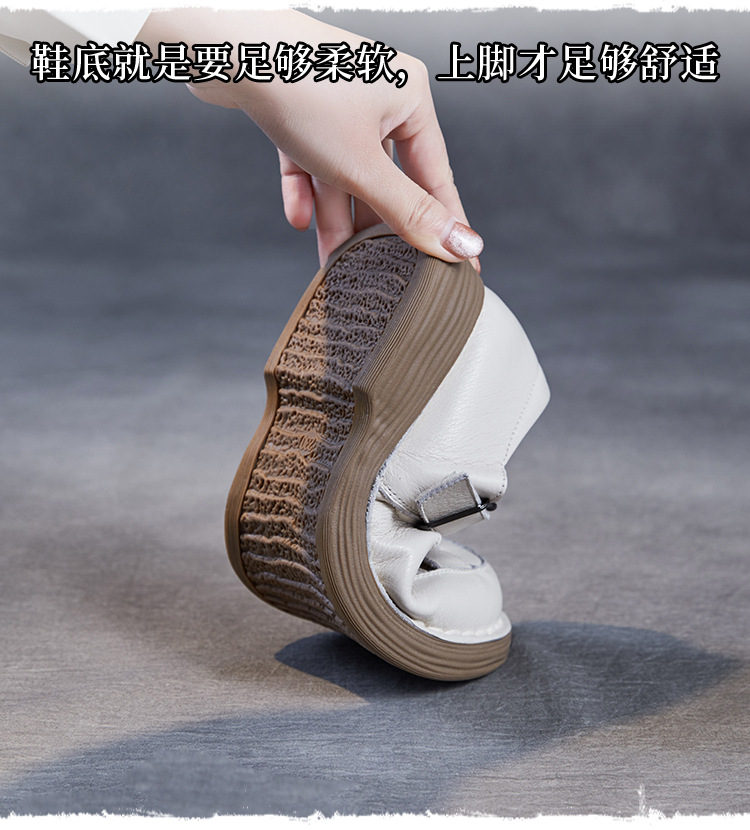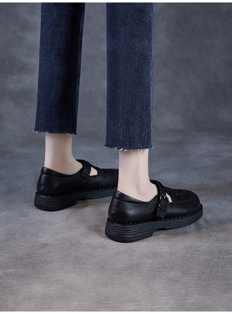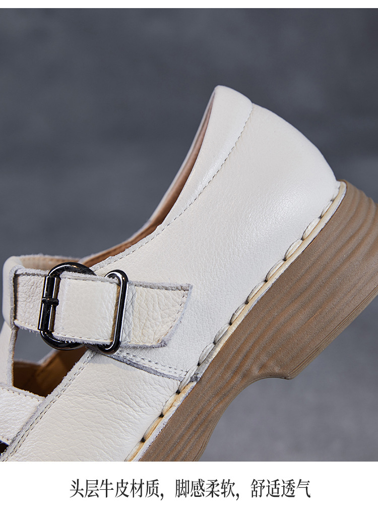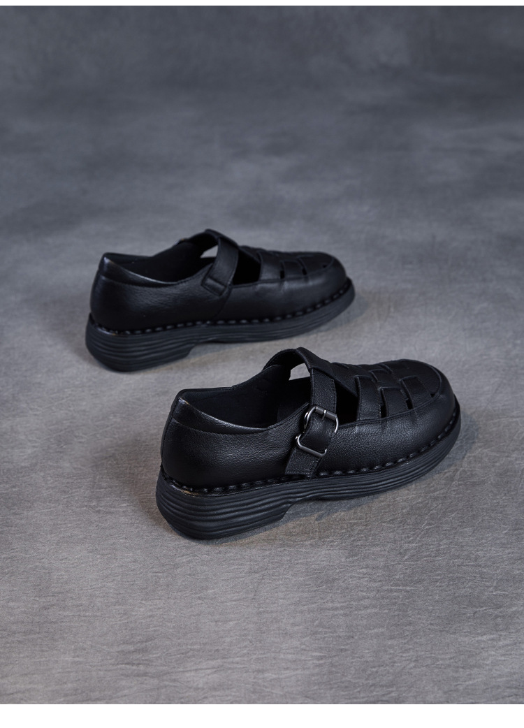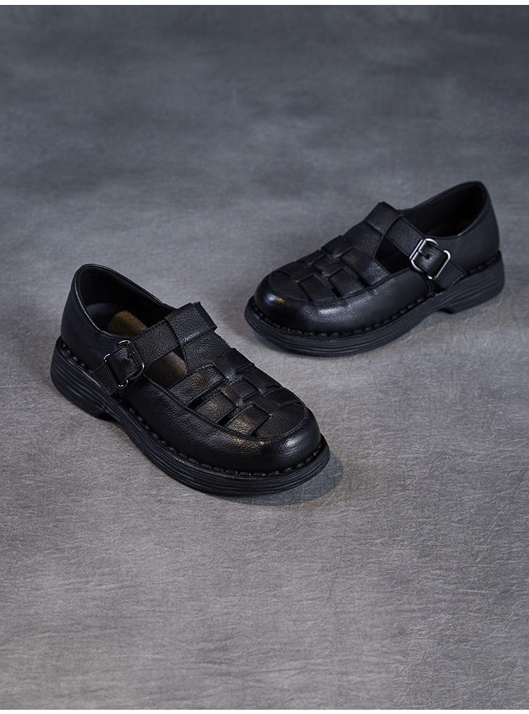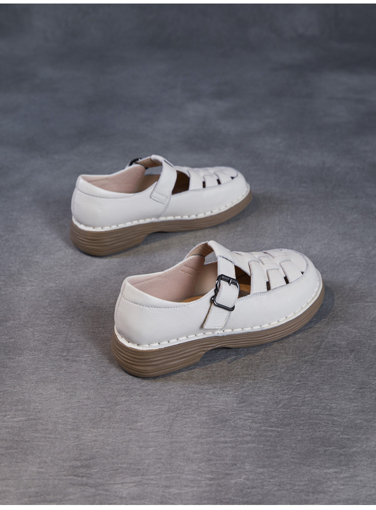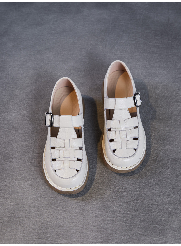정품 가죽 짠 돼지 케이지 신발 여성 봄과 여름 2025 새로운 라운드 헤드 할로우 플랫 캐주얼 벨크로 탑 로마 샌들