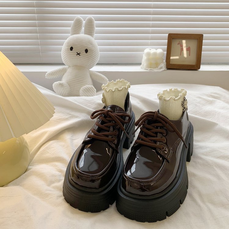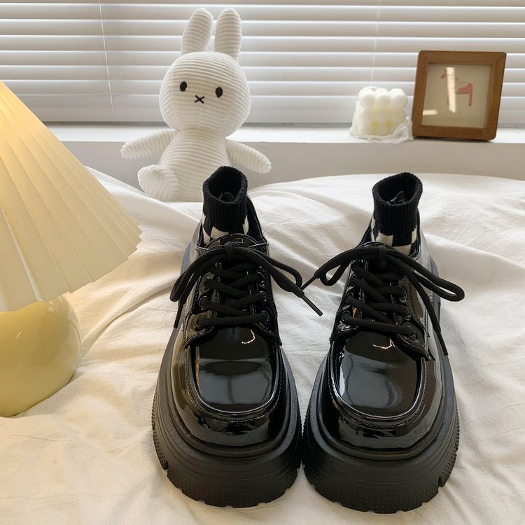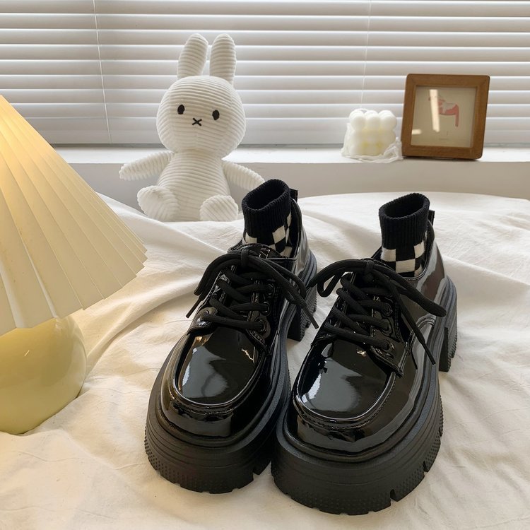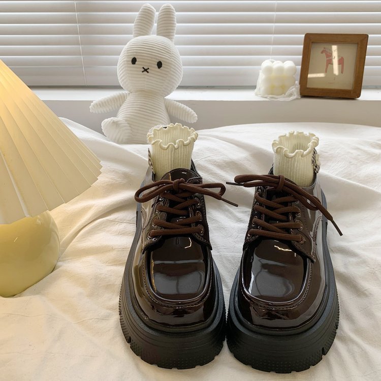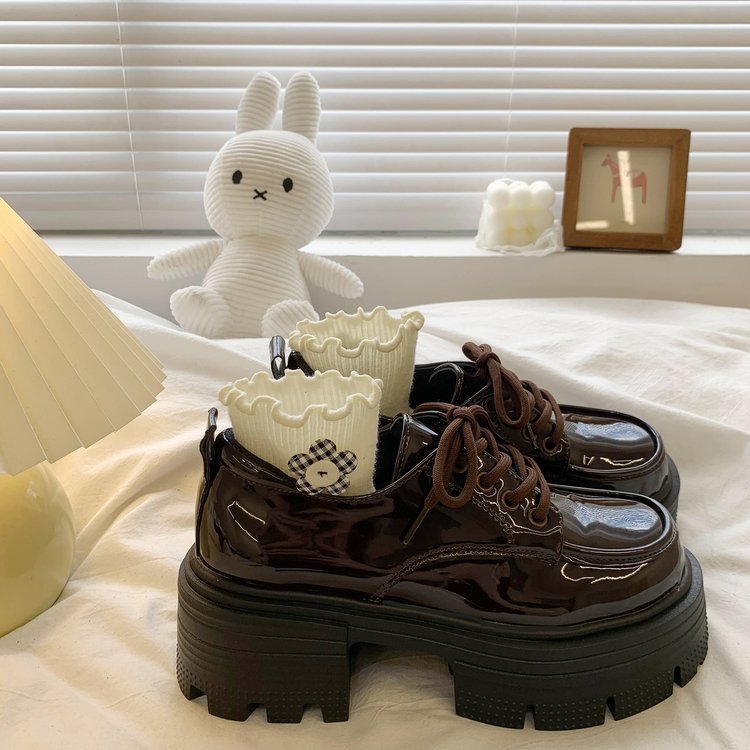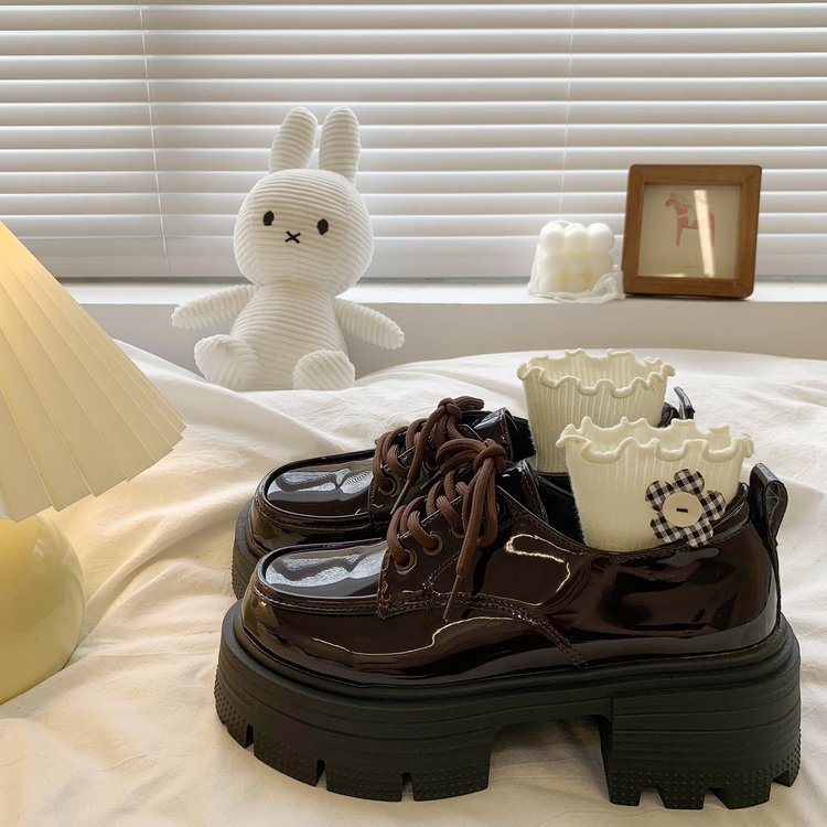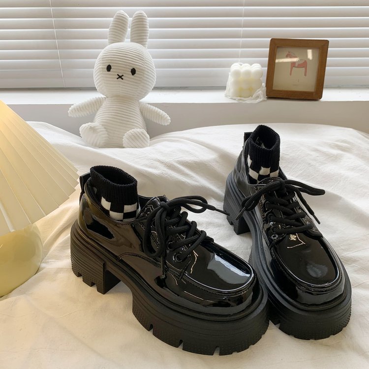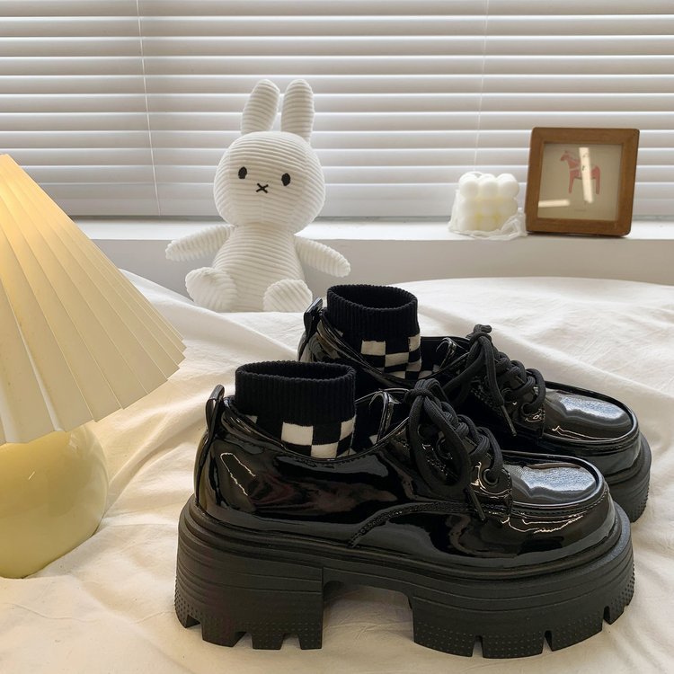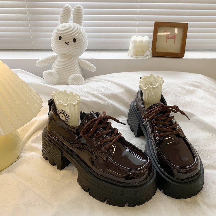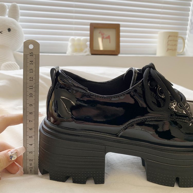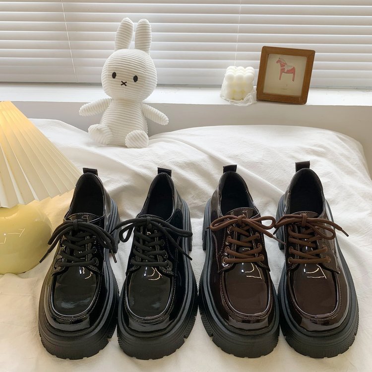 여성을위한 영국 스타일의 작은 가죽 신발 두꺼운 밑창 로퍼 2025 봄 새로운 특허 가죽 라운드 하이힐 두꺼운 굽 레이스 업