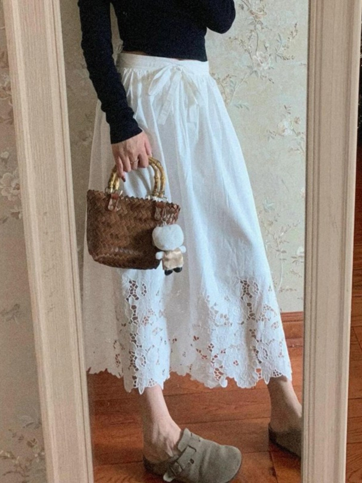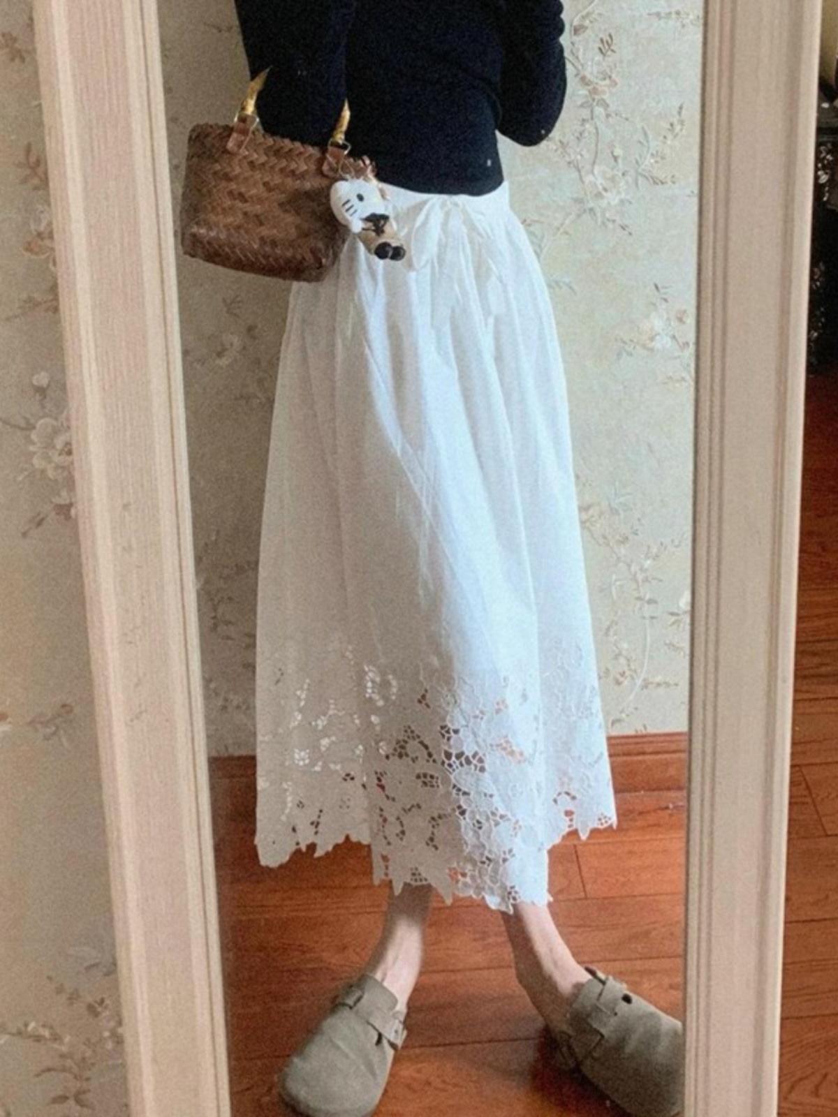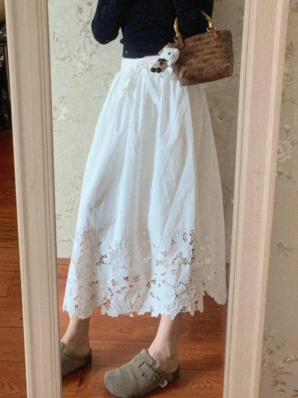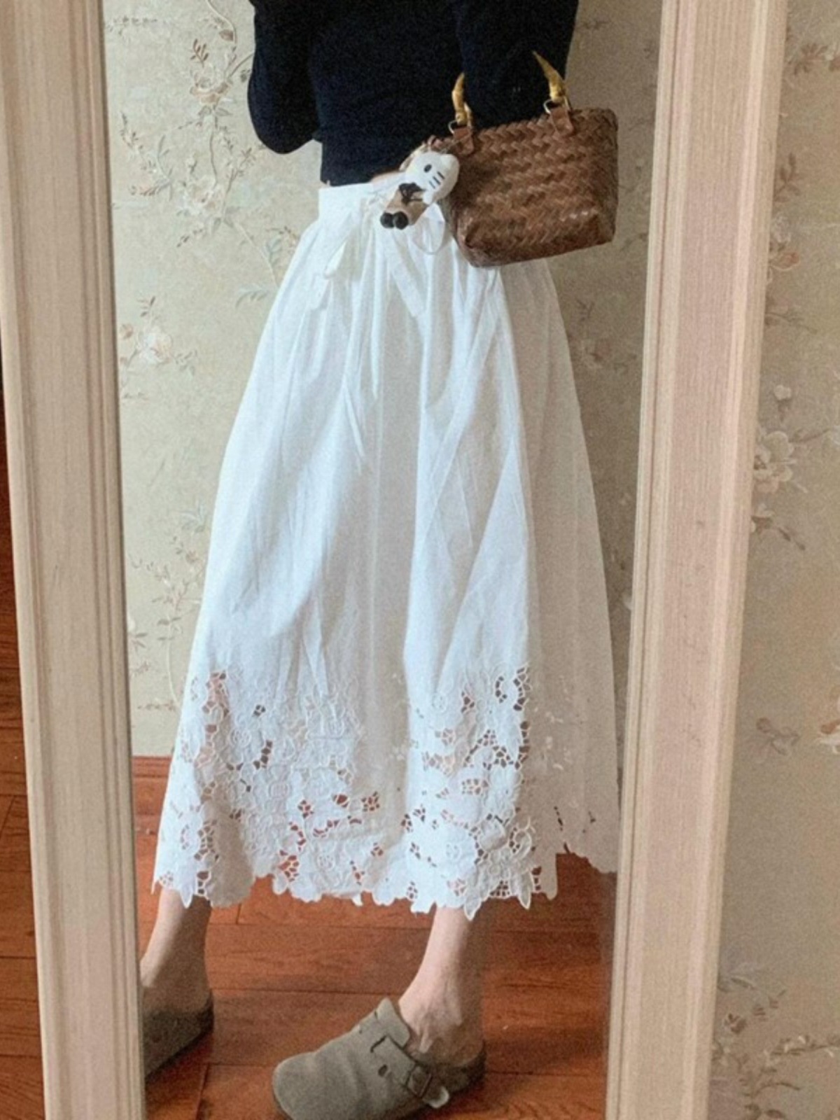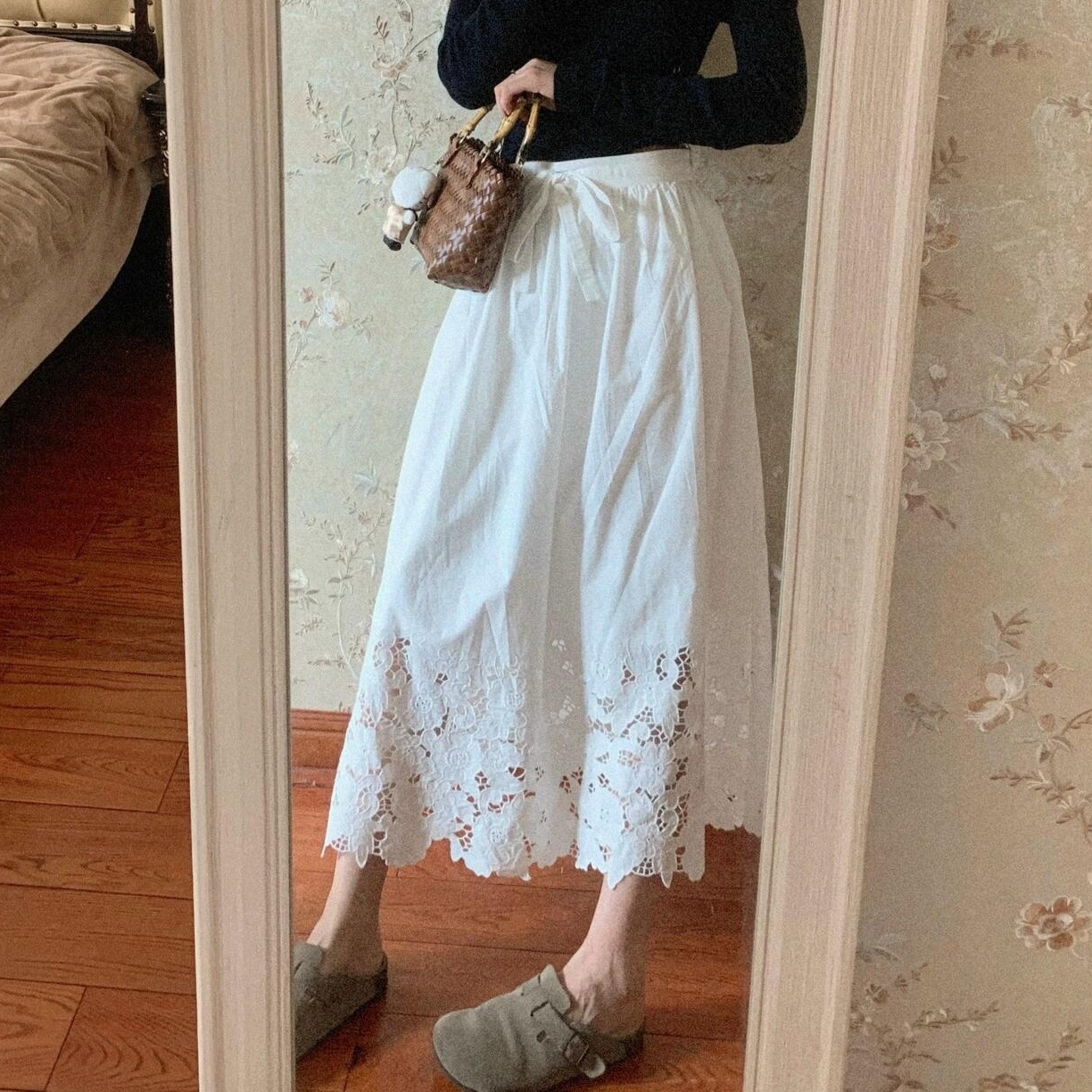 여성을위한 프렌치 화이트 레이스 중공 스커트 2025 봄 새로운 스타일 하이 웨이스트 커버 엉덩이 슬리밍 서양식 a 라인 롱 스커트