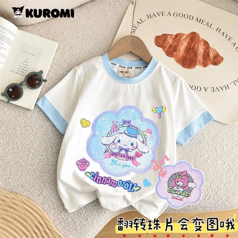 소녀 여름 플립 페이스 변경 패턴 캐주얼 착용 중식 및 빅 키즈 소녀 퓨어 코튼 탑을위한 반팔 스퀸 색상 변경 티셔츠스토어 가기
